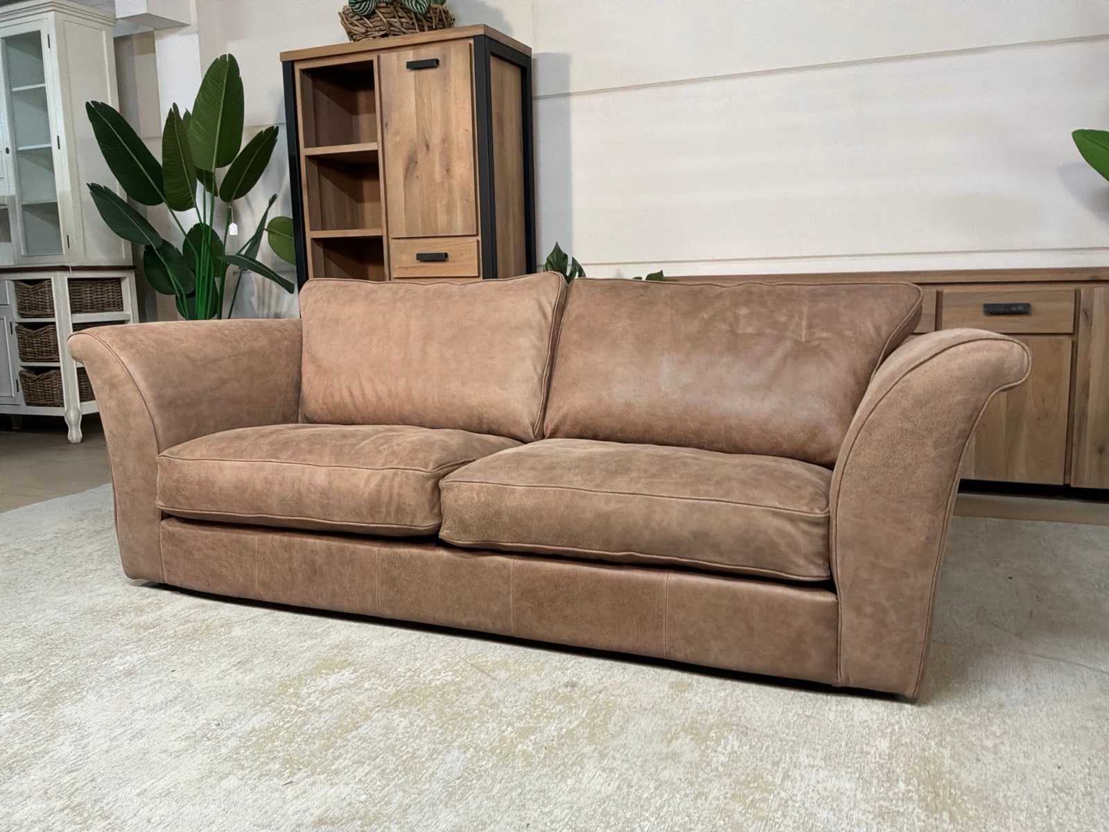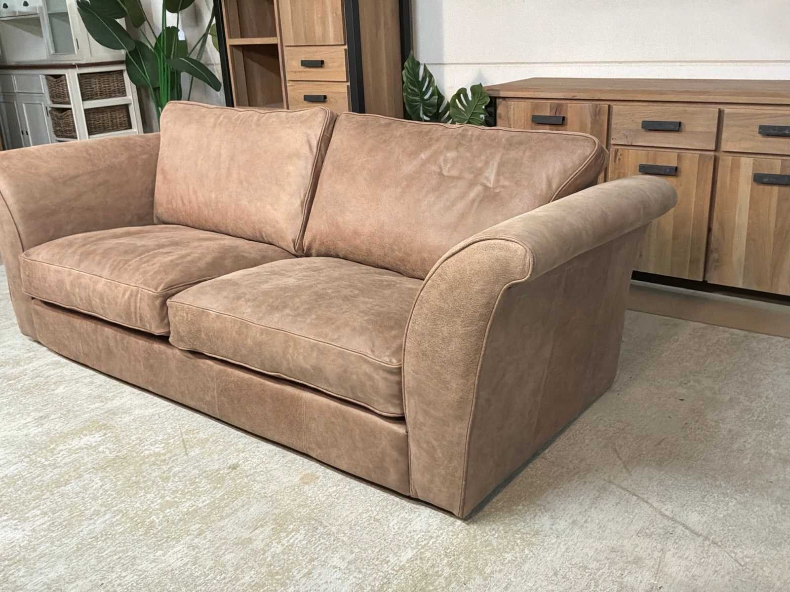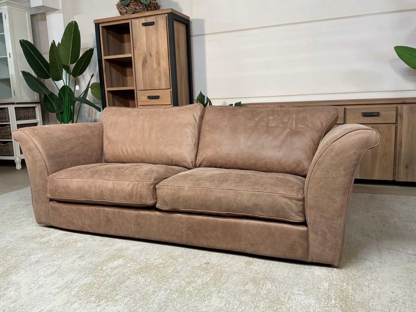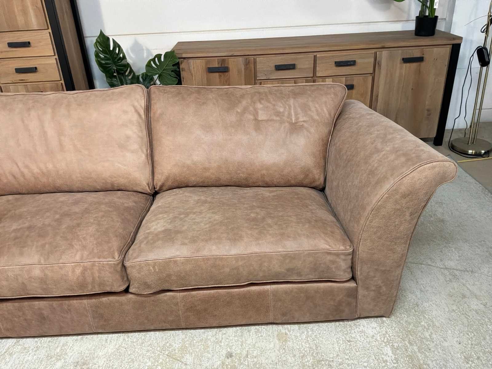 Mist 1 pootje. Model: Savannah Kleur: Bruin Lengte: 95cm Breedte: 220cm Hoogte: 75cm Materiaal: Geborsteld leer