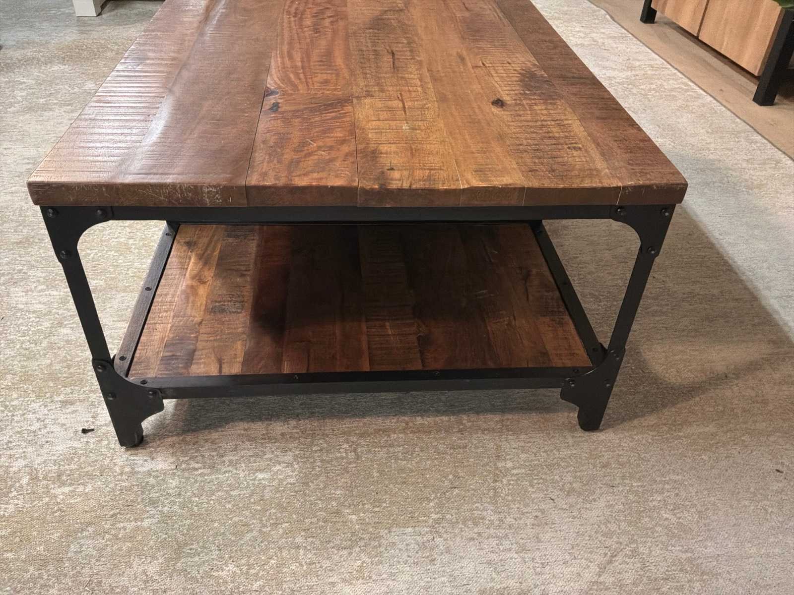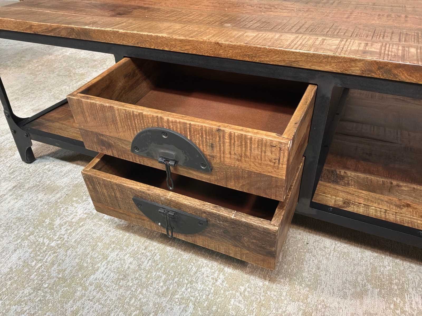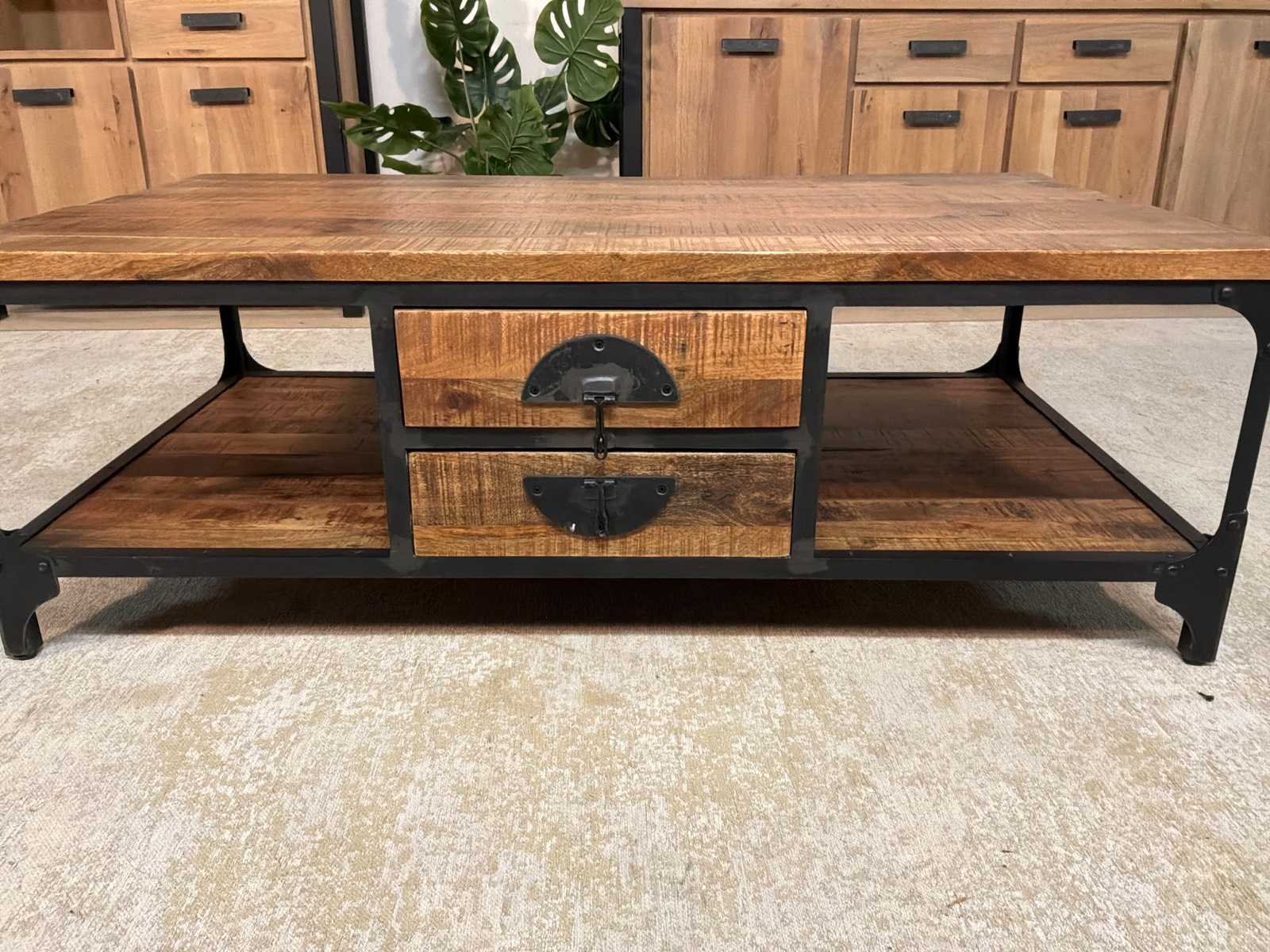 Zware uitvoering, Salontafel is voorzien van lades aan beide kanten Model: Texas Lengte: 135cm Breedte: 76cm Hoogte: 45cm Materiaal: Hout en ijzer