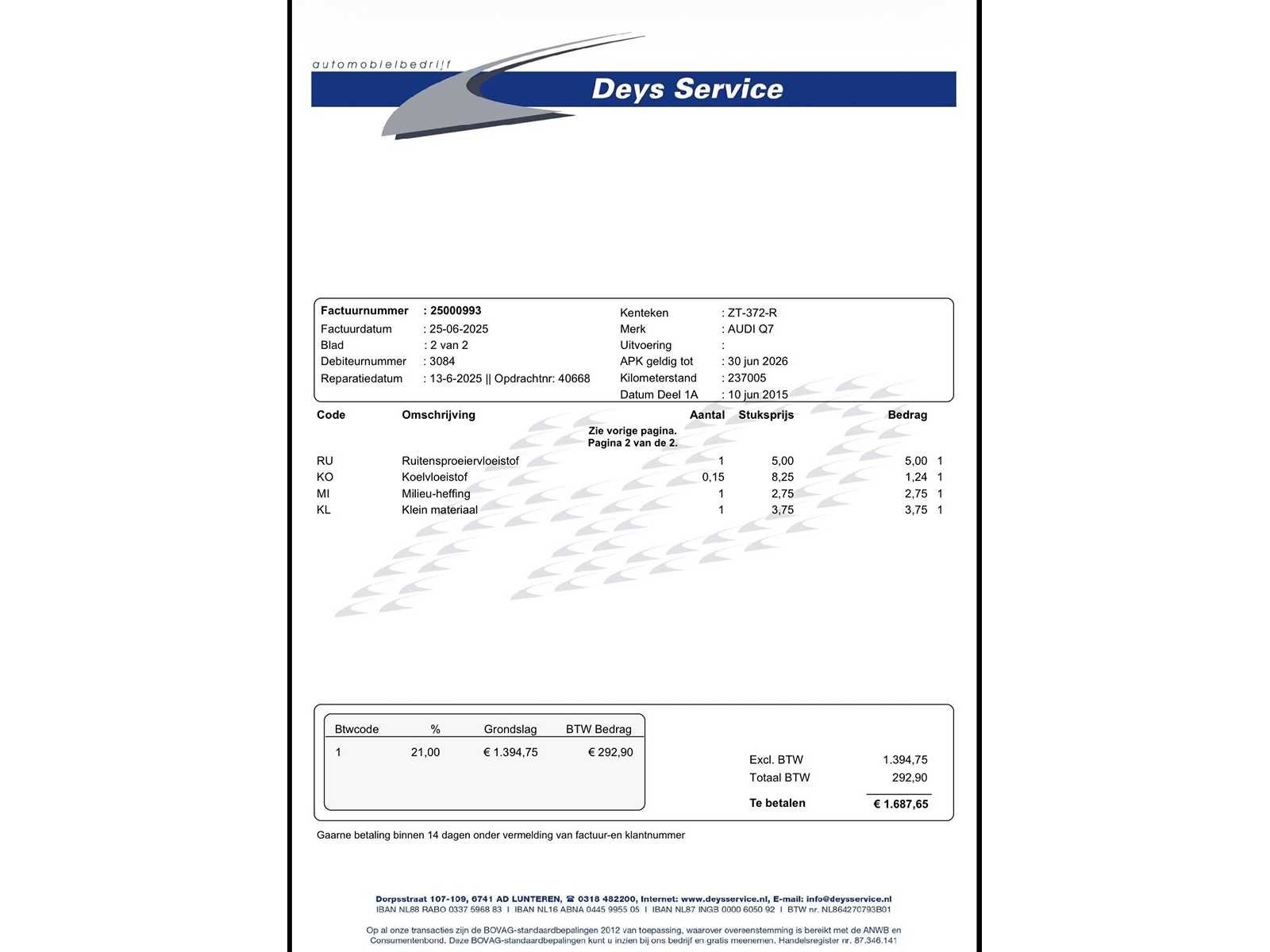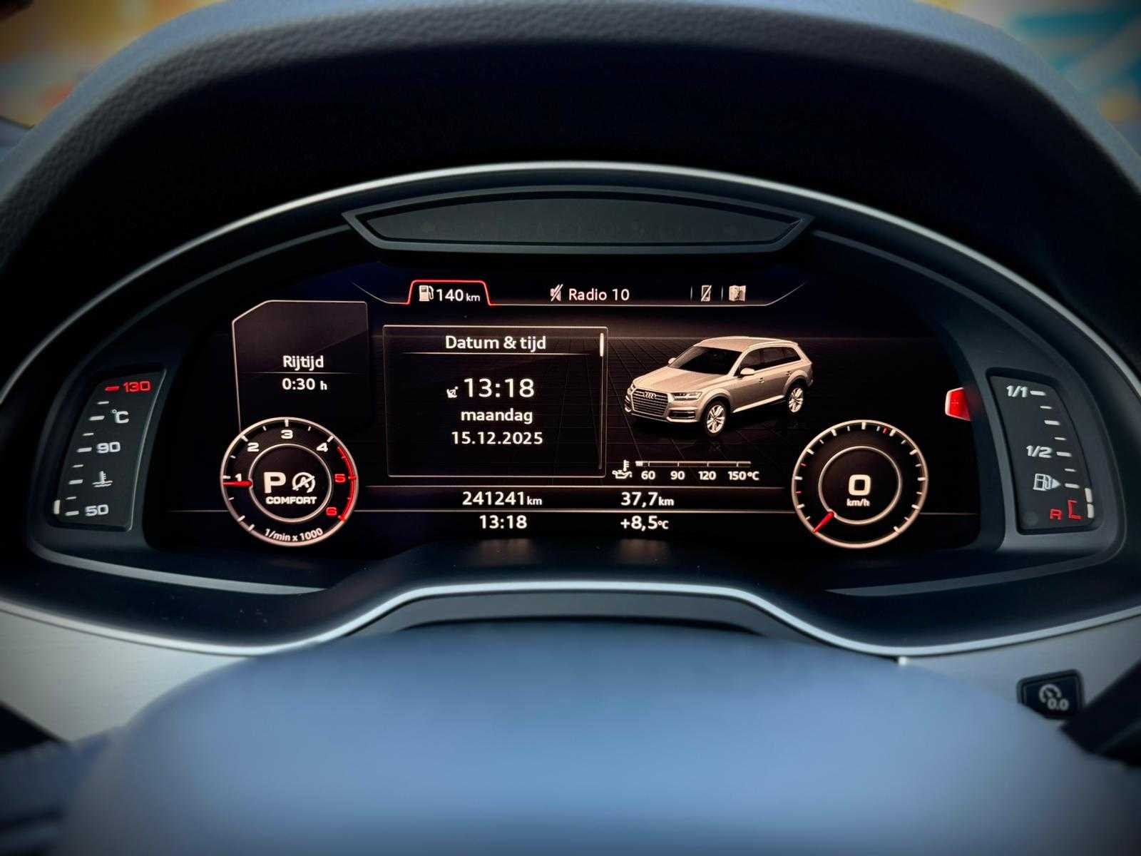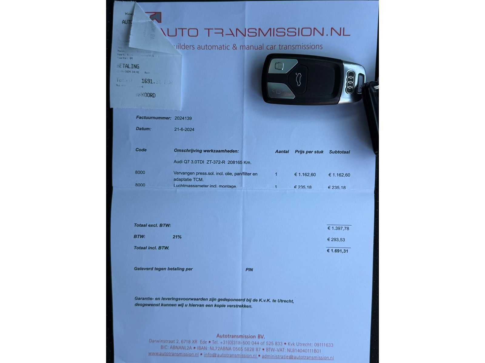 Omdat dit kavel niet in Spijkenisse staat moet u ons een mail, info@collectcars.nl sturen dan krijgt u van ons het adres. Vermeld wel het veilingnummer en kavelnummer zodat het voor ons makkelijker zoeken is. Alvast bedankt Kenteken: ZT-372-R Merk: Audi Model: Q7 Type: 3.0 TDI V6 Quattro S-line Pro Line+ 7p ZT-372-R Afgelezen kilometerstand: 241984km Cilinderinhoud: 2967cc Vermogen (kW): 200kW Brandstof: Diesel Chassisnummer: WAUZZZ4M2GD001701 Datum eerste toelating: 2015-06-10 Datum eerste toelating (NL): 2019-08-16 APK vervaldatum: 2026-06-30 Vermogen (pk): 272hp Aandrijving: AWD Aantal zitplaatsen: 7 Maximaal trekgewicht ongeremd: 750kg Maximaal trekgewicht geremd: 3500kg Kleur: grijs Transmissie: Automaat ZF 8 Stuurwiel: links Emissieklasse: 6 Aantal deuren: 4 Aantal sleutels: 2 Ledig gewicht: 2035kg Bruto BPM (NL): 7844€ Rest BPM: 644€ Aantal cilinders: 6 Carrosserie: SUV Onderhoudshistorie: Ja volledig Carfax Link: https://was.carfax.eu/v0/api/ccdid/5100016408/svc/201/vinreg/ZT372R/checksum/eyJhbGciOiJIUzI1NiIsInR5cCI6IkpXVCJ9.eyJleHAiOjE3NzA5ODgxMzl9.QVmOL5swlu6lXF0bQbh0PYNC7Gfl1jewdBa3ySBg-Vs startinformatie : Start en rijdt Airconditioning: true Navigatie: true LED-koplampen: true Leder bekleed: true Luchtvering: true Vierwielaandrijving 4x4: true