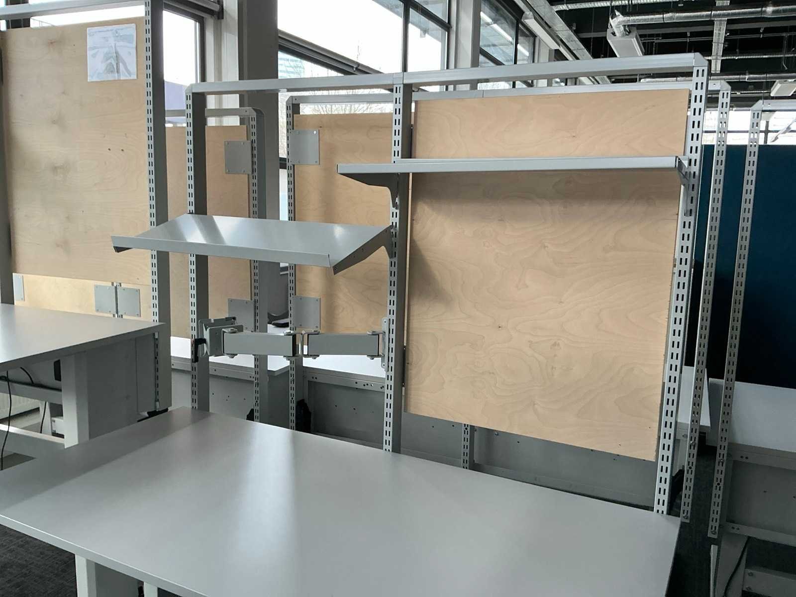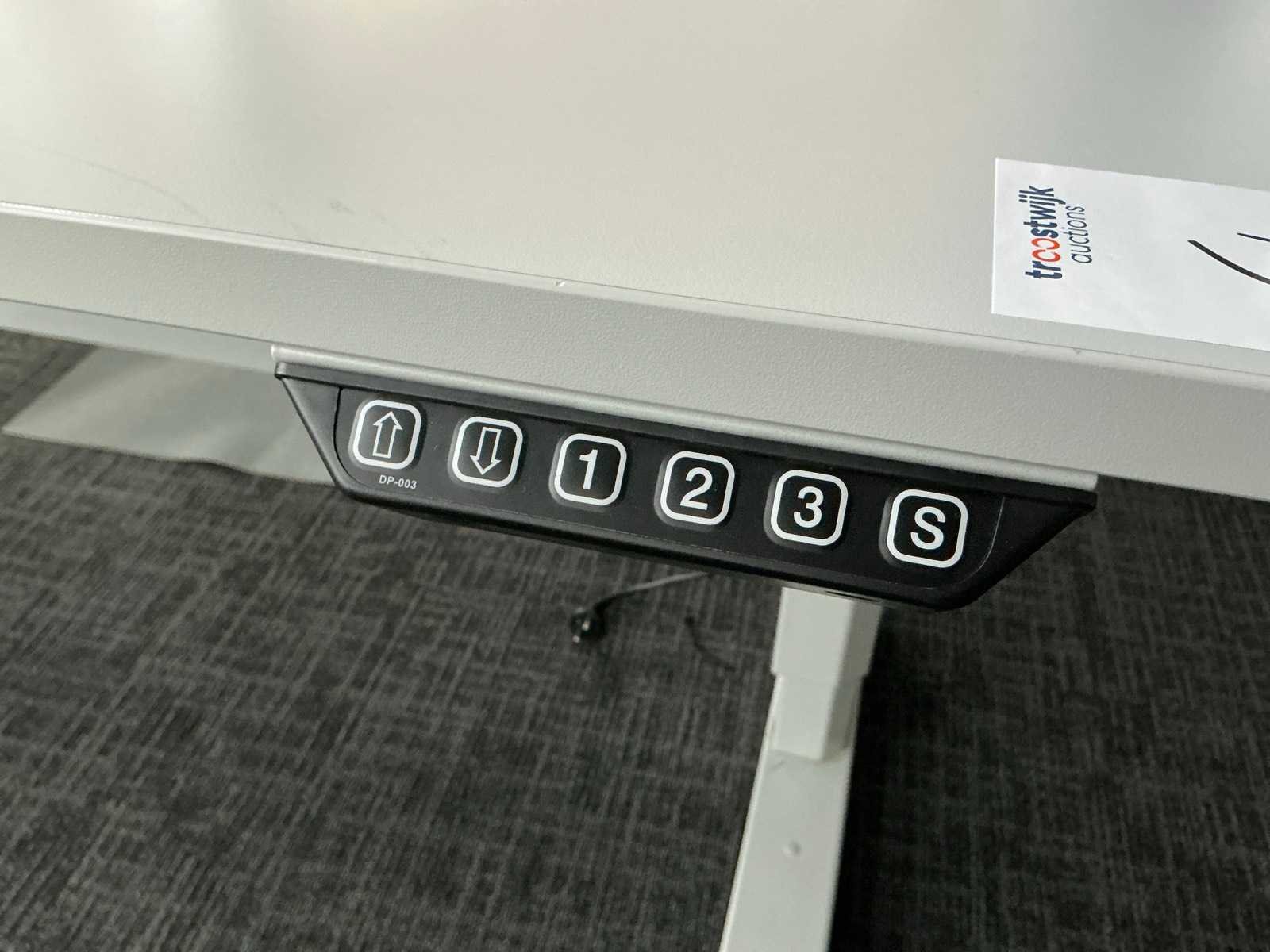 Elektrisch verstelbaar bureau (74-105cm) met stroomvoorziening en achterwand (107,5x153cm). Elk bureau is voorzien van een Fattore ergonomische bureaustoel. Merk: Treston Type: SP LA 31 Lengte: 80cm Breedte: 160cm