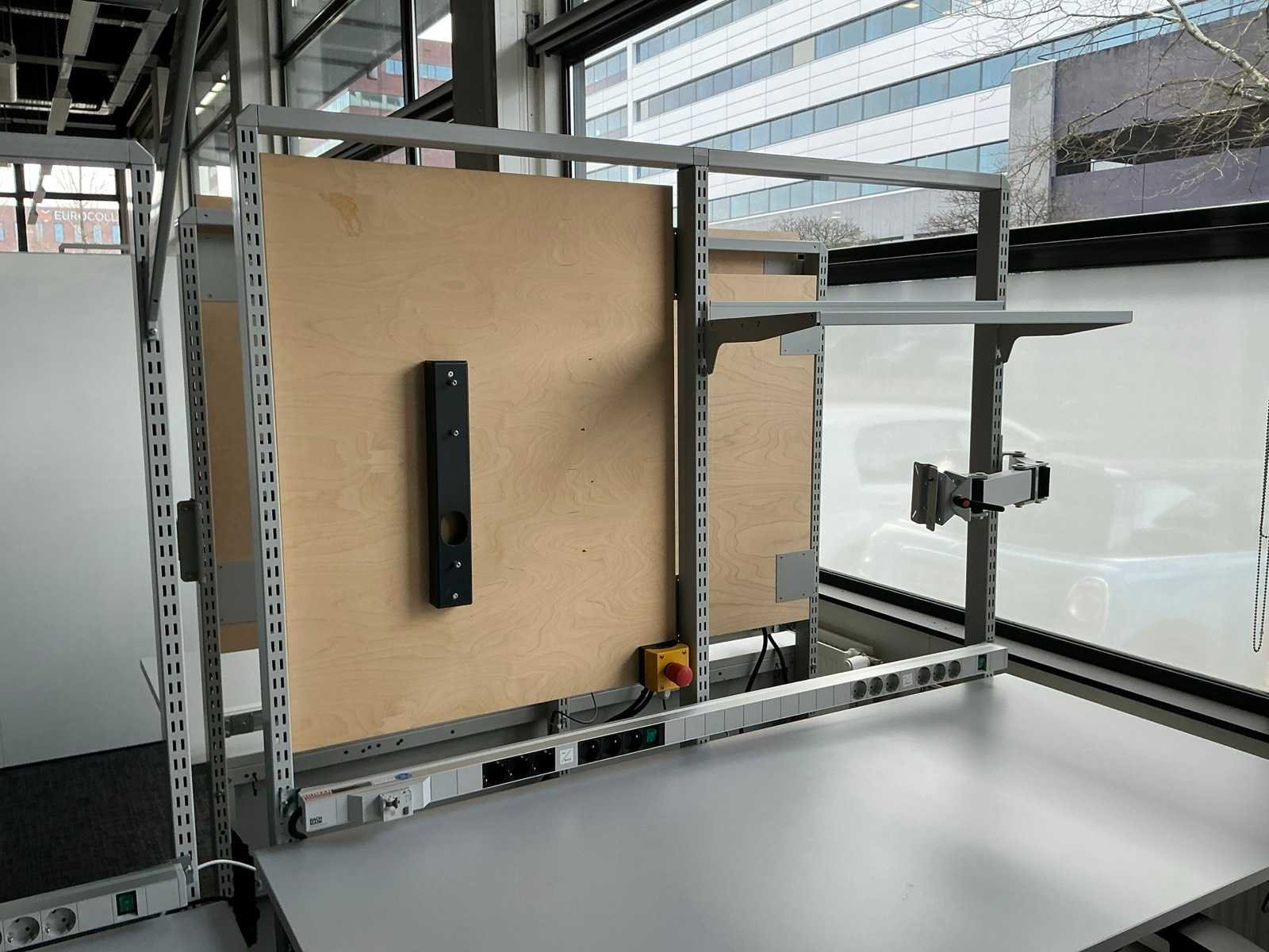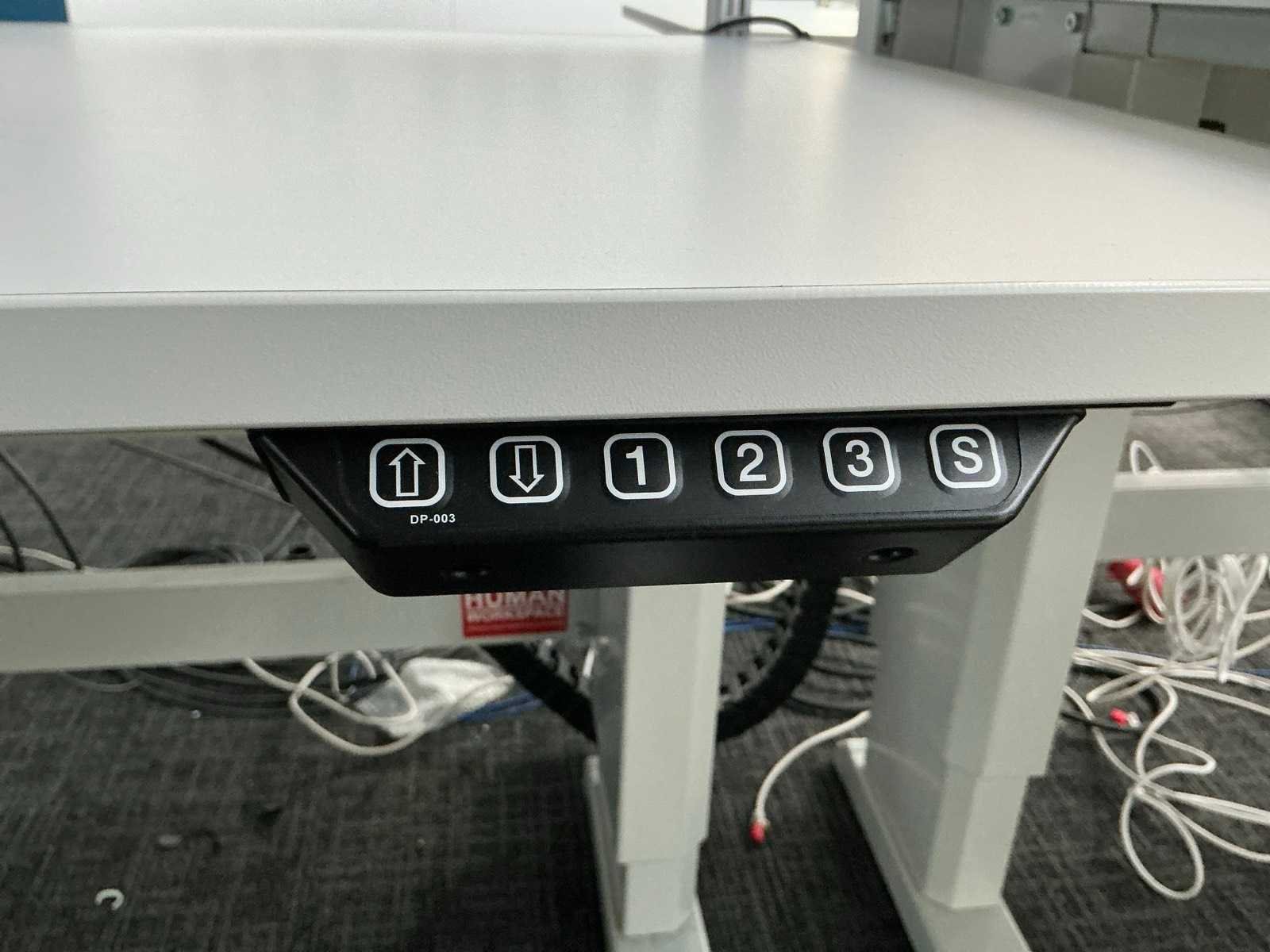 Elektrisch verstelbaar bureau (74-105cm) met stroomvoorziening en achterwand (107,5x153cm). Elk bureau is voorzien van een Fattore ergonomische bureaustoel. Merk: Treston Type: SP LA 31 Lengte: 80cm Breedte: 160cm