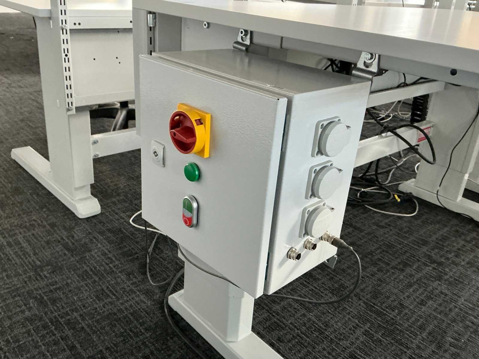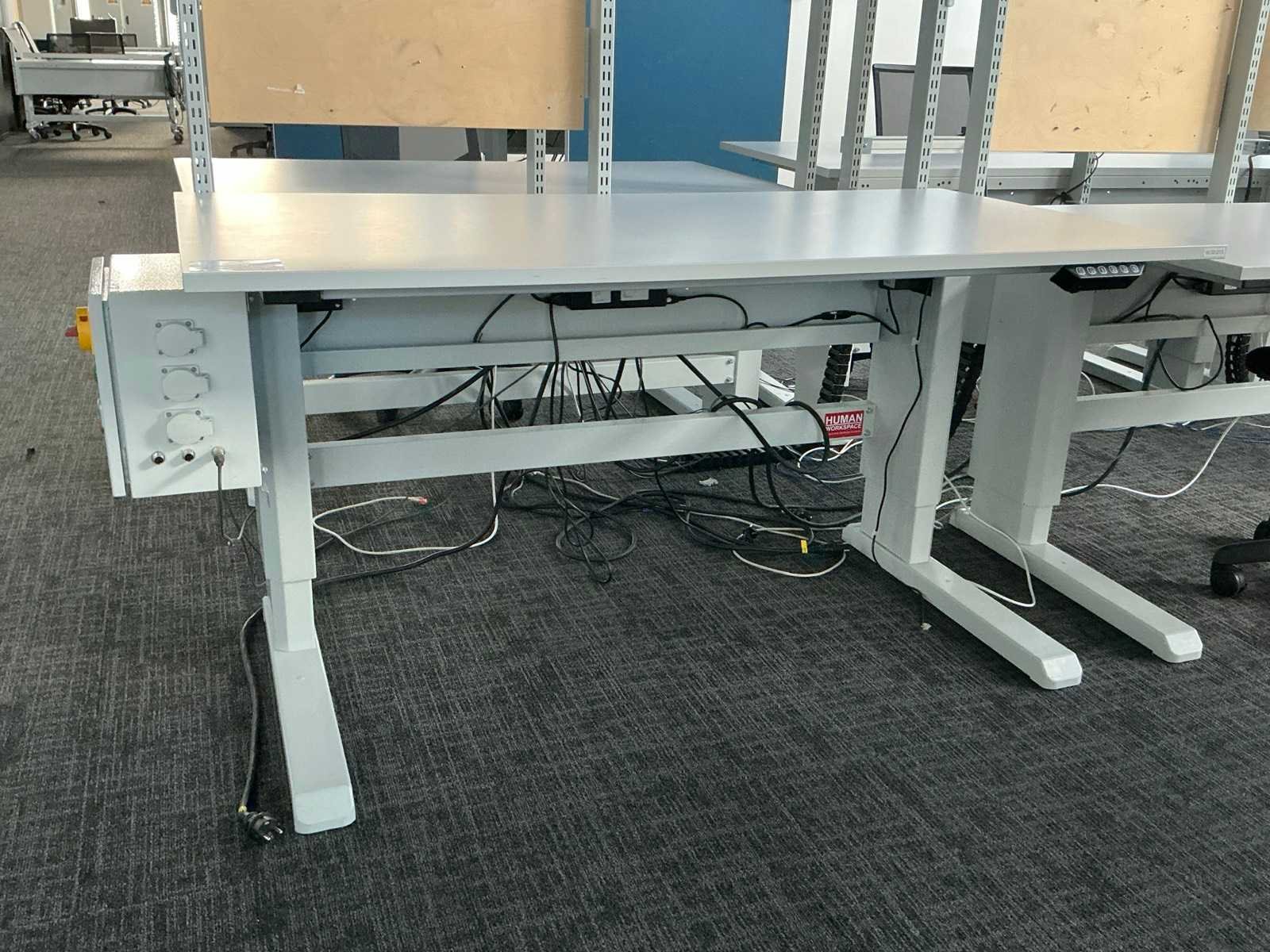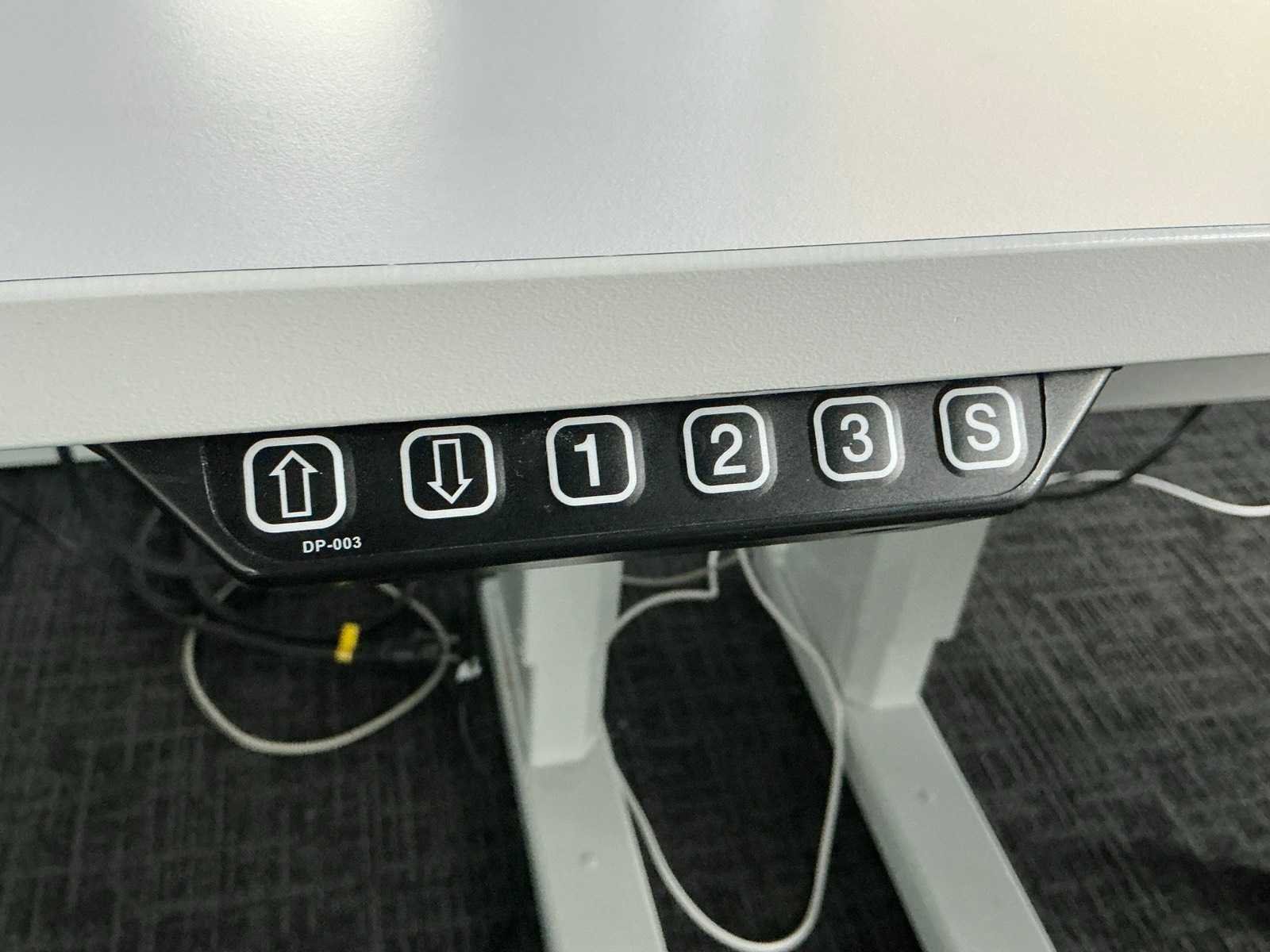 Elektrisch verstelbaar bureau (74-105cm) met stroomvoorziening en achterwand (107,5x153cm). Elk bureau is voorzien van een Fattore ergonomische bureaustoel. Merk: Treston Type: SP LA 31 Lengte: 80cm Breedte: 160cm