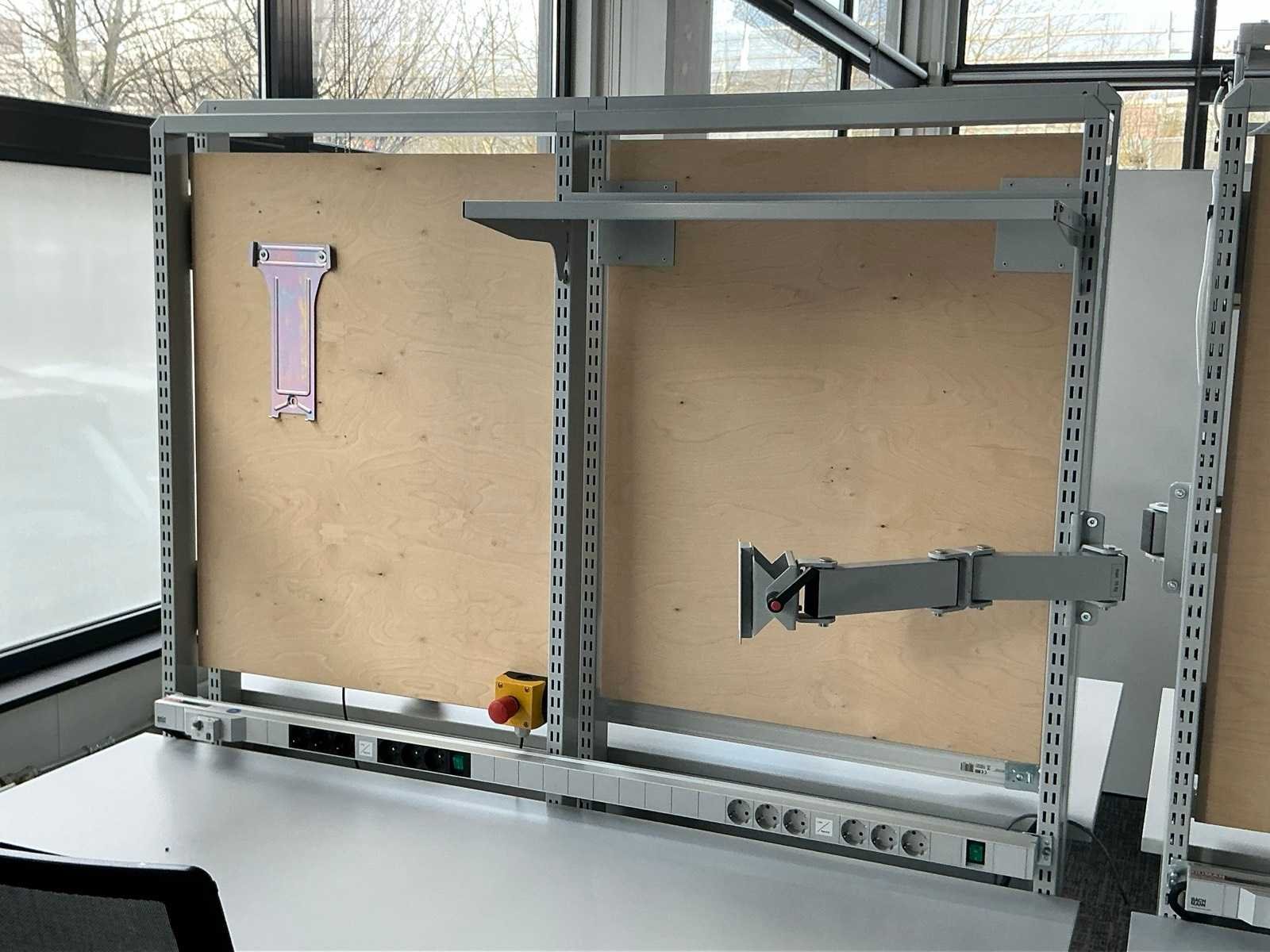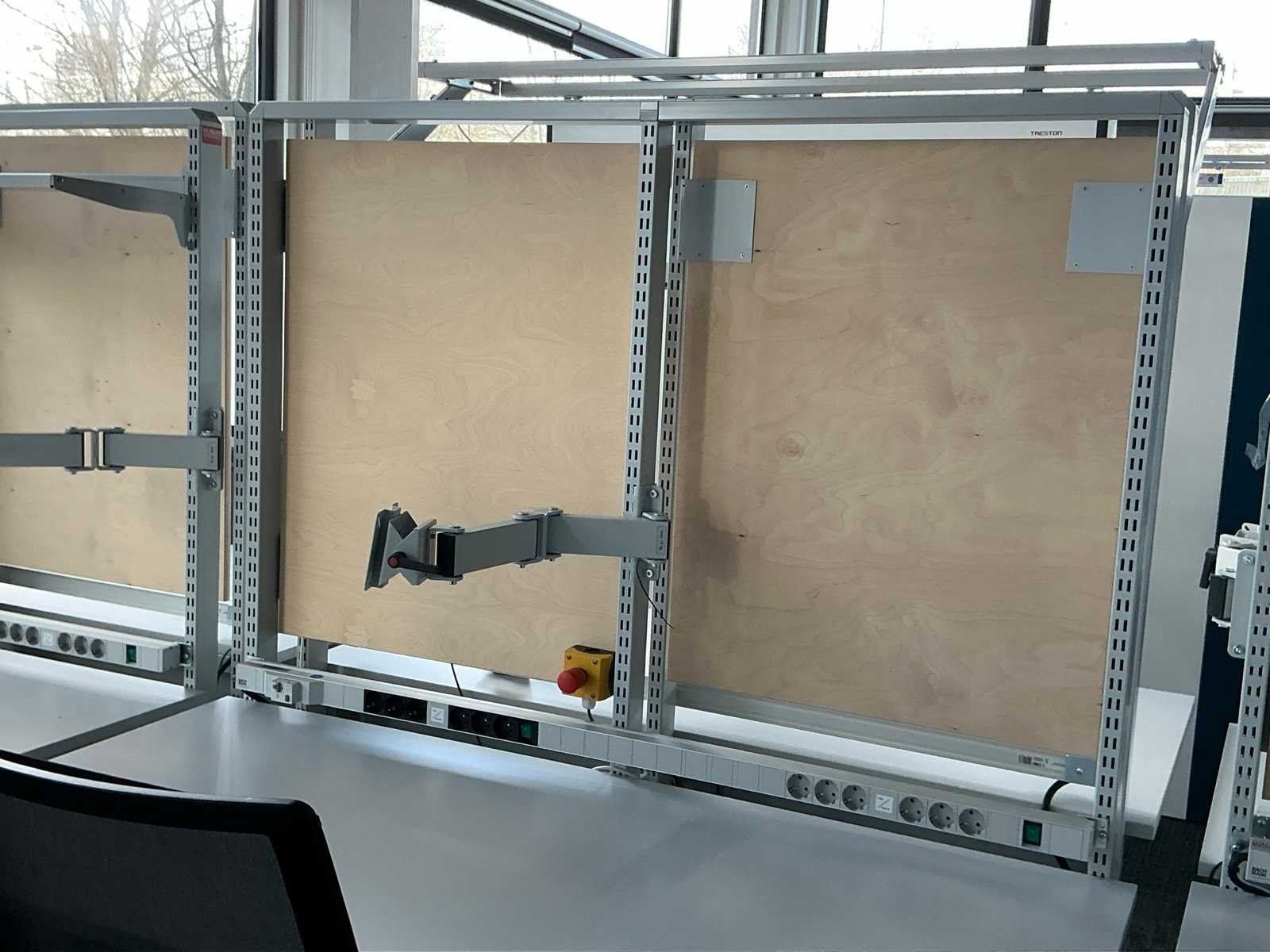 Elektrisch verstelbaar bureau (74-105cm) met stroomvoorziening en achterwand (107,5x153cm). Elk bureau is voorzien van een Fattore ergonomische bureaustoel. Merk: Treston Type: SP LA 31 Lengte: 80cm Breedte: 160cm