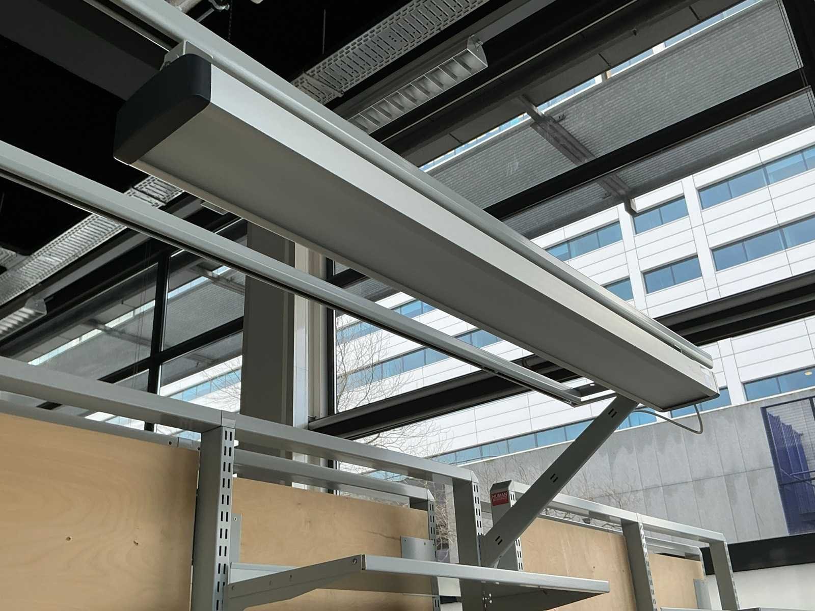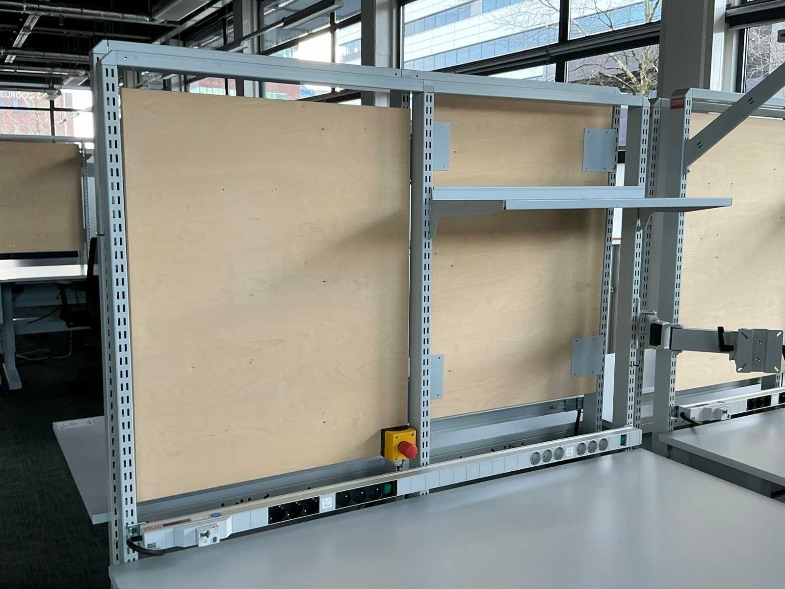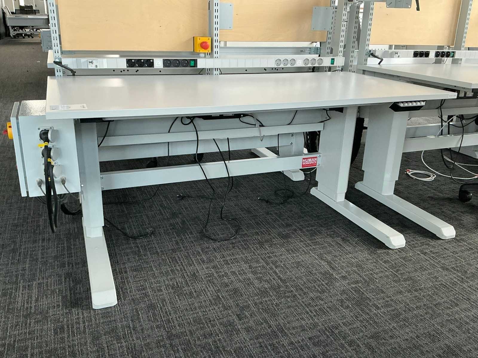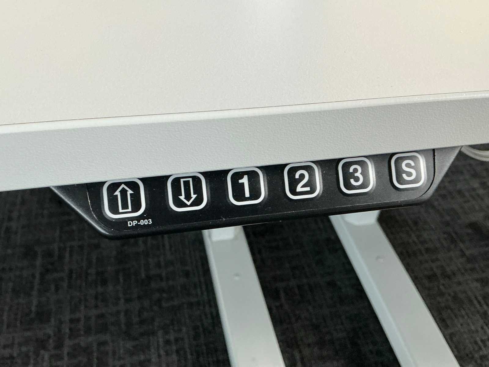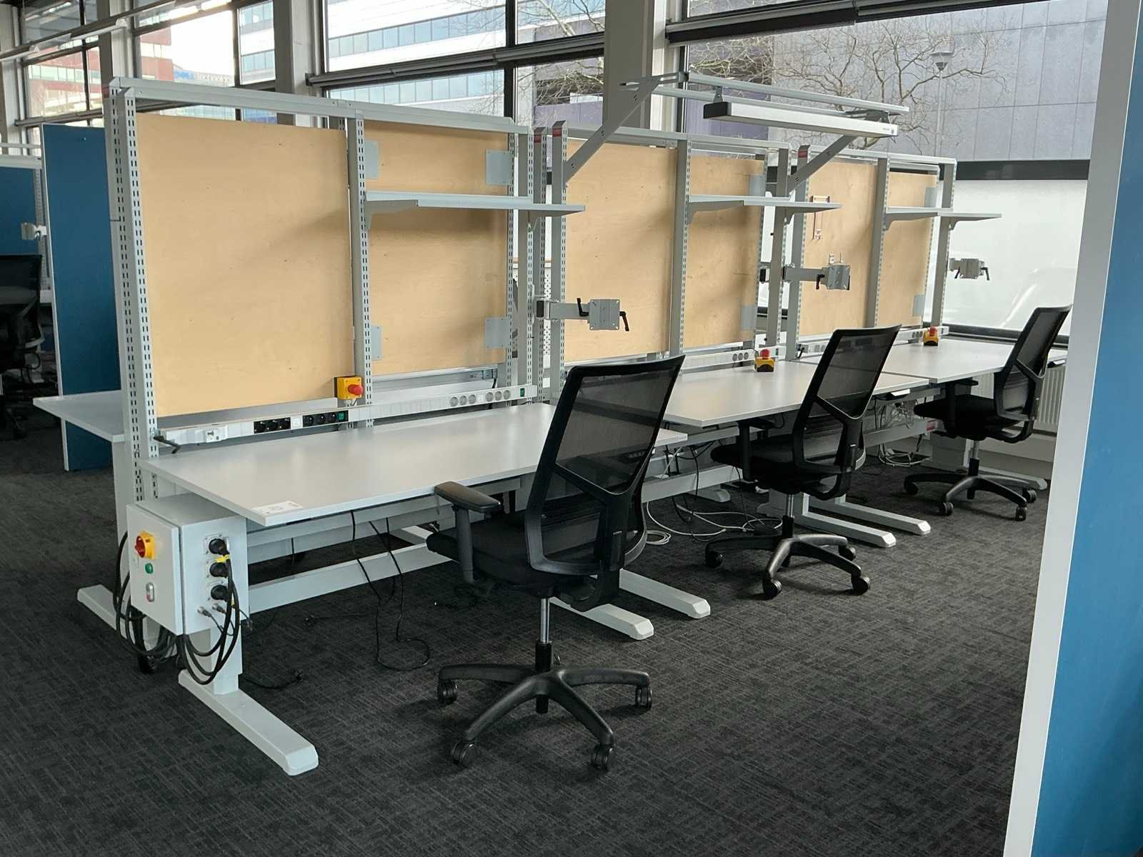 Elektrisch verstelbaar bureau (74-105cm) met stroomvoorziening en achterwand (107,5x153cm). Elk bureau is voorzien van een Fattore ergonomische bureaustoel. Merk: Treston Type: SP LA 31 Lengte: 80cm Breedte: 160cm