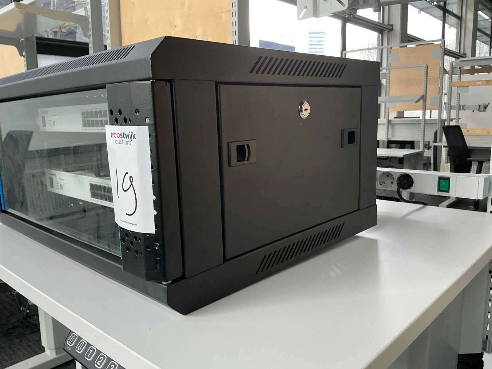 In een kleine patchkast. Merk: Fortinet Type: FortiSwitch 124F-PoE