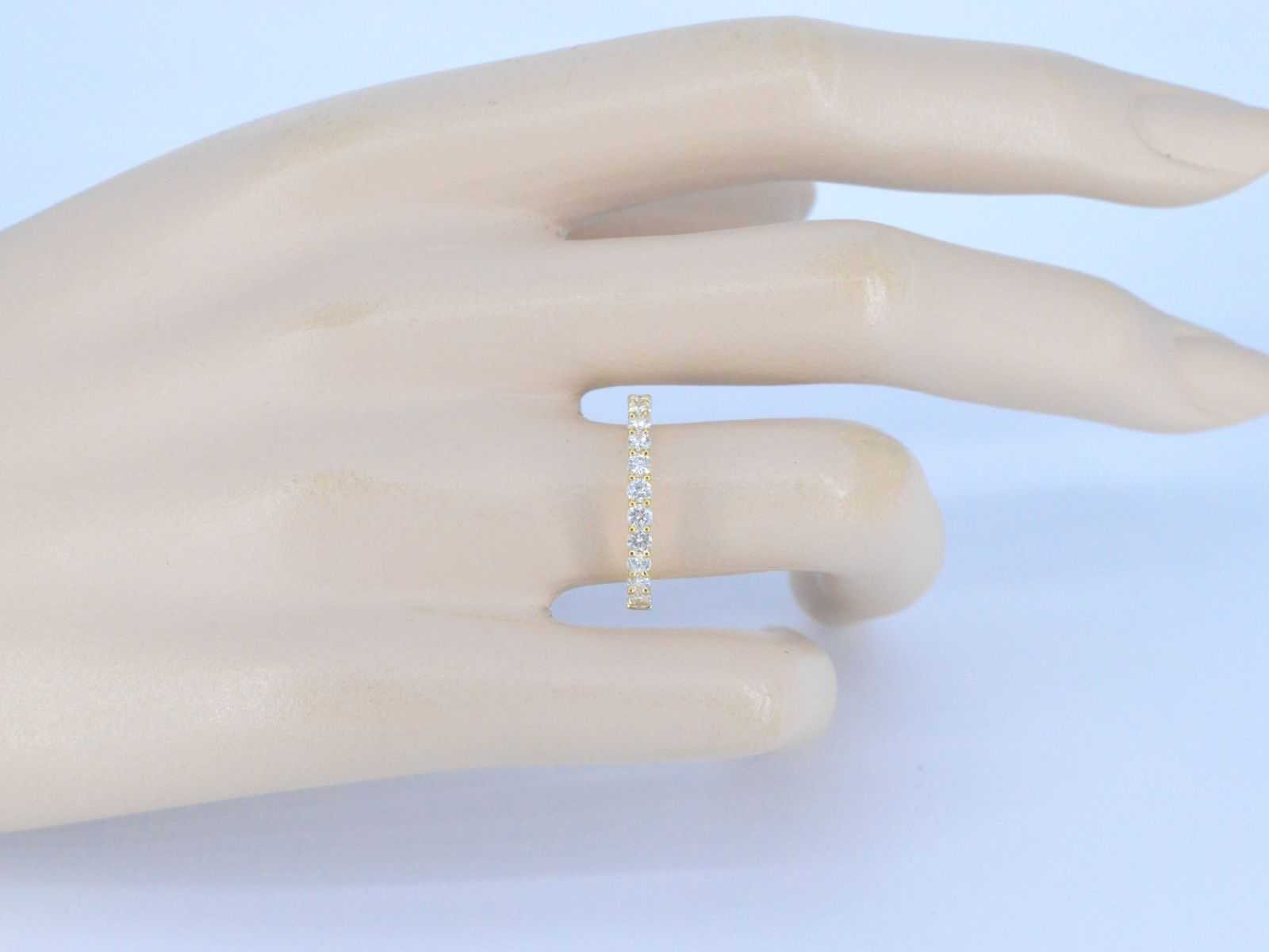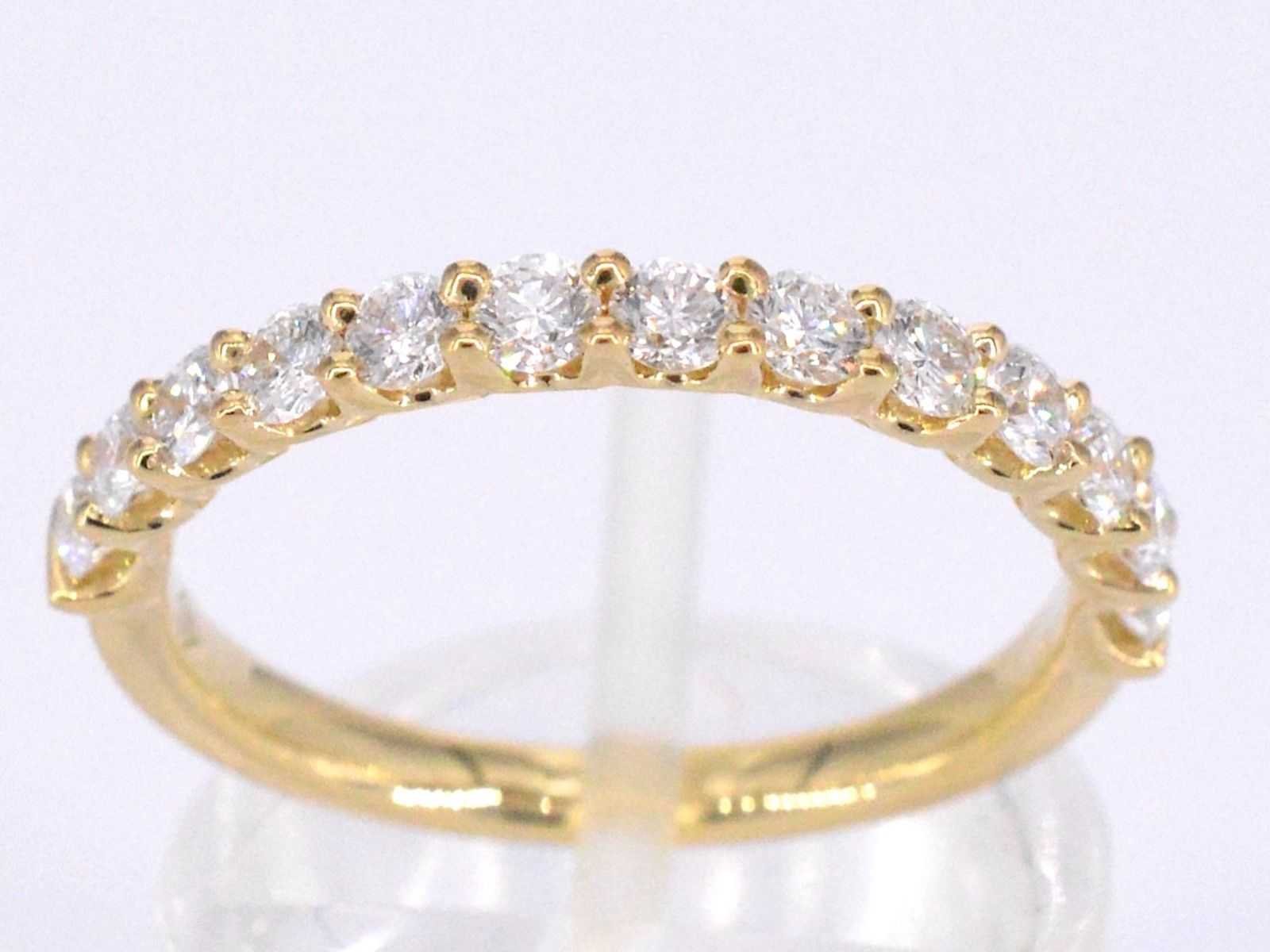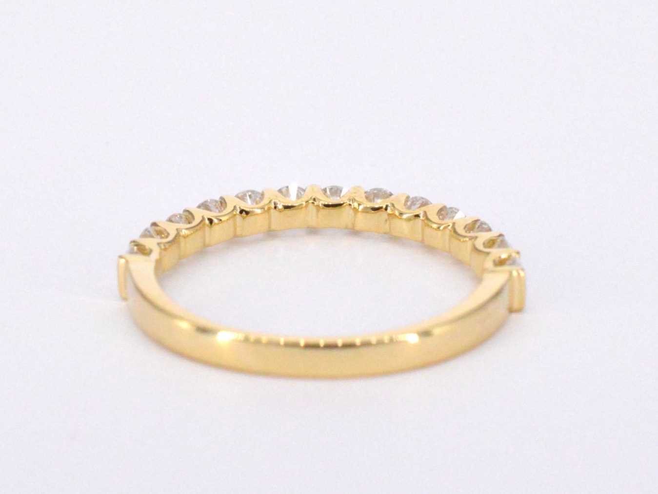 Samenvatting van gegevens Gouden rijring bezet met briljant geslepen diamanten Diamant: Natuurlijk; Slijpvorm: Briljant geslepen; Gewicht (carat): 0.75 carat; Kleur: F-G; Zuiverheid: VS; Slijpkwaliteit: Zeer mooi; Juweel: Ring; Gewicht: 2.1 gram; Ringmaat (op maat gemaakt*): 53 (17 mm); Materiaal: 18K goud (750); Conditie: Nieuw; Verpakking: Luxe sieradendoos; Toelichting: De kwaliteit is overgenomen van het rapport behorend bij item. Within 14 days Materiaal: Goud Voornaamste diamant: Natuurlijk Gewicht diamant: 0.75ct Totaal gewicht: 2.1g Keurmerk: 750 Lage schatting: 4018€ Hoge schatting: 5023€ Kleur diamant: F-G Slijpvorm diamant: Briljant geslepen Slijpkwaliteit diamant: Zeer mooi Zuiverheidsgraad diamant: VS