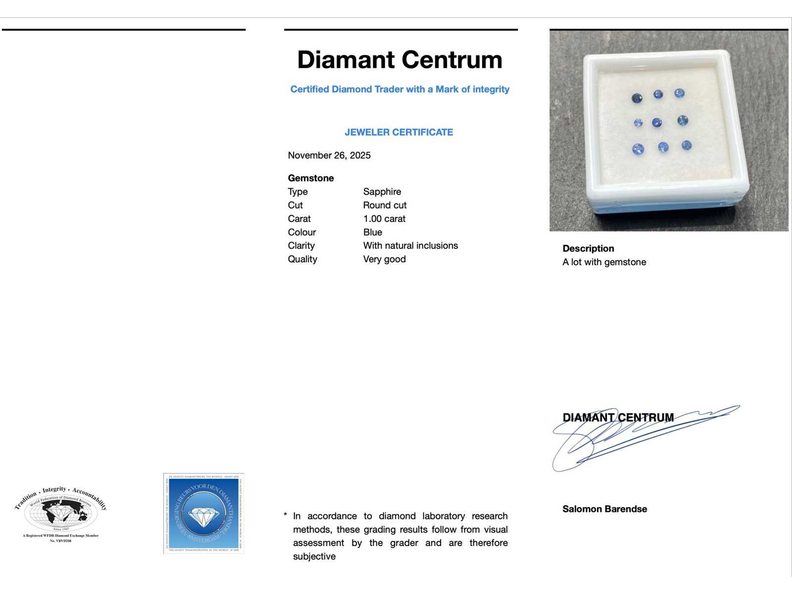 Samenvatting van gegevens Saffier - Mooie rond geslepen natuurlijke saffieren van hoge kwaliteit 1.00 carat Edelsteen: Saffier; Aantal: 9 stuks; Slijpvorm: Rond geslepen; Gewicht (carat): 1.00 carat; Kleur: Blauw; Zuiverheid: Met natuurlijke insluitsels; Slijpkwaliteit: Very good; Conditie: Nieuw; Verpakking: Edelsteendoos; Toelichting: De kwaliteit is overgenomen van het rapport behorend bij item. Within 14 days Edelsteen: Saffier Kleur edelsteen: Blauw Slijpvorm edelsteen: Rond geslepen Slijpkwaliteit edelsteen: Very good Zuiverheidsgraad edelsteen: Met natuurlijke insluitsels Lage schatting: 704€ Hoge schatting: 880€