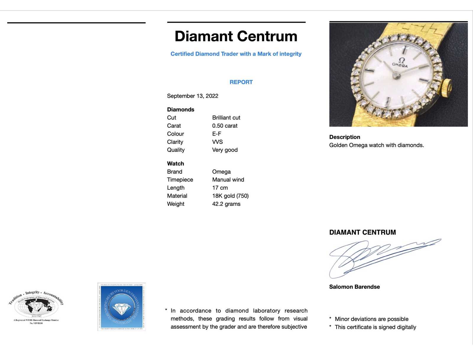 Samenvatting van gegevens Omega horloge met diamanten Diamant: Natuurlijk; Aantal: 28 stuks; Slijpvorm: Briljant geslepen; Gewicht (carat): 0.50 carat; Kleur: E-F; Zuiverheid: VVS; Slijpkwaliteit: Zeer mooi; Horloge (Merk): Omega; Klok (type): Handopwind; Juweel: Horloge; Gewicht: 42.2 gram; Afmetingen/lengte: 17 cm; Materiaal: 18k goud (585); Conditie: Vintage; Toelichting: De kwaliteit is overgenomen van het rapport behorend bij item. ; Extra informatie: Met gebruikssporen Within 14 days Totaal gewicht: 42.2g Keurmerk: 585 Lage schatting: 25200€ Hoge schatting: 31500€