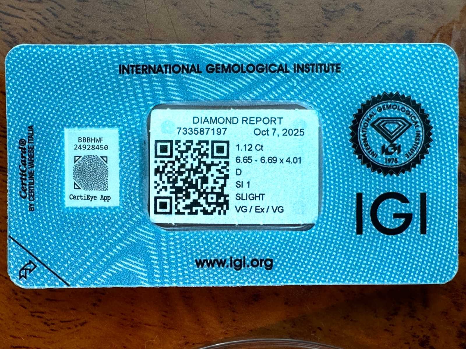 Samenvatting van gegevens Diamant - 1.12 carat echte natuurlijke Starcut Briljant geslepen diamant (gecertificeerd) Diamant: Natuurlijk; Aantal: 1 stuk; Slijpvorm: Briljant geslepen; Gewicht (carat): 1.12 carat; Kleur: D; Zuiverheid: SI1; Slijpkwaliteit: Very good; Certificaat: IGI; Certificaat nummer: 733587197; Extra informatie: Deze diamant is een echte Starcut diamant; Conditie: Nieuw; Verpakking: Komt met een Edelsteendoos ; Toelichting: De kwaliteit is overgenomen van het rapport behorend bij item. Within 14 days Voornaamste diamant: Natuurlijk Kleur diamant: D Gewicht diamant: 1.12ct Slijpvorm diamant: Briljant geslepen Slijpkwaliteit diamant: Very good Zuiverheidsgraad diamant: SI1 Certificaat: IGI Lage schatting: 19600€ Hoge schatting: 24500€