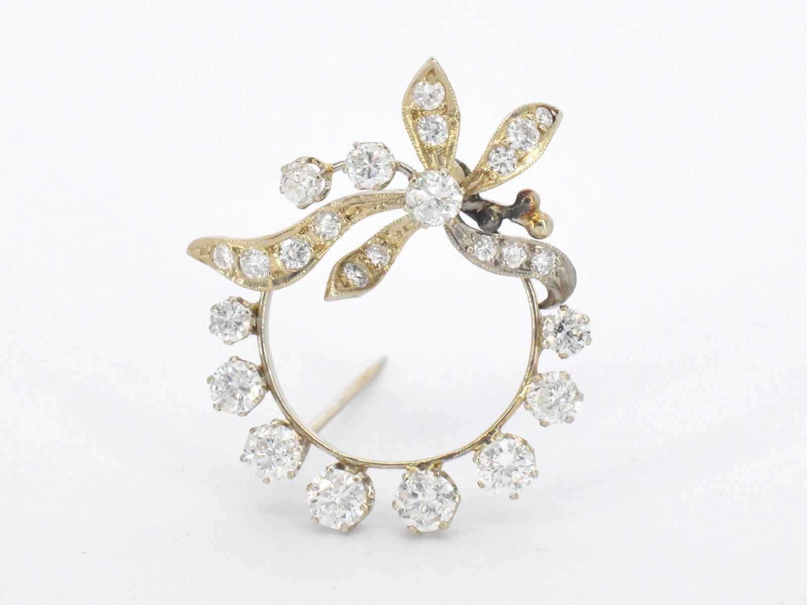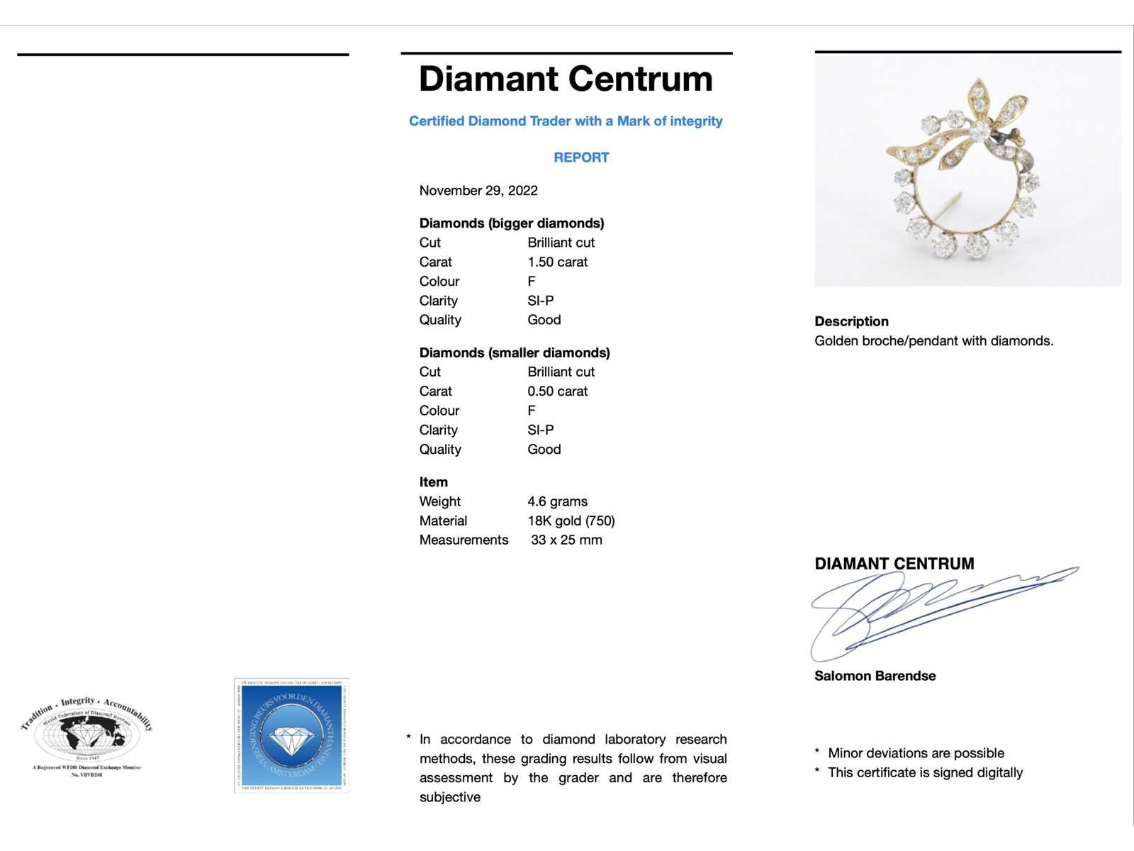 Samenvatting van gegevens Gouden broche/hanger met diamanten Diamant: Natuurlijk; Aantal: 11 stuks; Slijpvorm: Briljant geslepen; Gewicht (carat): 1.50 carat; Kleur: F; Zuiverheid: SI-P; Slijpkwaliteit: Mooi; Diamant (secundair): Diamanten; Aantal diamanten: 14 stuks; Slijpvorm: Briljant geslepen; Gewicht (carat): 0.50 carat; Kleur: F; Zuiverheid: SI-P; Slijpkwaliteit: Mooi; Juweel: Broche; Gewicht: 4.6 gram; Afmetingen/lengte: 33 x 25 mm; Materiaal: 18k goud (750); Conditie: Antiek - zeer mooie staat; Verpakking: Luxe sieradendoos; Toelichting: De kwaliteit is overgenomen van het rapport behorend bij item. Within 14 days Materiaal: Goud Voornaamste diamant: Natuurlijk Kleur diamant: F Gewicht diamant: 1.50ct Slijpvorm diamant: Briljant geslepen Slijpkwaliteit diamant: Mooi Zuiverheidsgraad diamant: SI-P Totaal gewicht: 4.6g Keurmerk: 750 Lage schatting: 11200€ Hoge schatting: 14000€