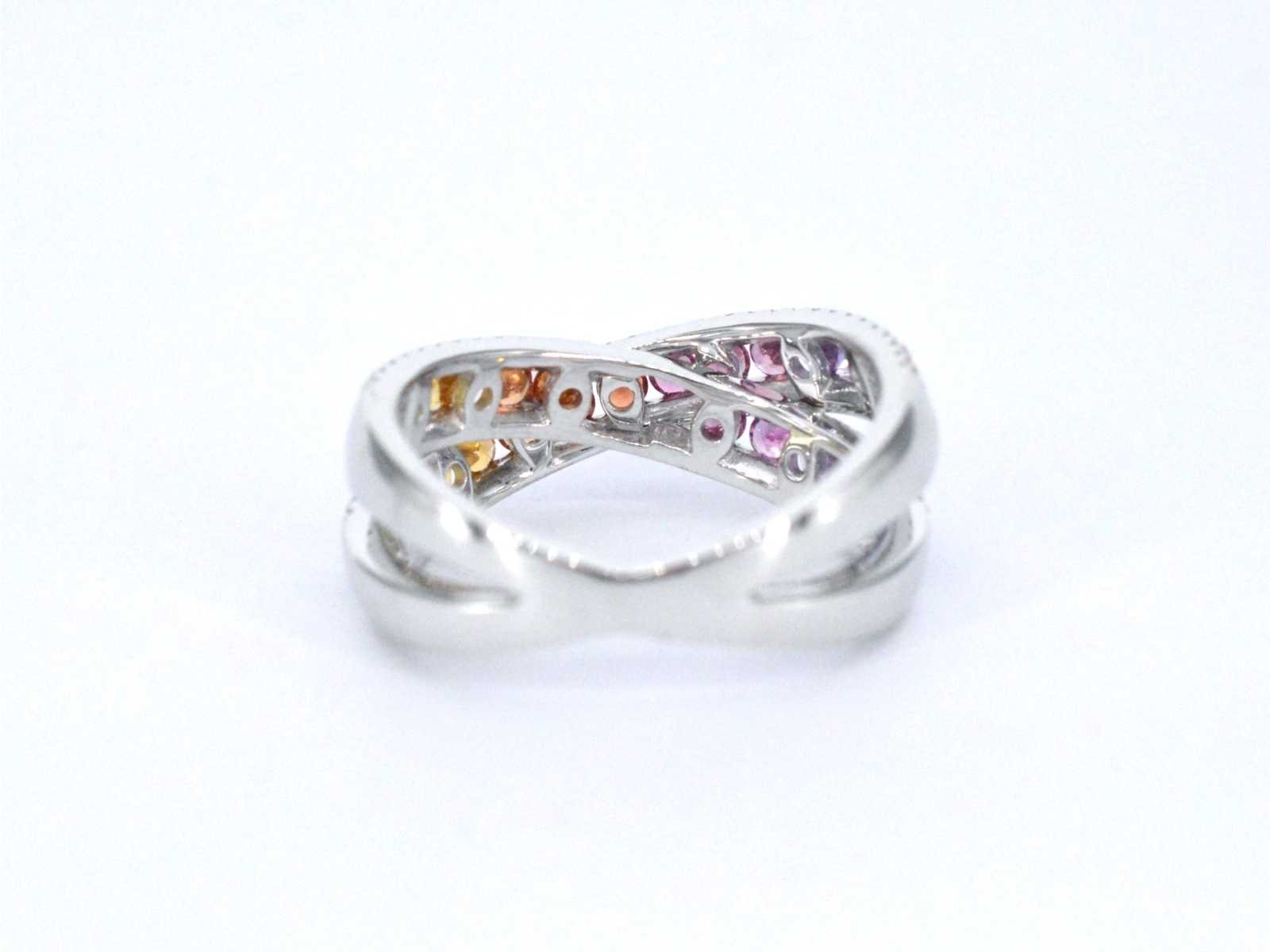 Samenvatting van gegevens Witgouden ring met diamanten en multicolour saffieren Aantal: 110 stuks; Slijpvorm: Briljant geslepen; Gewicht (carat): 0.50 carat; Kleur: F-G; Zuiverheid: VS; Slijpkwaliteit: Zeer mooi; Edelsteen: Saffieren; Aantal: 28 stuks; Slijpvorm: Briljant geslepen; Gewicht (carat): 1.25 carat; Kleur: Multicolour; Slijpkwaliteit: Very good; Juweel: Ring; Gewicht: 5 gram; Ringmaat (op maat gemaakt*): 53 (17 mm); Materiaal: 18K goud (750); Conditie: Nieuw; Verpakking: Luxe sieradendoos; Toelichting: De kwaliteit is overgenomen van het rapport behorend bij item. Within 14 days Materiaal: Goud Gewicht diamant: 0.50ct Edelsteen: Saffieren Totaal gewicht: 5g Keurmerk: 750 Lage schatting: 5544€ Hoge schatting: 6930€ Kleur diamant: F-G Slijpvorm diamant: Briljant geslepen Slijpkwaliteit diamant: Zeer mooi Zuiverheidsgraad diamant: VS Kleur edelsteen: Multicolour Slijpvorm edelsteen: Briljant geslepen Slijpkwaliteit edelsteen: Very good