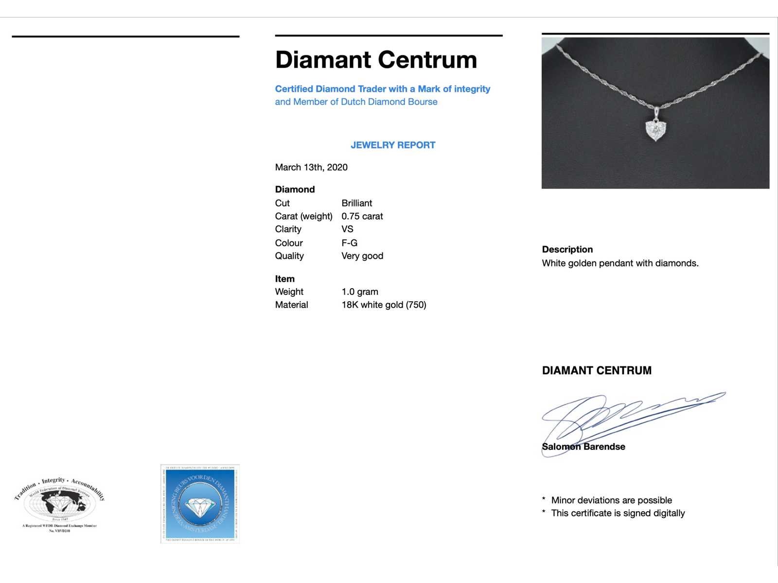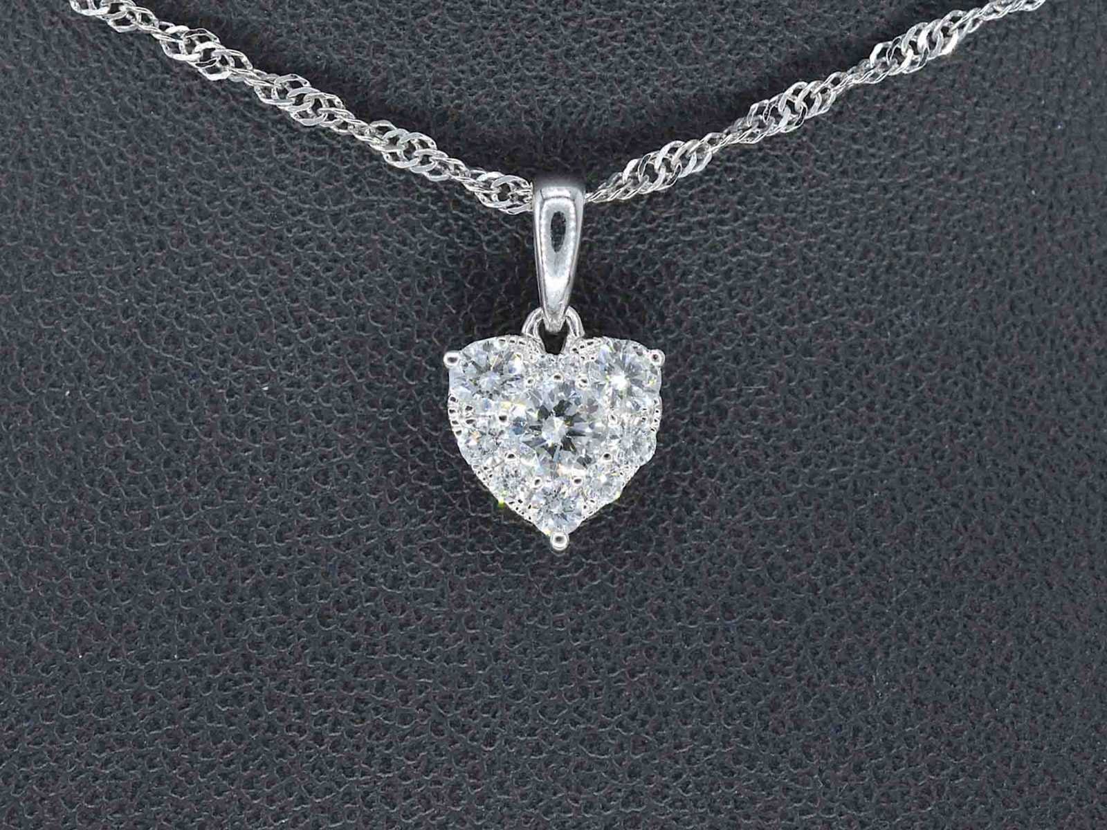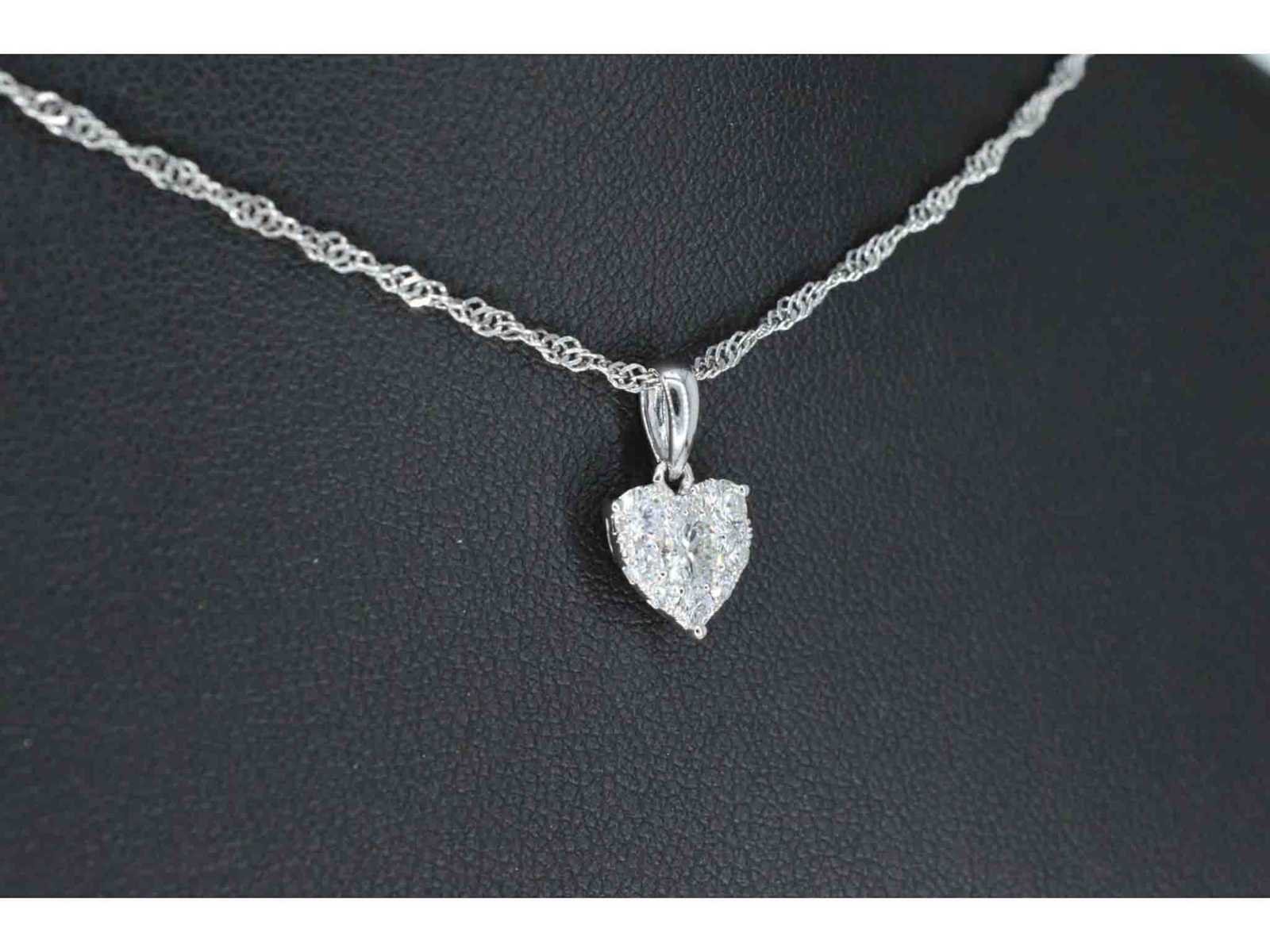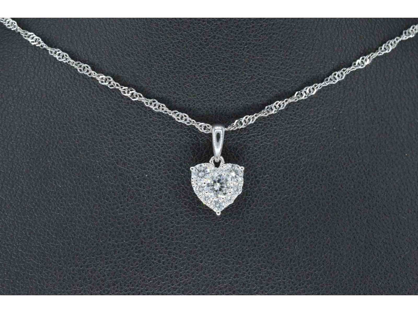 Samenvatting van gegevens Witgouden hartvormige hanger met diamanten Diamant: Natuurlijk; Slijpvorm: Briljant geslepen; Gewicht (carat): 0.75 carat; Kleur: F-G; Zuiverheid: VS; Slijpkwaliteit: Zeer mooi; Juweel: Hanger (excl. ketting); Gewicht: 1 gram; Materiaal: 18K goud (750); Conditie: Nieuw; Verpakking: Luxe sieradendoos; Toelichting: De kwaliteit is overgenomen van het rapport behorend bij item. Within 14 days Materiaal: Goud Voornaamste diamant: Natuurlijk Kleur diamant: F-G Gewicht diamant: 0.75ct Slijpvorm diamant: Briljant geslepen Slijpkwaliteit diamant: Zeer mooi Zuiverheidsgraad diamant: VS Totaal gewicht: 1g Keurmerk: 750 Lage schatting: 4480€ Hoge schatting: 5600€