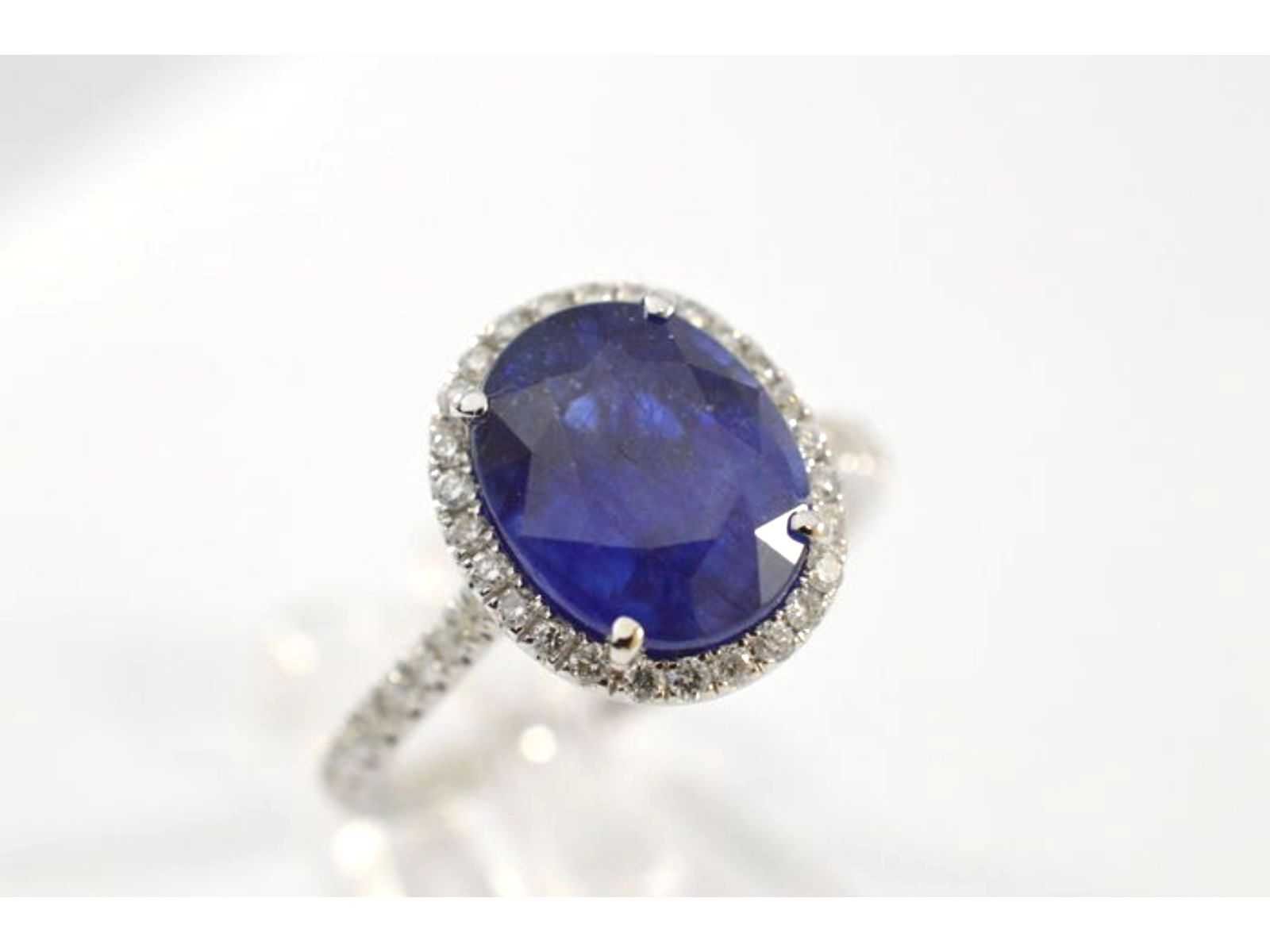 Samenvatting van gegevens Witgouden entourage ring met diamanten en saffier Diamant: Natuurlijk; Slijpvorm: Briljant geslepen; Gewicht (carat): 0.40 carat; Kleur: F-G; Zuiverheid: VS; Slijpkwaliteit: Zeer mooi; Edelsteen: Saffier; Aantal: 1 stuk; Slijpvorm: Ovaal; Gewicht (carat): 4.00 carat; Kleur: Royal blue (enhanced); Zuiverheid: Met natuurlijke insluitsels (enhanced); Afmetingen: 10.0 x 8.0 mm; Juweel: Ring; Gewicht: 4.1 gram; Ringmaat (op maat gemaakt*): 53 (17 mm); Materiaal: 18K goud (750); Conditie: Nieuw; Verpakking: Luxe sieradendoos; Toelichting: De kwaliteit is overgenomen van het rapport behorend bij item. Within 14 days Materiaal: Goud Voornaamste diamant: Natuurlijk Gewicht diamant: 0.40ct Edelsteen: Saffier Totaal gewicht: 4.1g Keurmerk: 750 Lage schatting: 3710.4€ Hoge schatting: 4638€ Kleur diamant: F-G Slijpvorm diamant: Briljant geslepen Slijpkwaliteit diamant: Zeer mooi Zuiverheidsgraad diamant: VS Kleur edelsteen: Royal blue (enhanced) Slijpvorm edelsteen: Ovaal Zuiverheidsgraad edelsteen: Met natuurlijke insluitsels (enhanced)