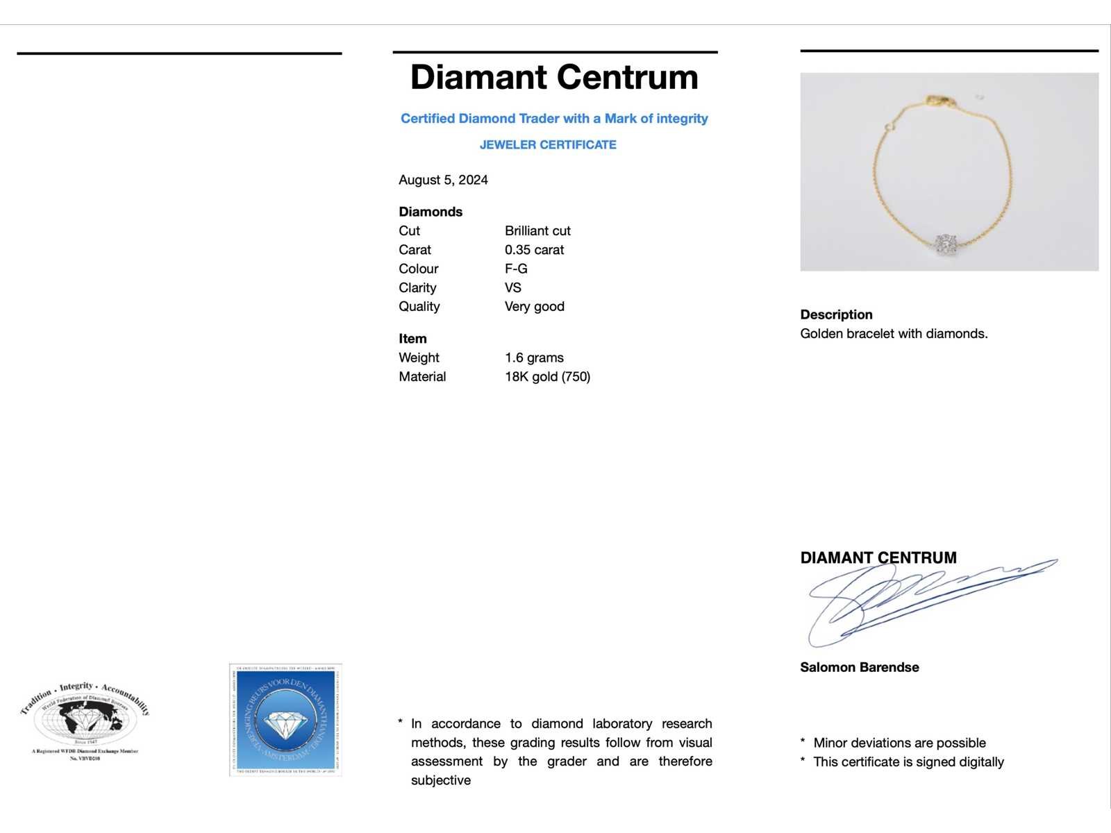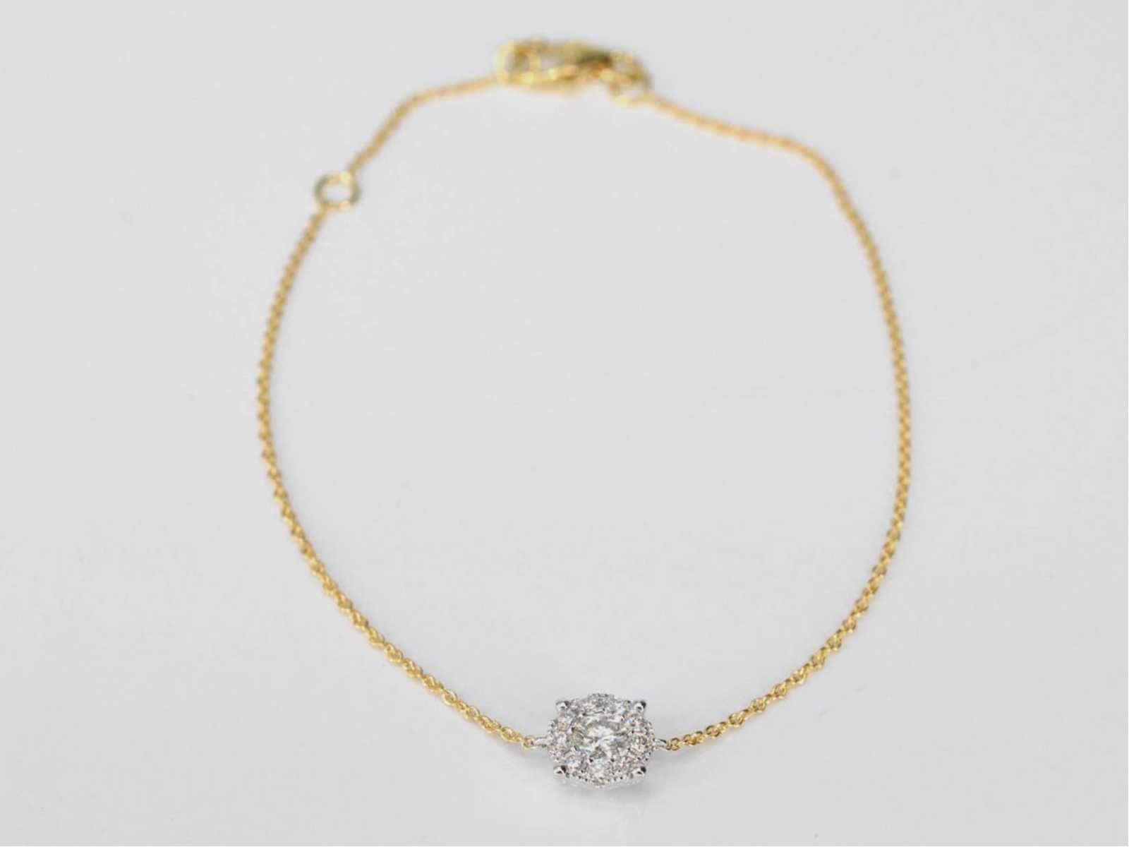 Samenvatting van gegevens Gouden armband met een diamanten bedel Diamant: Natuurlijk; Slijpvorm: Briljant geslepen; Gewicht (carat): 0.35 carat; Kleur: F-G; Zuiverheid: VS; Slijpkwaliteit: Zeer mooi; Juweel: Armband; Gewicht: 1.6 gram; Afmetingen/lengte: 16 - 18 cm (verstelbaar); Materiaal: 18K goud (750); Conditie: Nieuw; Verpakking: Luxe sieradendoos; Toelichting: De kwaliteit is overgenomen van het rapport behorend bij item. Within 14 days Materiaal: Goud Voornaamste diamant: Natuurlijk Kleur diamant: F-G Gewicht diamant: 0.35ct Slijpvorm diamant: Briljant geslepen Slijpkwaliteit diamant: Zeer mooi Zuiverheidsgraad diamant: VS Totaal gewicht: 1.6g Keurmerk: 750 Lage schatting: 2688€ Hoge schatting: 3360€
