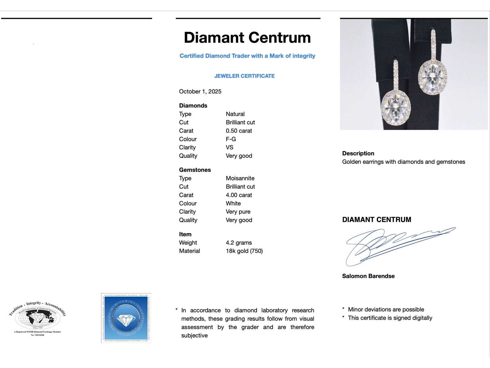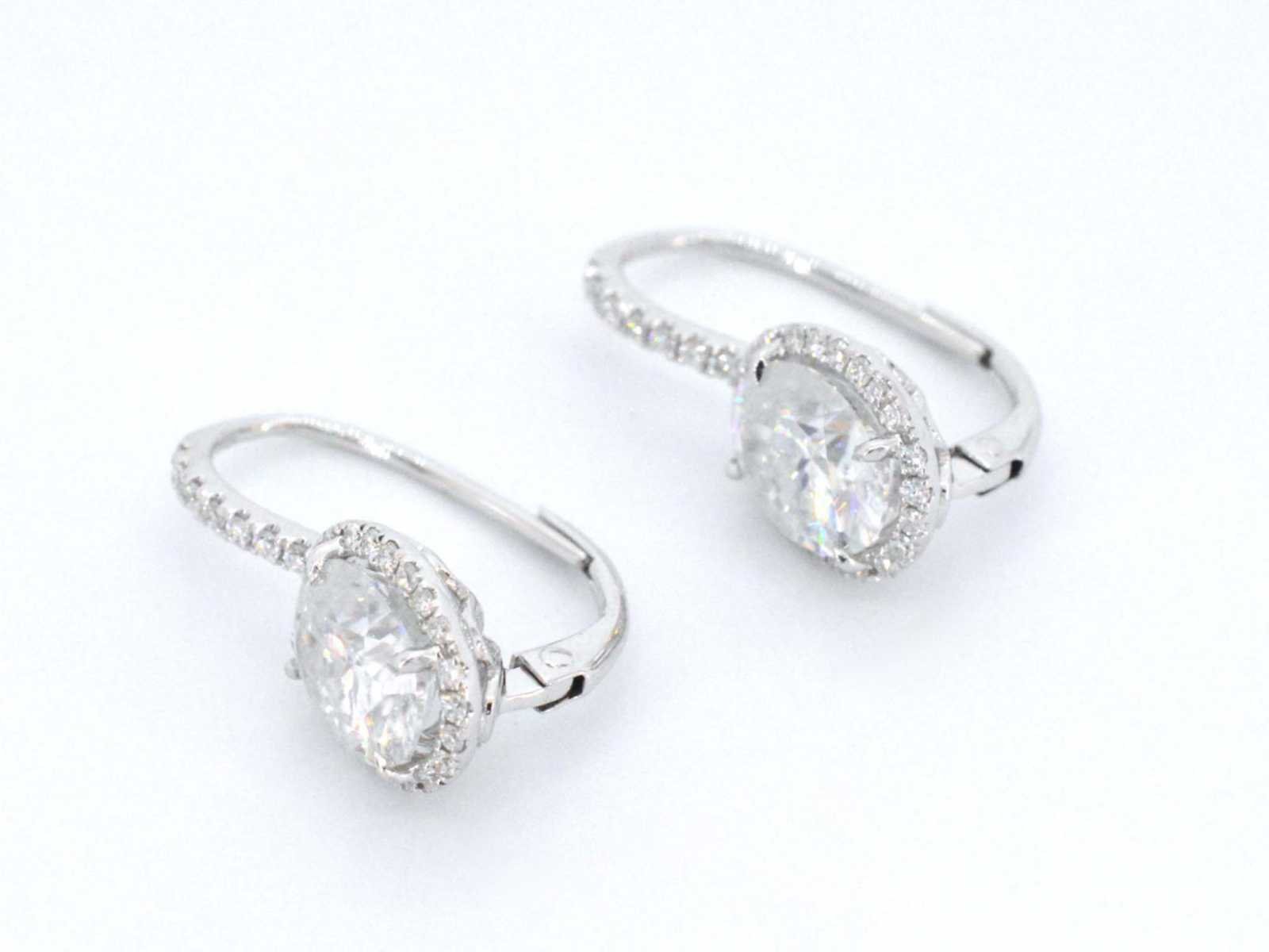 Samenvatting van gegevens Witgouden entourage oorbellen met diamanten en een gemaakte ovale briljant Diamant: Natuurlijk; Slijpvorm: Briljant geslepen; Gewicht (carat): 0.50 carat; Kleur: F-G; Zuiverheid: VS; Slijpkwaliteit: Zeer mooi; Edelsteen: Moissaniet; Aantal: 2 stuks; Slijpvorm: Briljant geslepen; Gewicht (carat): 4.00 carat; Kleur: Wit; Zuiverheid: Zeer zuiver; Slijpkwaliteit: Very good; Juweel: Oorbellen; Gewicht: 4.2 gram; Afmetingen/lengte: 22 x 10 mm; Materiaal: 18K goud (750); Conditie: Nieuw; Verpakking: Luxe sieradendoos; Toelichting: De kwaliteit is overgenomen van het rapport behorend bij item. Within 14 days Materiaal: Goud Voornaamste diamant: Natuurlijk Kleur diamant: F-G Gewicht diamant: 0.50ct Slijpvorm diamant: Briljant geslepen Slijpkwaliteit diamant: Zeer mooi Zuiverheidsgraad diamant: VS Edelsteen: Moissaniet Kleur edelsteen: Wit Slijpvorm edelsteen: Briljant geslepen Slijpkwaliteit edelsteen: Very good Zuiverheidsgraad edelsteen: Zeer zuiver Totaal gewicht: 4.2g Keurmerk: 750 Lage schatting: 4662.400000000001€ Hoge schatting: 5828€