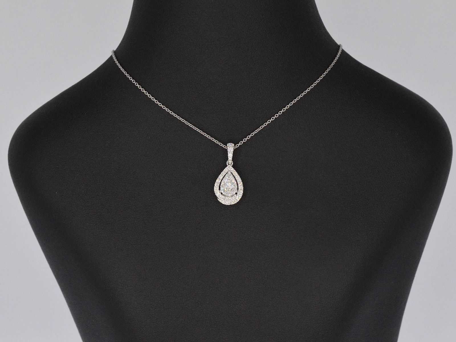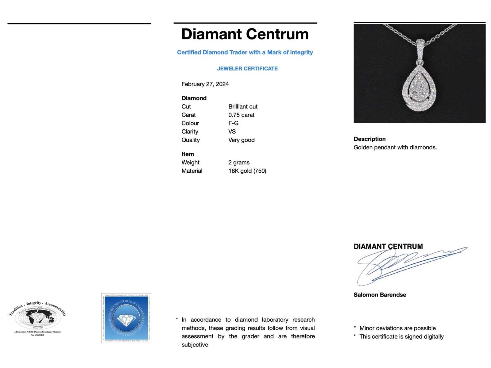 Samenvatting van gegevens Witgouden hanger met diamanten pear shape Diamant: Natuurlijk; Slijpvorm: Briljant geslepen; Gewicht (carat): 0.75 carat; Kleur: F-G; Zuiverheid: VS; Slijpkwaliteit: Zeer mooi; Juweel: Hanger (excl. ketting); Gewicht: 2.1 gram; Afmetingen/lengte: 21 x 10 mm; Materiaal: 18K goud (750); Conditie: Nieuw; Verpakking: Luxe sieradendoos; Toelichting: De kwaliteit is overgenomen van het rapport behorend bij item. Within 14 days Materiaal: Goud Voornaamste diamant: Natuurlijk Kleur diamant: F-G Gewicht diamant: 0.75ct Slijpvorm diamant: Briljant geslepen Slijpkwaliteit diamant: Zeer mooi Zuiverheidsgraad diamant: VS Totaal gewicht: 2.1g Keurmerk: 750 Lage schatting: 3766.4€ Hoge schatting: 4708€