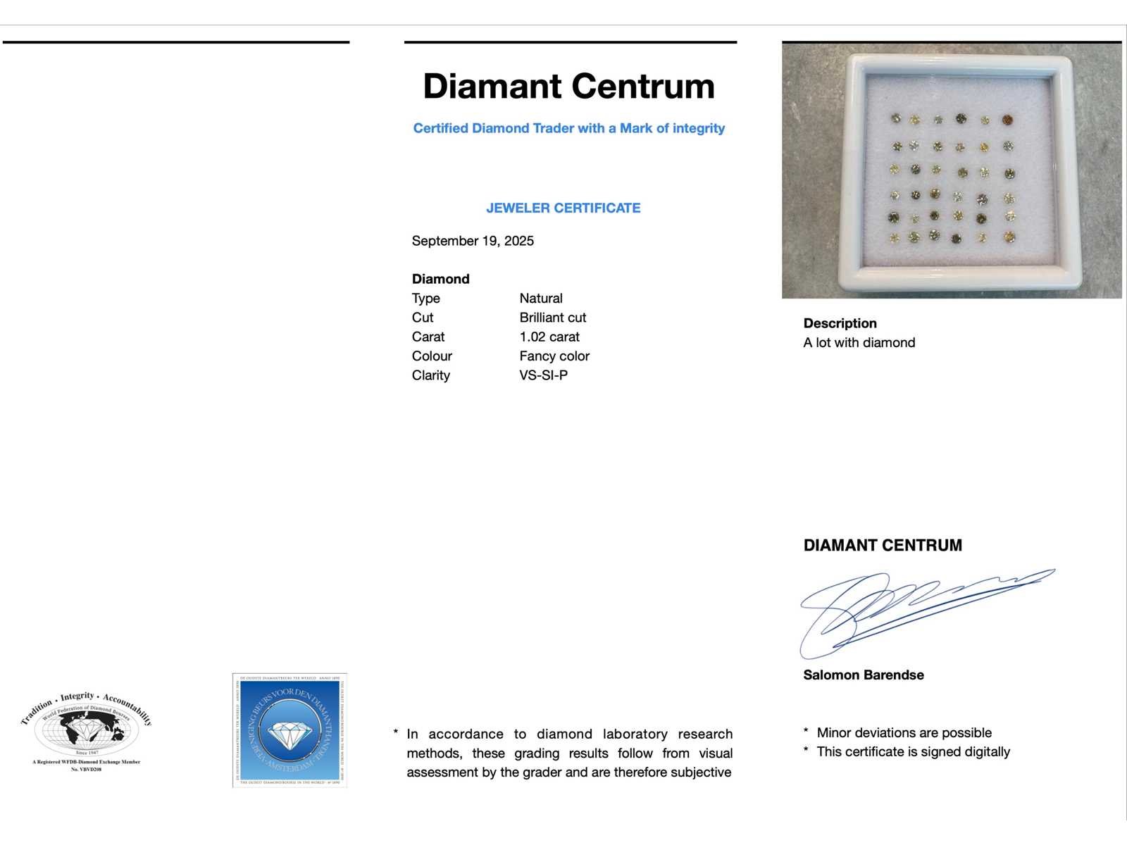 Samenvatting van gegevens Diamant - 1.20 carat echte natuurlijke diamant Diamant: Natuurlijk; Slijpvorm: Briljant geslepen; Gewicht (carat): 1.02 carat; Kleur: Fancy colour; Zuiverheid: VS-SI-P; Conditie: Nieuw; Verpakking: Edelsteendoos; Toelichting: De kwaliteit is overgenomen van het rapport behorend bij item. Within 14 days Voornaamste diamant: Natuurlijk Kleur diamant: Fancy colour Gewicht diamant: 1.02ct Slijpvorm diamant: Briljant geslepen Zuiverheidsgraad diamant: VS-SI-P Lage schatting: 1264€ Hoge schatting: 1580€