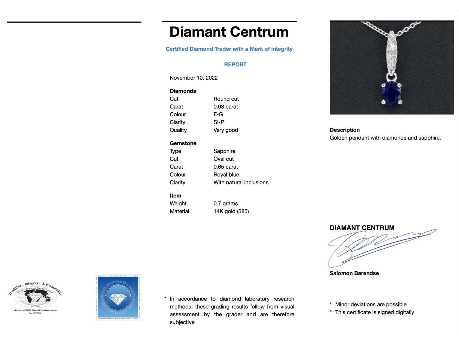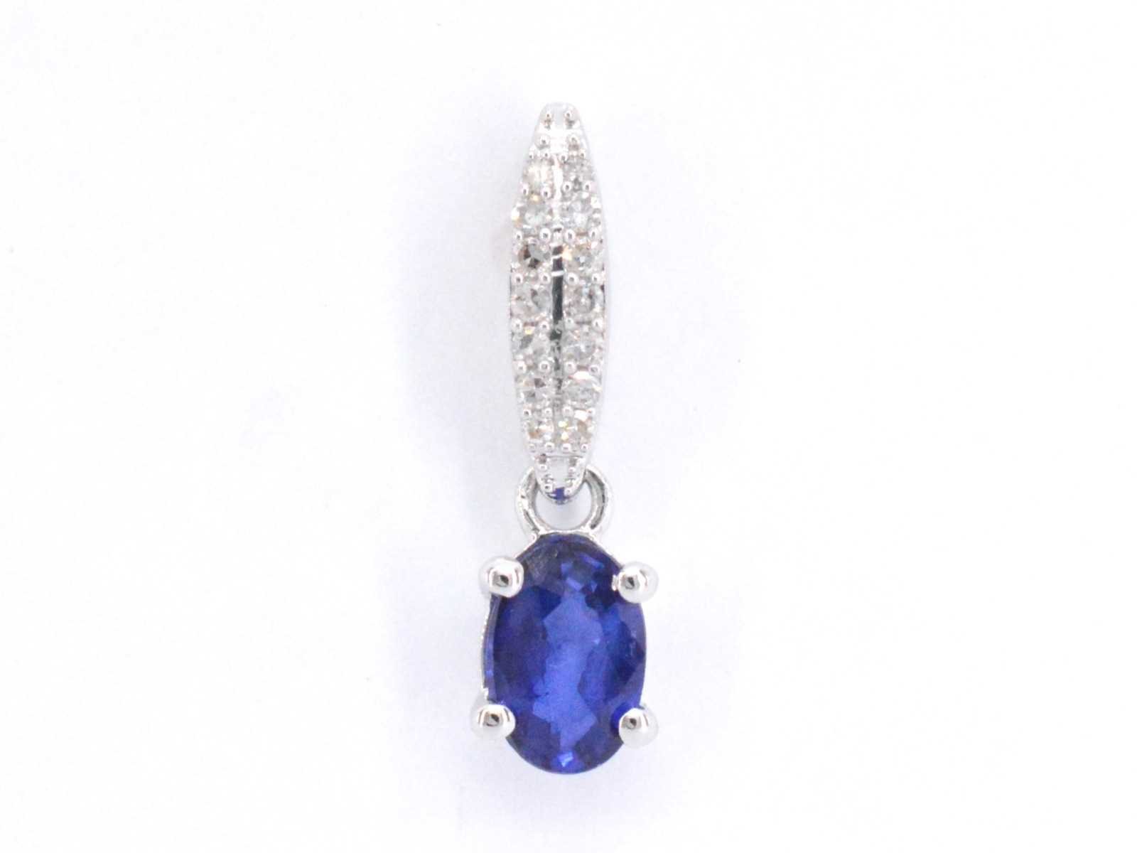 Samenvatting van gegevens Witgouden entourage hanger met diamanten en saffier Diamant: Natuurlijk; Slijpvorm: Rond geslepen; Gewicht (carat): 0.08 carat; Kleur: F-G; Zuiverheid: SI-P; Slijpkwaliteit: Zeer mooi; Edelsteen: Saffier; Slijpvorm: Ovaal; Gewicht (carat): 0.65 carat; Juweel: Hanger (excl. ketting); Gewicht: 0.7 gram; Materiaal: 14 karaat (585); Conditie: Nieuw; Verpakking: Luxe sieradendoos; Toelichting: De kwaliteit is overgenomen van het rapport behorend bij item. Within 14 days Voornaamste diamant: Natuurlijk Kleur diamant: F-G Gewicht diamant: 0.08ct Slijpvorm diamant: Rond geslepen Slijpkwaliteit diamant: Zeer mooi Zuiverheidsgraad diamant: SI-P Edelsteen: Saffier Slijpvorm edelsteen: Ovaal Totaal gewicht: 0.7g Keurmerk: 585 Lage schatting: 462.40000000000003€ Hoge schatting: 578€