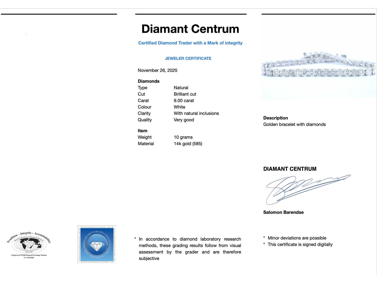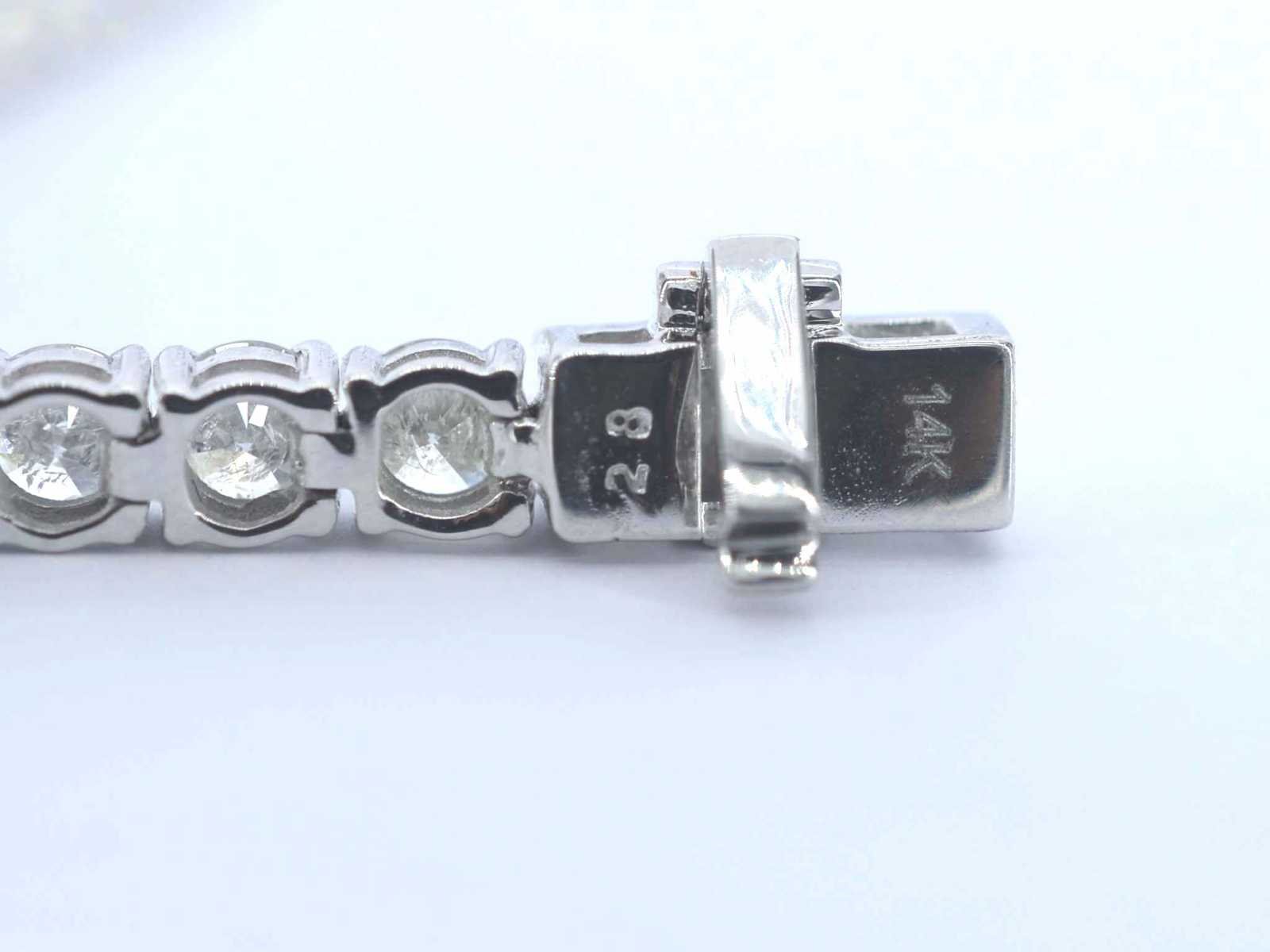 Samenvatting van gegevens Witgouden tennisarmband met natuurlijke briljant geslepen diamanten Diamant: Natuurlijk; Aantal: 48 stuks; Slijpvorm: Briljant geslepen; Gewicht (carat): 9.00 carat; Kleur: Wit; Zuiverheid: Met natuurlijke insluitsels; Slijpkwaliteit: Zeer mooi; Juweel: Armband; Gewicht: 10 gram; Afmetingen/lengte: 17 cm; Materiaal: 14k goud (585); Conditie: Nieuw; Verpakking: Luxe sieradendoos; Toelichting: De kwaliteit is overgenomen van het rapport behorend bij item. Within 14 days Materiaal: Goud Voornaamste diamant: Natuurlijk Kleur diamant: Wit Gewicht diamant: 9.00ct Slijpvorm diamant: Briljant geslepen Slijpkwaliteit diamant: Zeer mooi Zuiverheidsgraad diamant: Met natuurlijke insluitsels Totaal gewicht: 10g Keurmerk: 585 Lage schatting: 15360€ Hoge schatting: 19200€