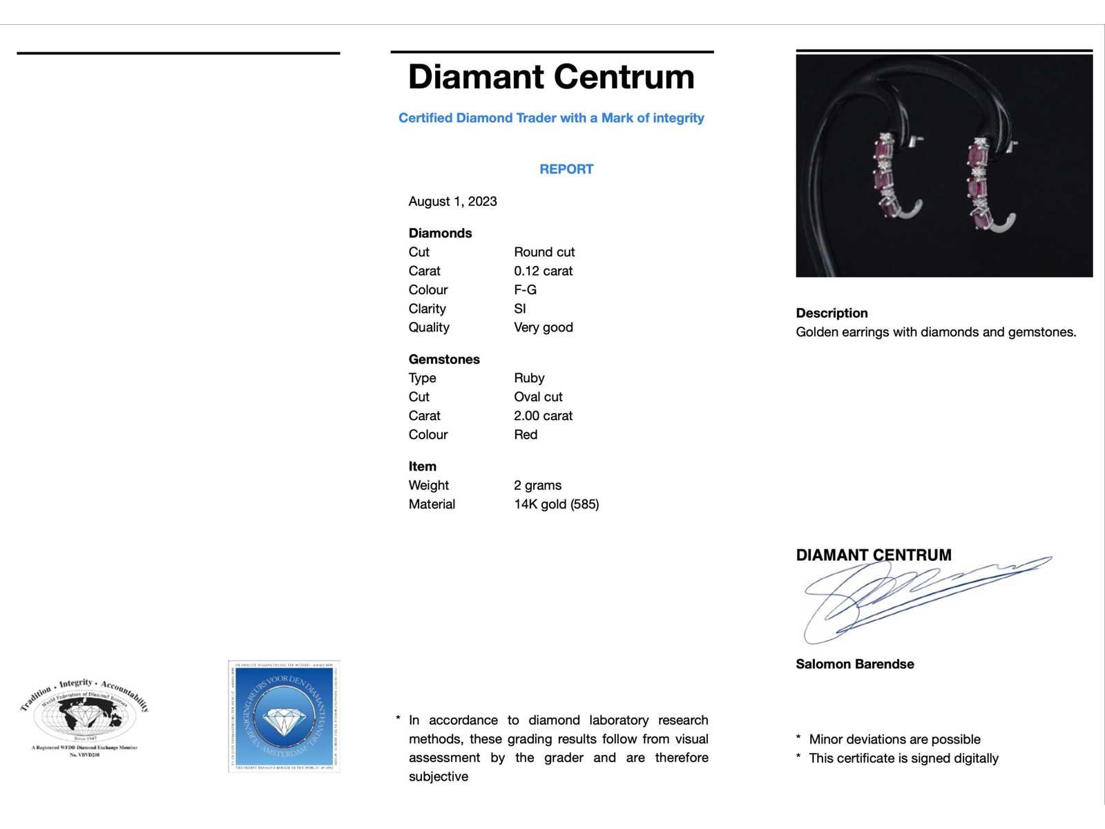 Samenvatting van gegevens Witgouden oorbellen met diamanten en robijn Diamant: Natuurlijk; Slijpvorm: Rond geslepen; Gewicht (carat): 0.12 carat; Kleur: F-G; Zuiverheid: SI; Slijpkwaliteit: Zeer mooi; Edelsteen: robijn; Slijpvorm: Ovaal; Gewicht (carat): 2.00 carat; Kleur: rood; Juweel: Oorbellen; Gewicht: 2 gram; Afmetingen/lengte: 20 x 16 mm; Materiaal: 14 karaat (585); Conditie: Nieuw; Verpakking: Luxe sieradendoos; Toelichting: De kwaliteit is overgenomen van het rapport behorend bij item. Within 14 days Voornaamste diamant: Natuurlijk Kleur diamant: F-G Gewicht diamant: 0.12ct Slijpvorm diamant: Rond geslepen Slijpkwaliteit diamant: Zeer mooi Zuiverheidsgraad diamant: SI Edelsteen: robijn Kleur edelsteen: rood Slijpvorm edelsteen: Ovaal Totaal gewicht: 2g Keurmerk: 585 Lage schatting: 1540€ Hoge schatting: 1925€