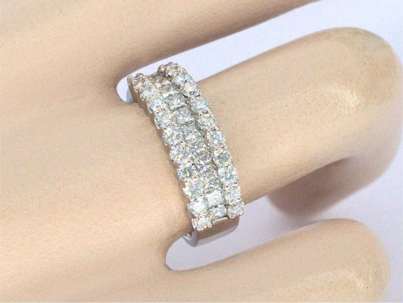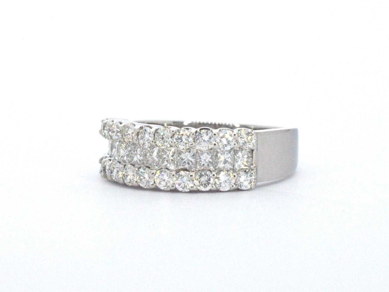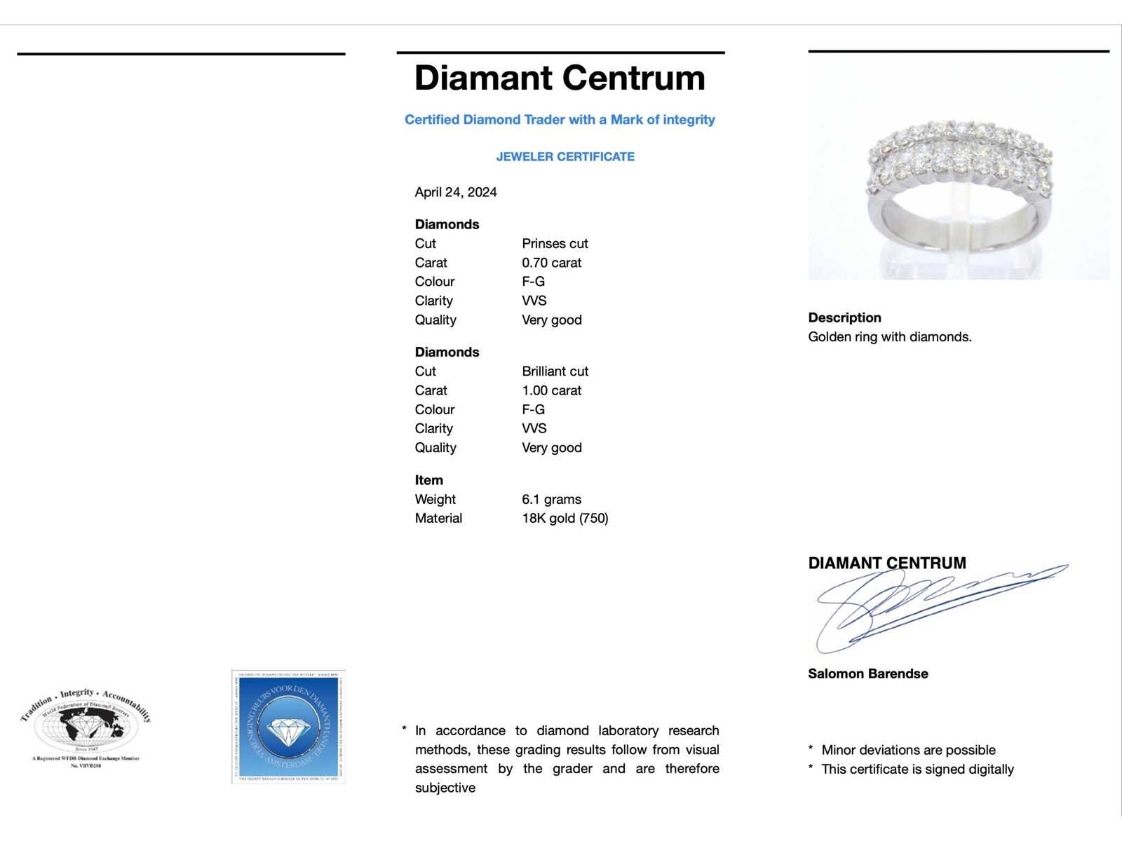 Samenvatting van gegevens Rijring met prinses en briljant geslepen diamanten van hoge kwaliteit Diamant: Natuurlijk; Aantal: 11 stuks; Slijpvorm: Prinses geslepen; Gewicht (carat): 0.70 carat; Kleur: F-G; Zuiverheid: VVS; Diamant (secundair): Diamant; Aantal diamanten: 22 stuks; Slijpvorm: Briljant geslepen; Gewicht (carat): 1.00 carat; Kleur: F-G; Zuiverheid: VVS; Juweel: Ring; Gewicht: 6.1 gram; Ringmaat (op maat gemaakt*): 54 (17.25 mm); Materiaal: 18k goud (750); Conditie: Zo goed als nieuw; Toelichting: De kwaliteit is overgenomen van het rapport behorend bij item. Within 14 days Materiaal: Goud Voornaamste diamant: Natuurlijk Gewicht diamant: 0.70ct Totaal gewicht: 6.1g Keurmerk: 750 Lage schatting: 11200€ Hoge schatting: 14000€ Kleur diamant: F-G Slijpvorm diamant: Prinses geslepen Zuiverheidsgraad diamant: VVS
