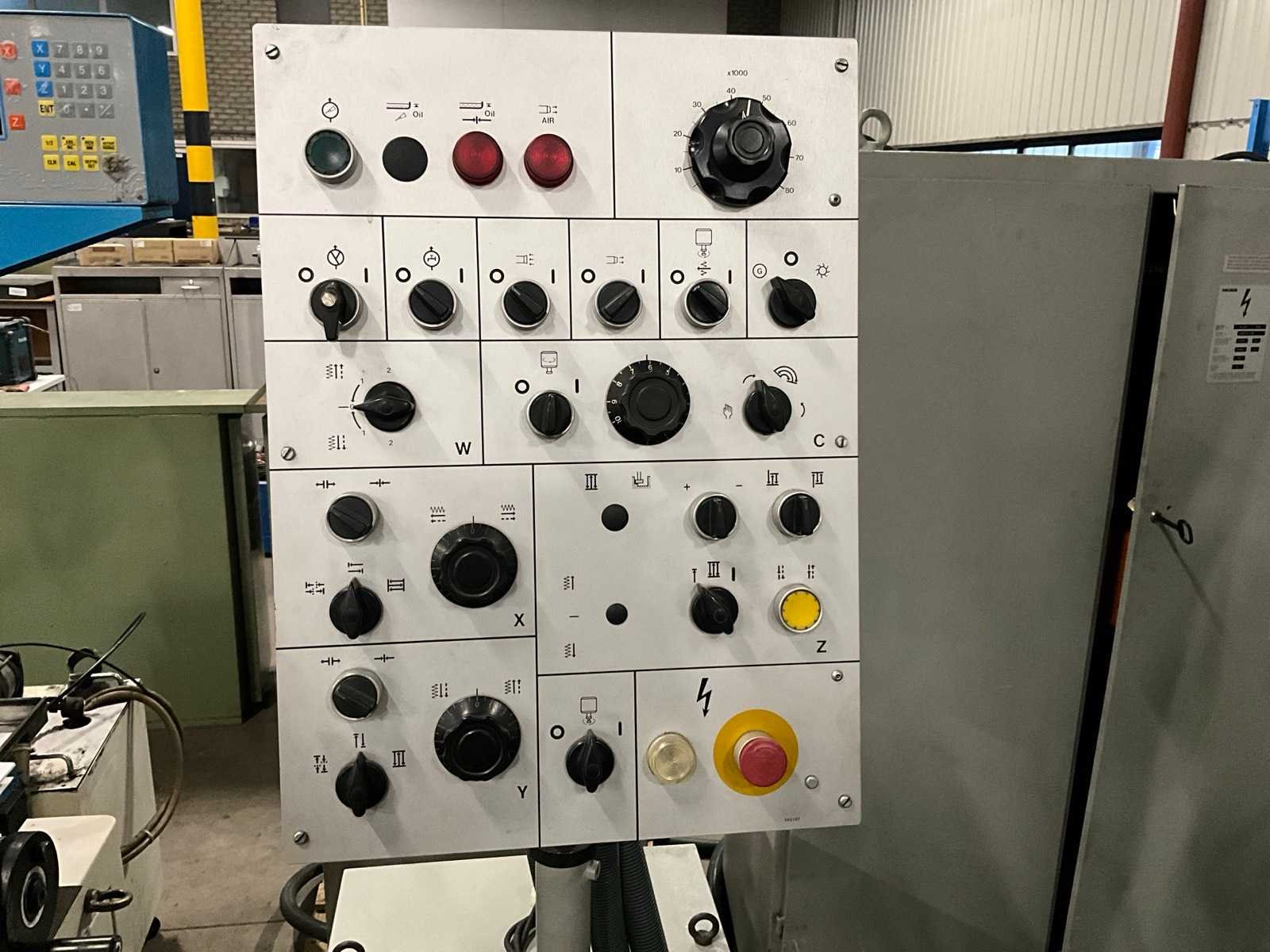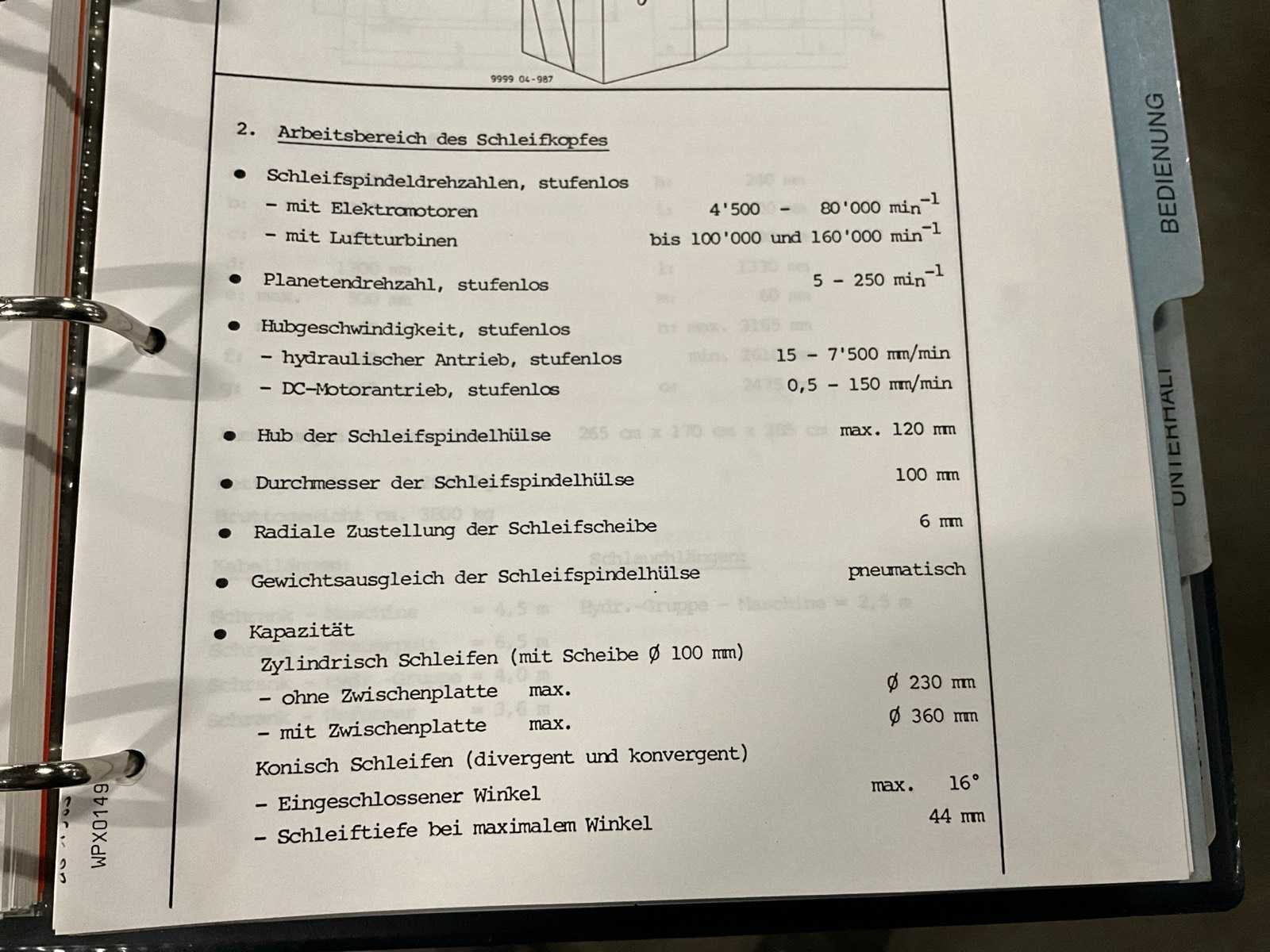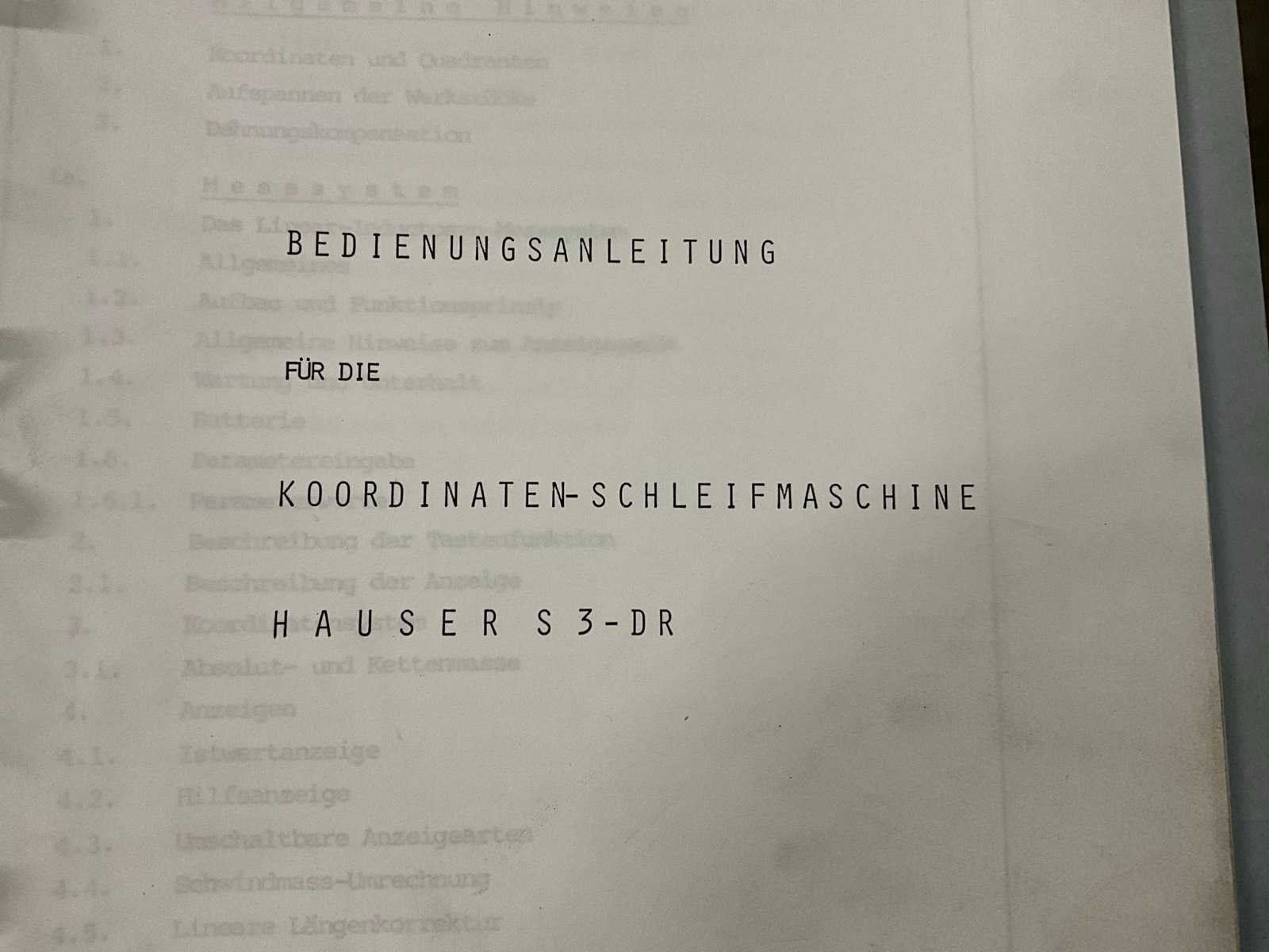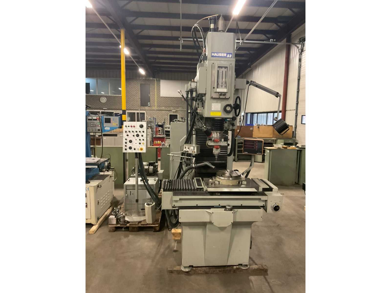 Verplaatsing X-as 400mm, Y-as 250mm, W-as( slijpkop) 450mm, z-as 120mm ( hydraulisch), opspantafel afmeting 600x380 mm, maximaal werkstuk gewicht 300 kg, voorzien van hauser carrousel opspanplaat, diverse extra slijpkoppen, Elesta visulesta 2 digitaal uitleesvenster, handleiding en installatieschema’s, machine is reeds professioneel gedemonteerd en staat transportklaar Merk: Hauser Type: S3 DR Bouwjaar: 1990 Serienummer: S30612 Aansluiting: 380V Machinegewicht: 3800kg Afmeting l: 1700mm Afmeting b: 1400mm Afmeting h: 3100mm