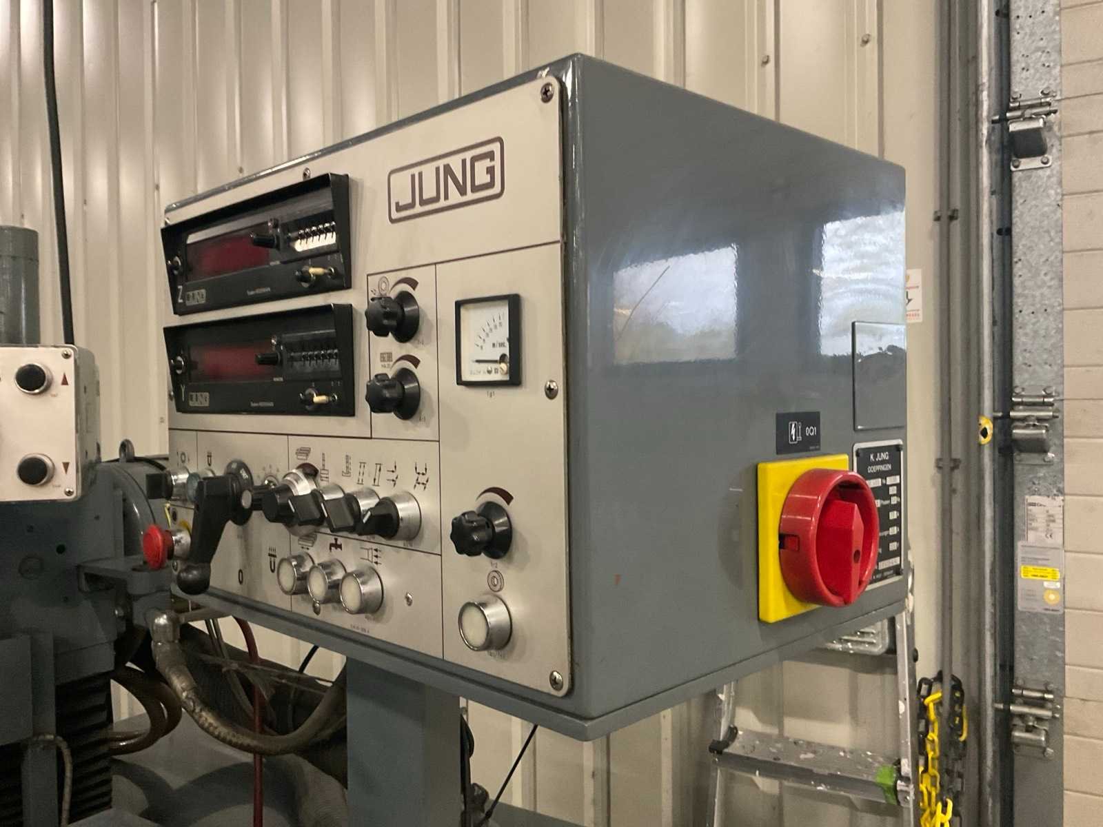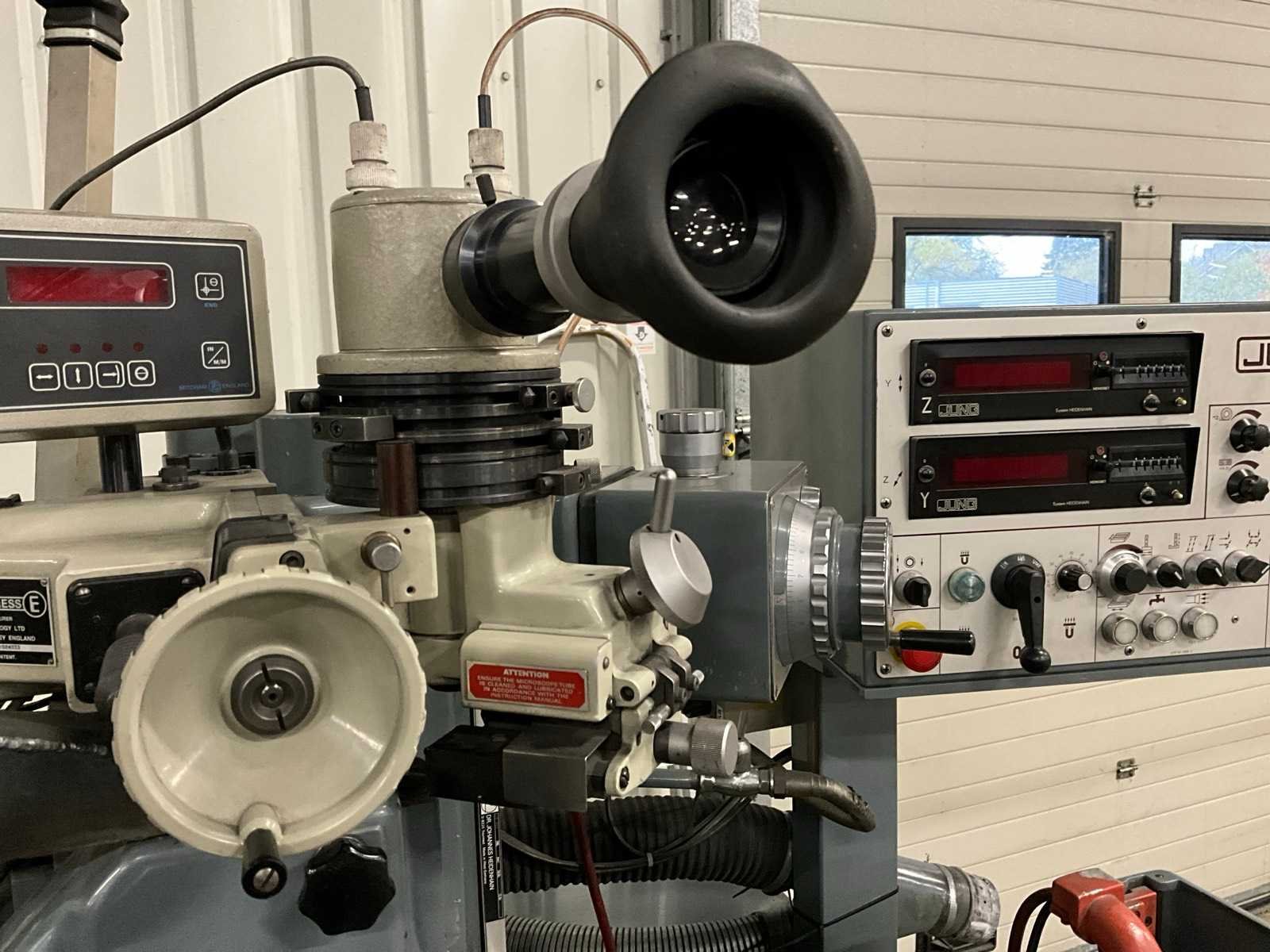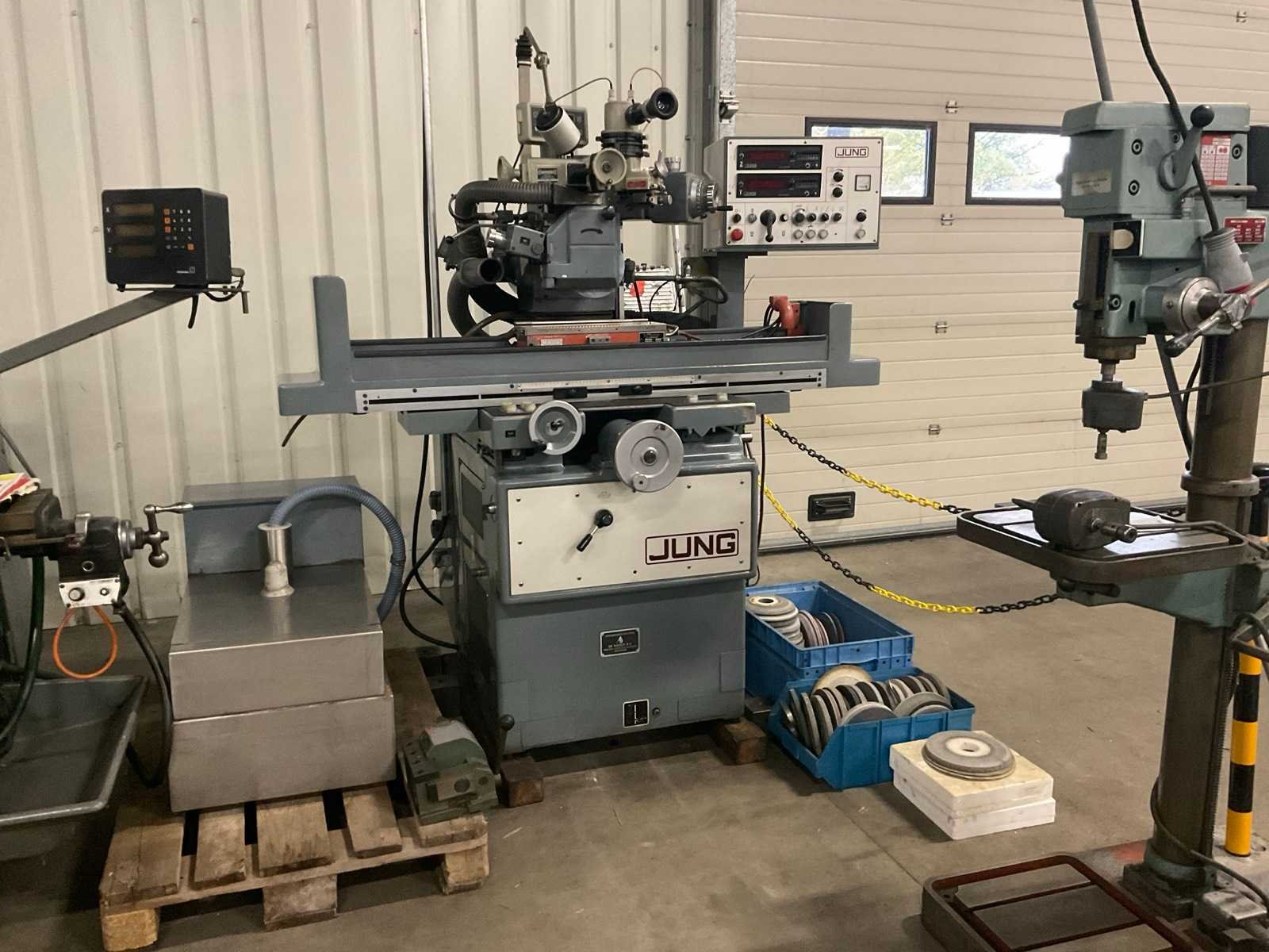 Voorzien van optidress microscoop inrichting, digitale positie uitlezing, jung magneettafel, rvs filterbak, partij extra slijpstenen, machine staat reeds transportklaar Merk: Jung Type: JF415 Bouwjaar: 1984 Serienummer: 1285 Tafel afmeting l: 150mm Tafel afmeting b: 550mm Slijpsteen Ø: 200mm Slijpsteen dikte: 35mm Magnetische opspantafel afm.: 400mm Besturing, merk, type: Heidenhain Aansluiting: 220V Machinegewicht: 1250kg Afmeting l: 1700mm Afmeting b: 1200mm Afmeting h: 2400mm