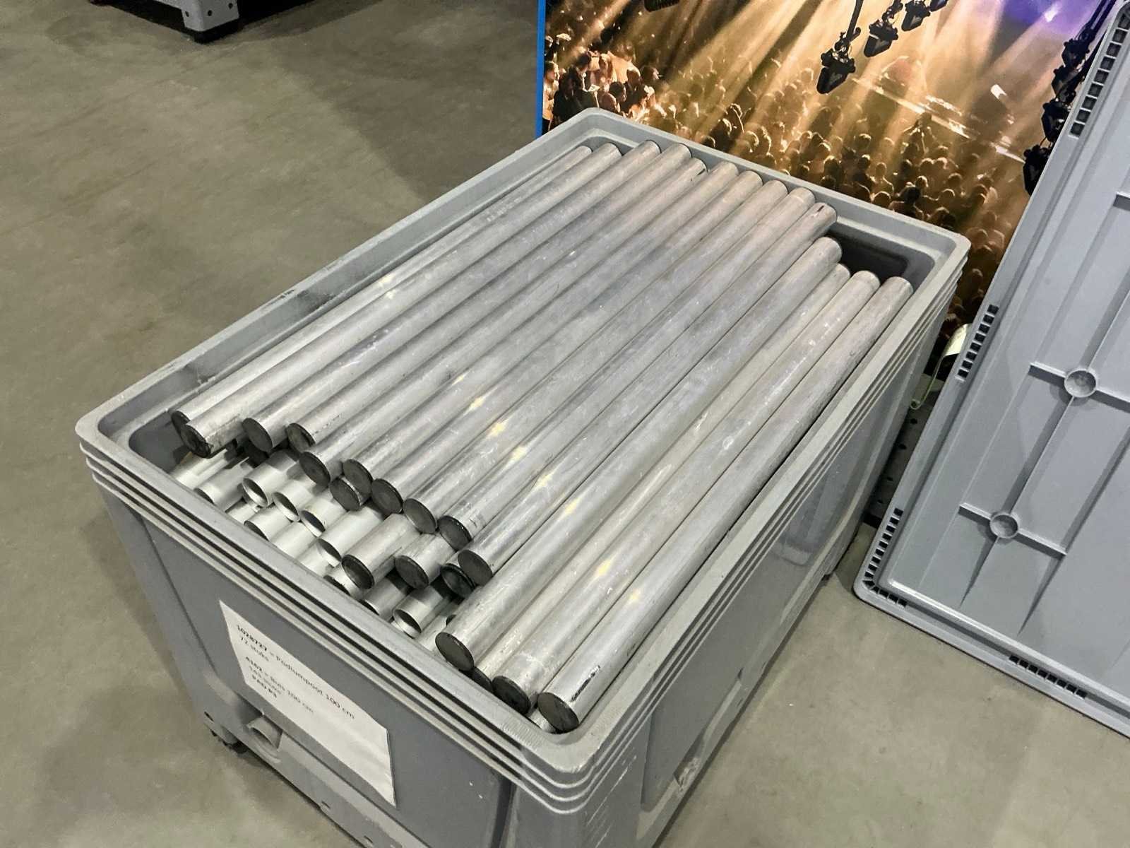 Bestaande uit: Podiumpoten (100 cm, circa 72 stuks), buis (100 cm, circa 143 stuks). Zonder transportkist!