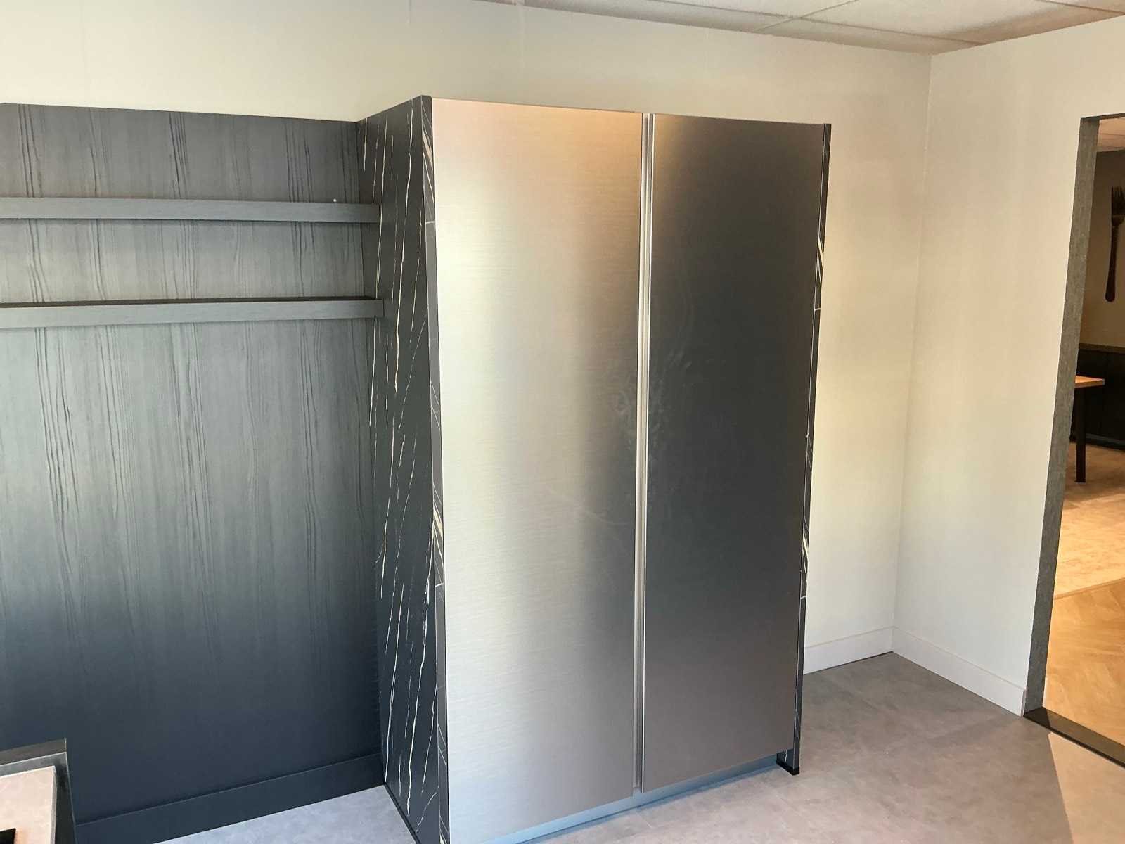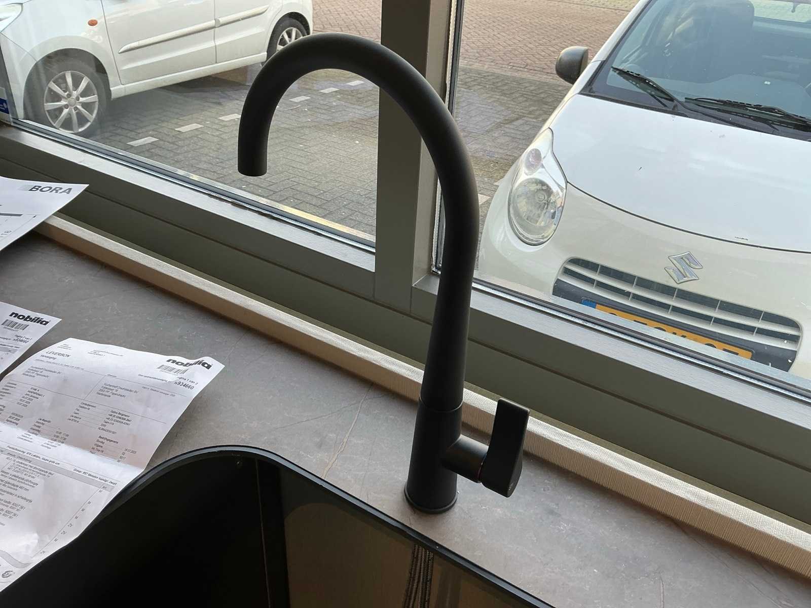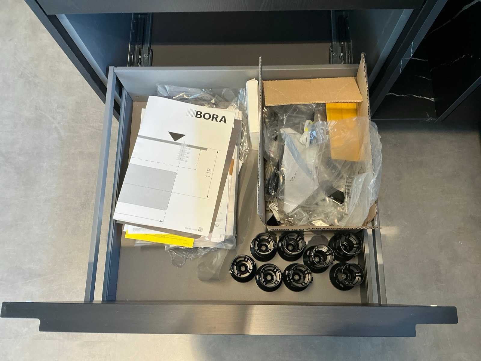 Voorzien van een Bora GP4U inductiekookplaat met afzuiging. Met hoekkast van 60x228cm wandkast met 2 planken 248x60x213cm en voorkast 220x60x50cm Merk: Nobillia Lengte: 318cm Breedte: 220cm Hoogte: 228cm Kraan: Gessi Werkblad hoogte: 94cm Magnetron: AEG BEK43511XB Koelkast: Bosch KG KIVV36A