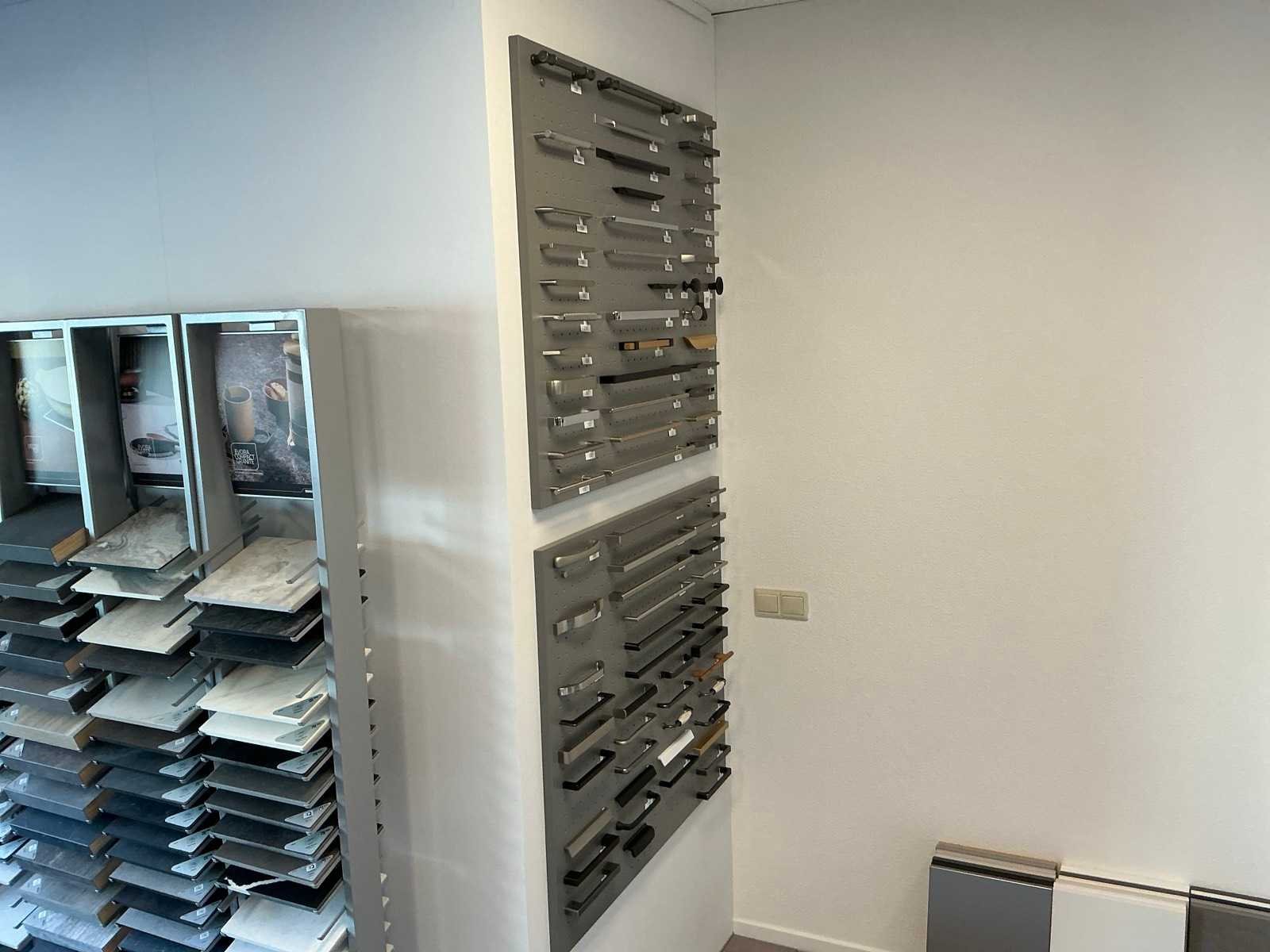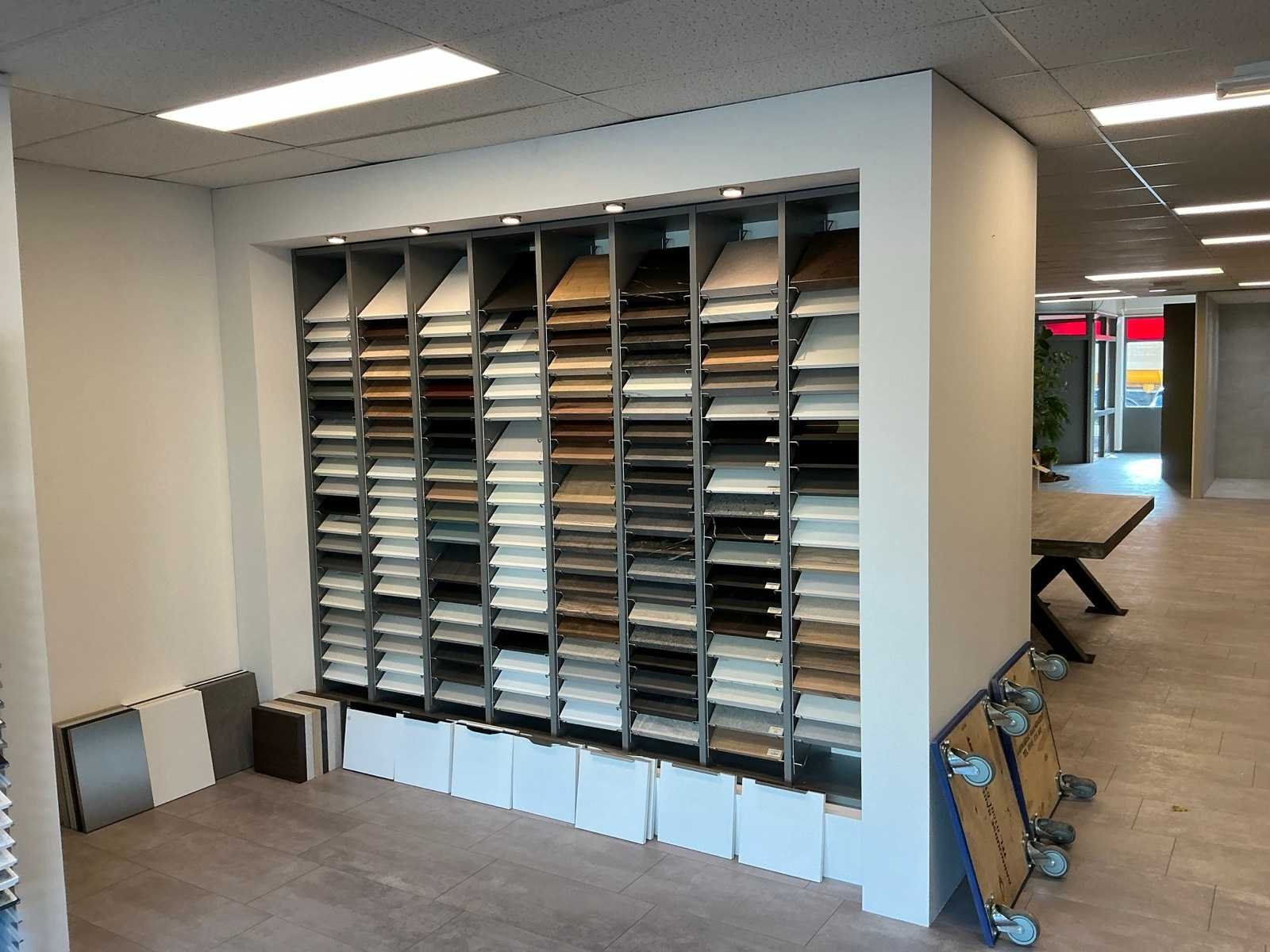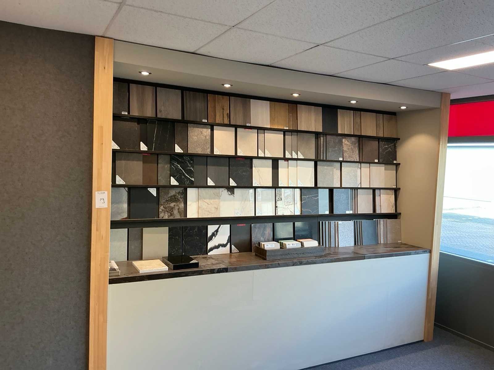Bestaande uit een wandkast met 8 vakken 270x38x200cm, 6 metalen Dekker display’s 30x28x180cm, 2 Cosentino display’s 46x42x200cm. Met de tegelsamples.