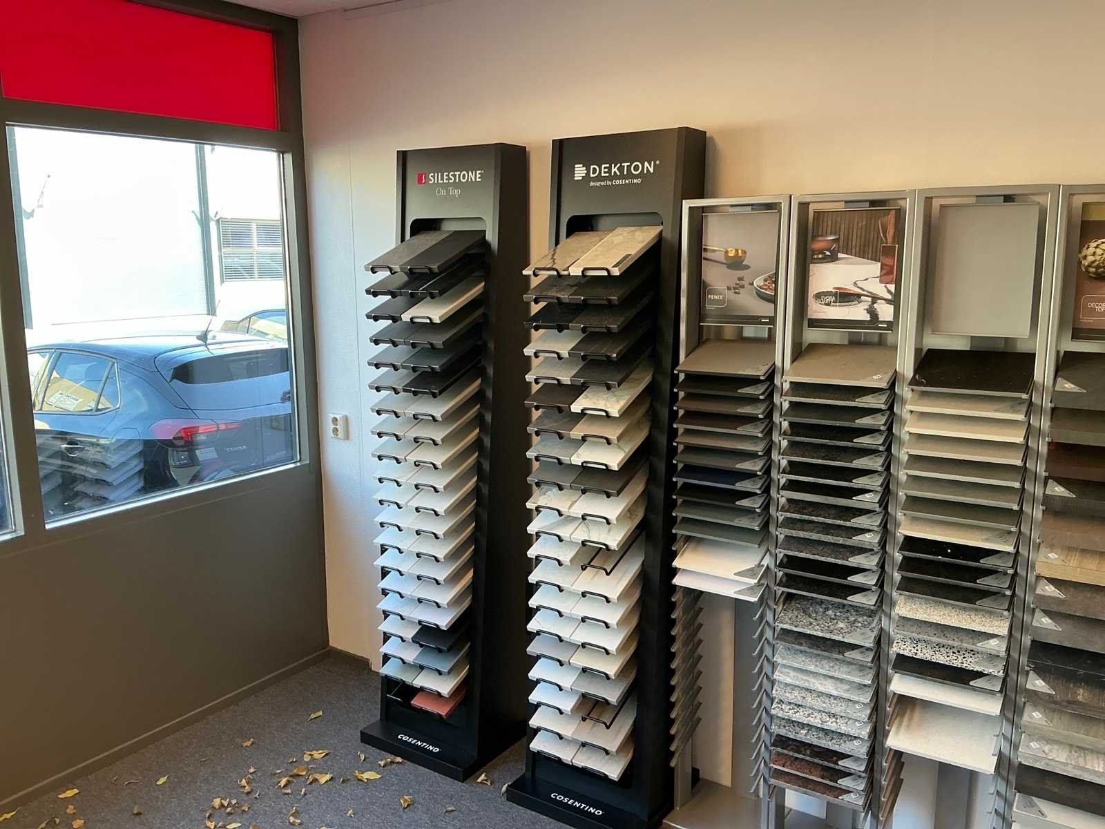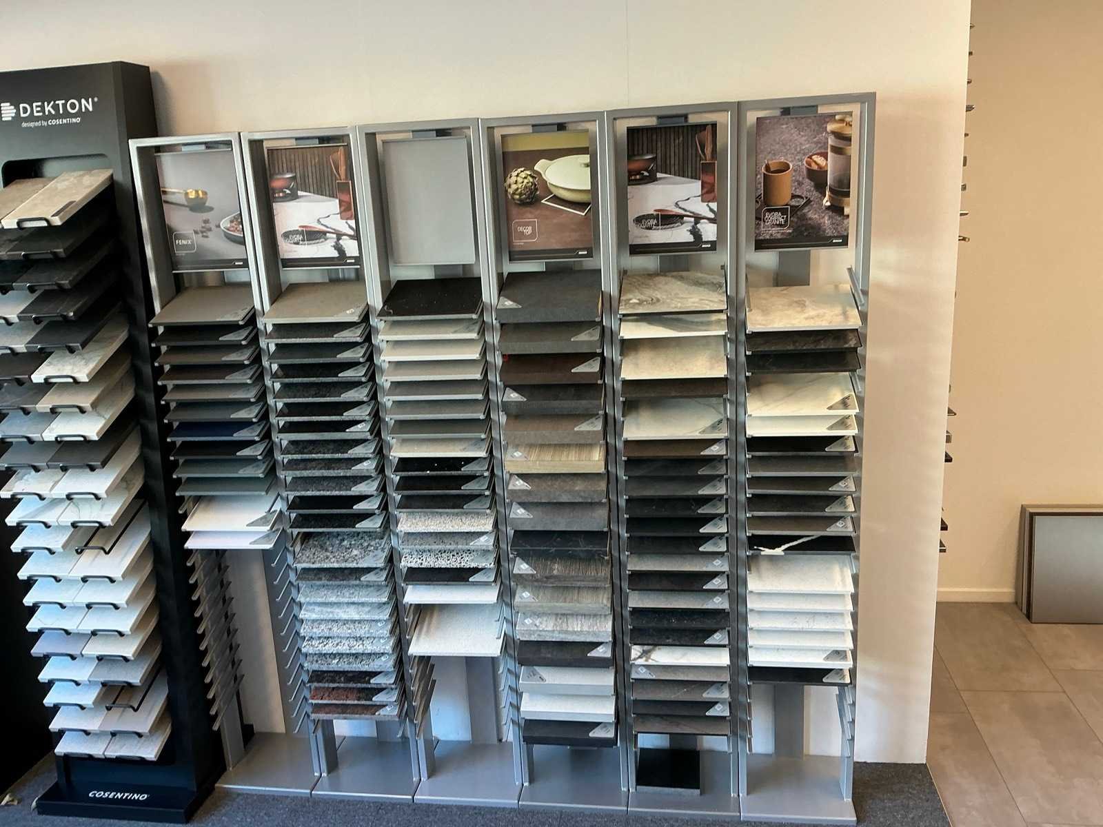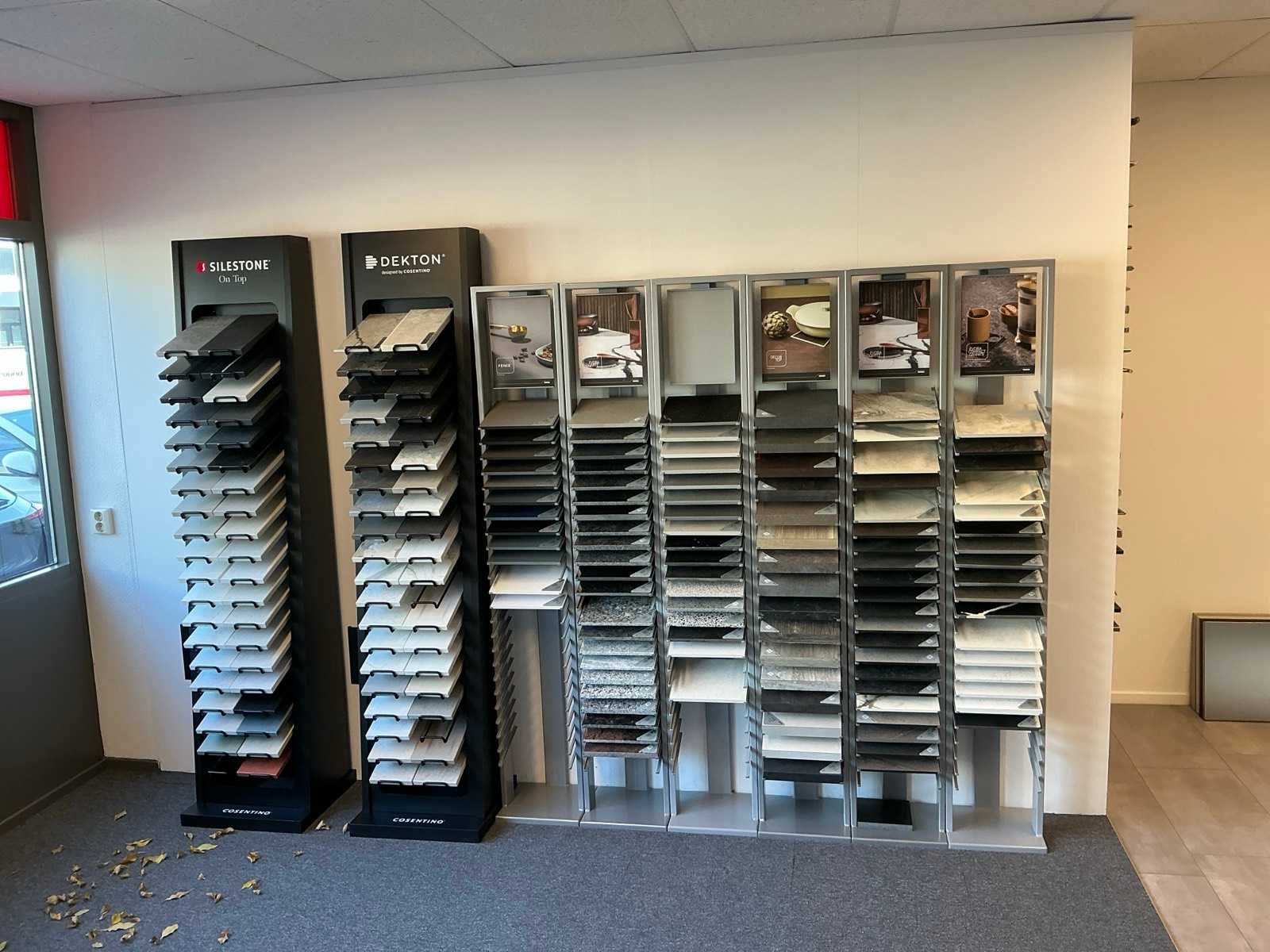 Bestaande uit een wandkast met 8 vakken 270x38x200cm, 6 metalen Dekker display’s 30x28x180cm, 2 Cosentino display’s 46x42x200cm. Met de tegelsamples.