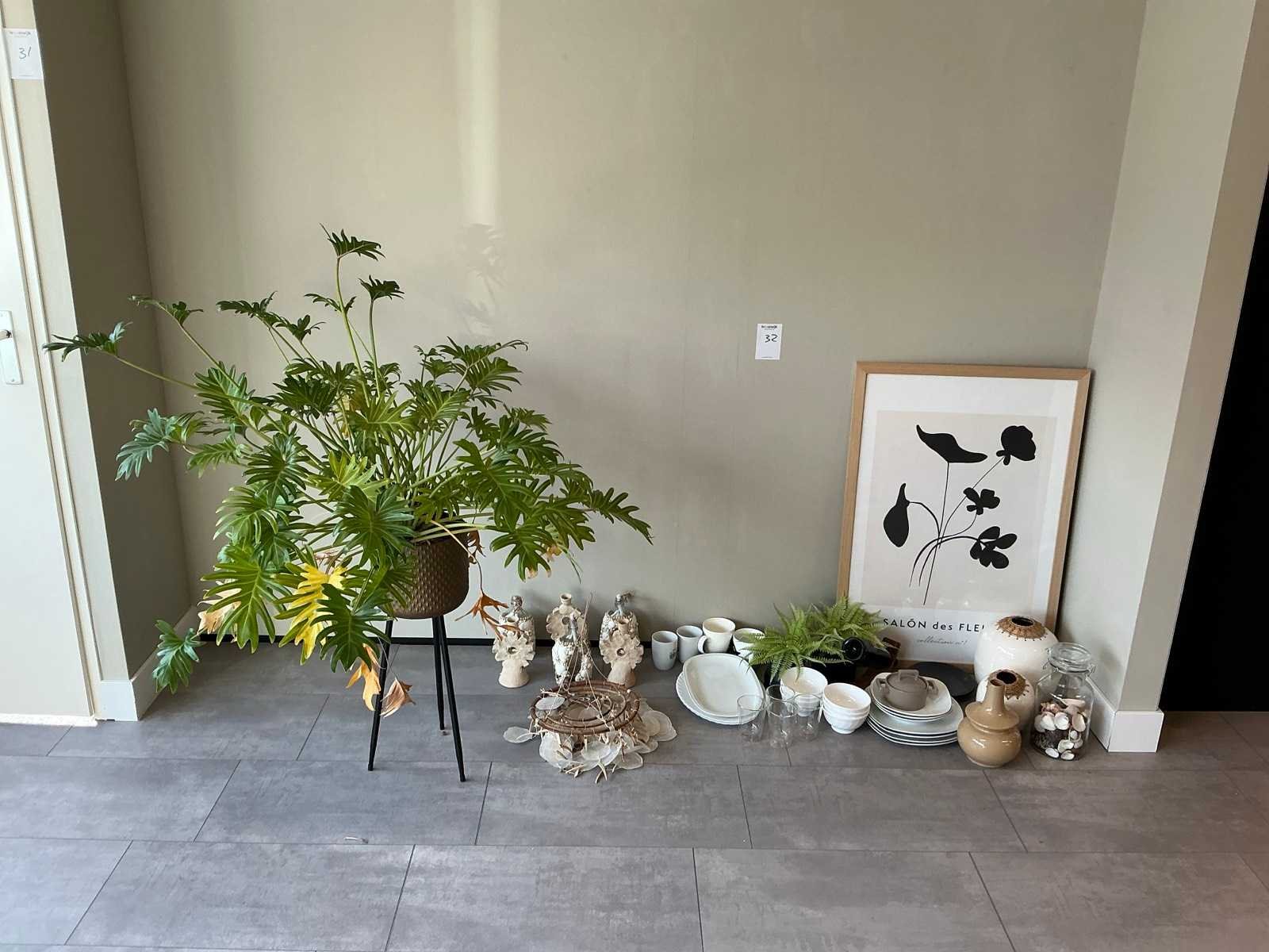 Verschillende soorten en maten waaronder kunstplanten, serviesgoed, wanddecoratie en plant in pot.