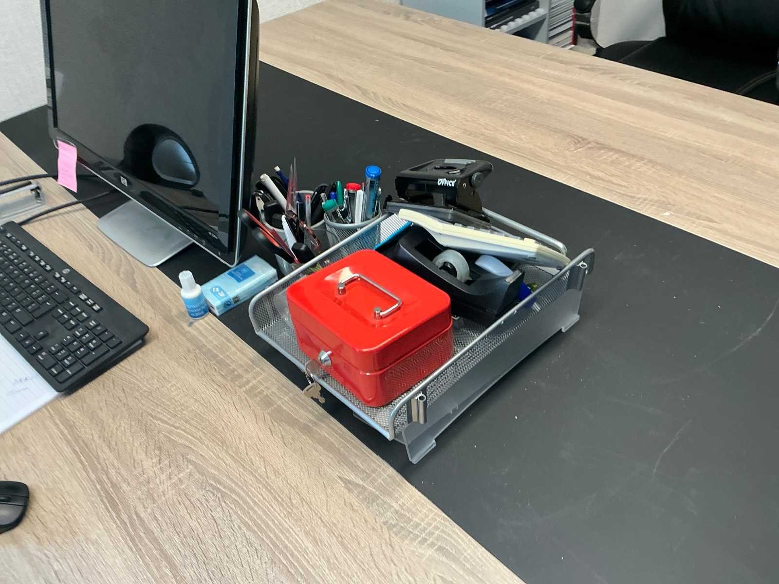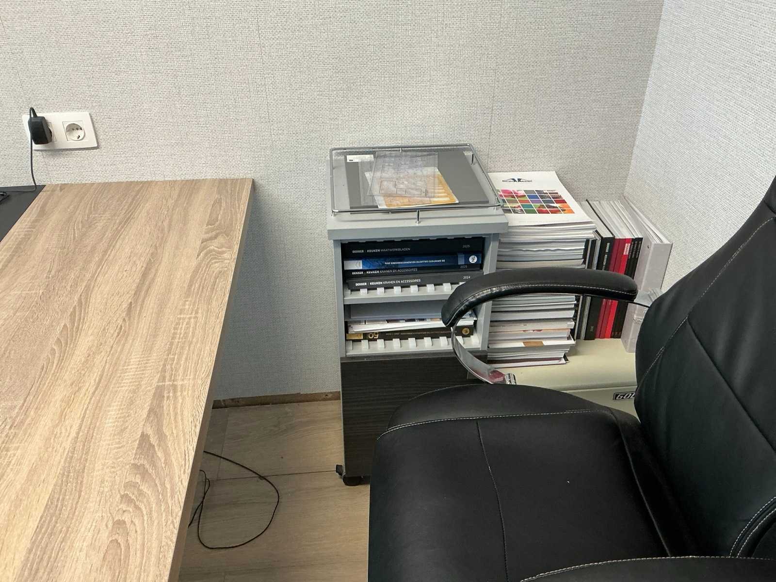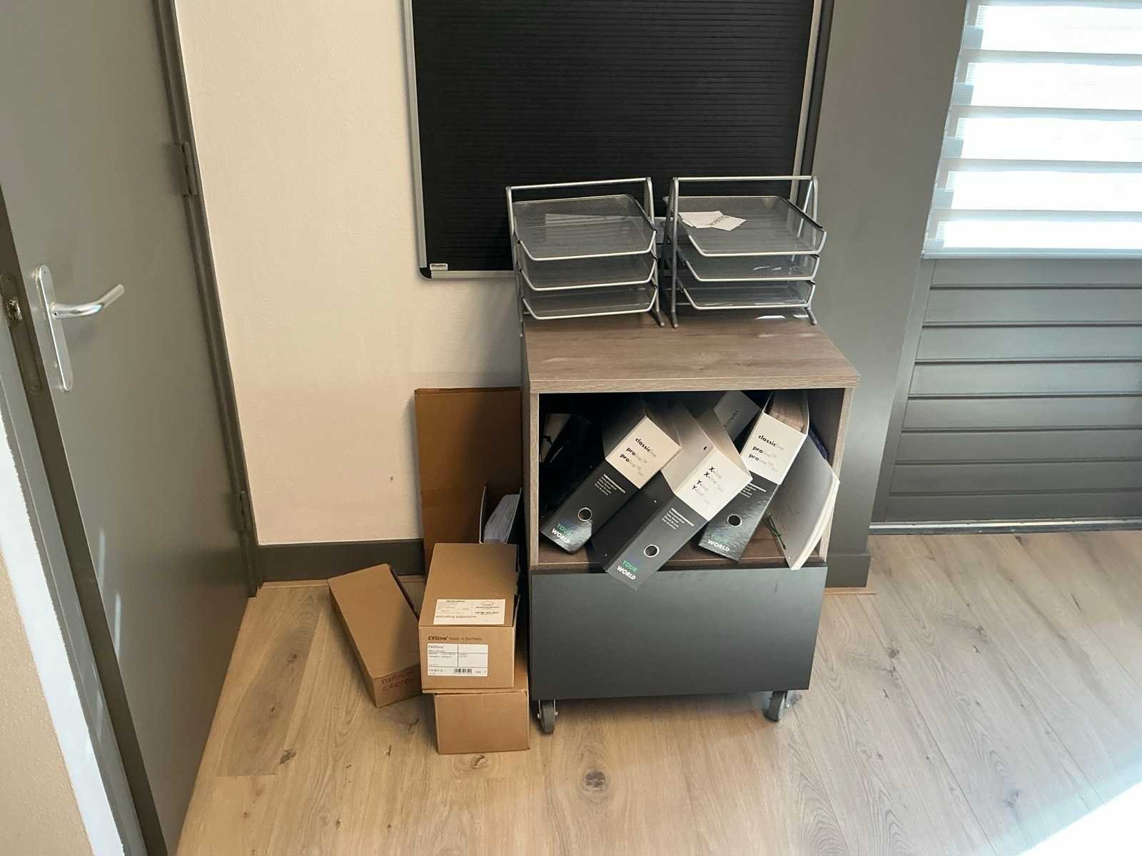 Bestaande uit een duowerkplek met 2 bureaustoelen, 2 verrijdbare kastjes, HP 2310m beeldscherm. Zonder de wandkast met inhoud.