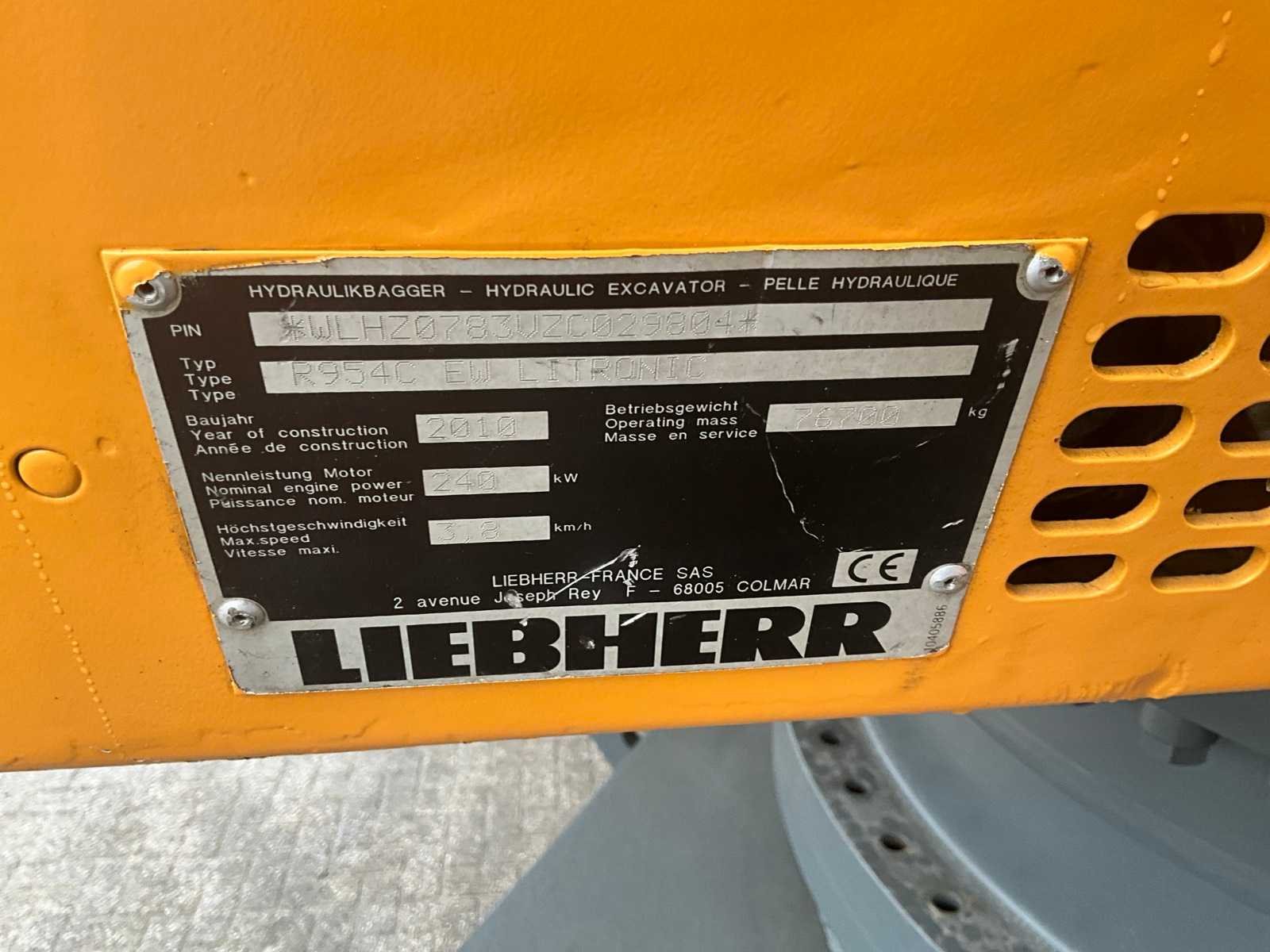 Volgens opgave gereviseerde machine (circa 100 hr motoruren na revisie), voorzien van automatische vetsmering, hydraulische heffende cabine, machine bordes, airco, werkverlichting, zie PDF bestand voor overige informatie Merk: Liebherr Type: R954C EW Litroncic Bouwjaar: 2010 Serienummer: WLHZ0783VZC029804 Merk motor: Liebherr Motorvermogen (kW): 240kW Aantal cilinders: 6 Brandstof: Diesel Bedrijfsgewicht: 76700kg Rups breedte: 600mm Cabine: true Afgelezen urenstand: 15173 Totale afmeting Breedte: 4400mm Totale afmeting Hoogte: 4400mm