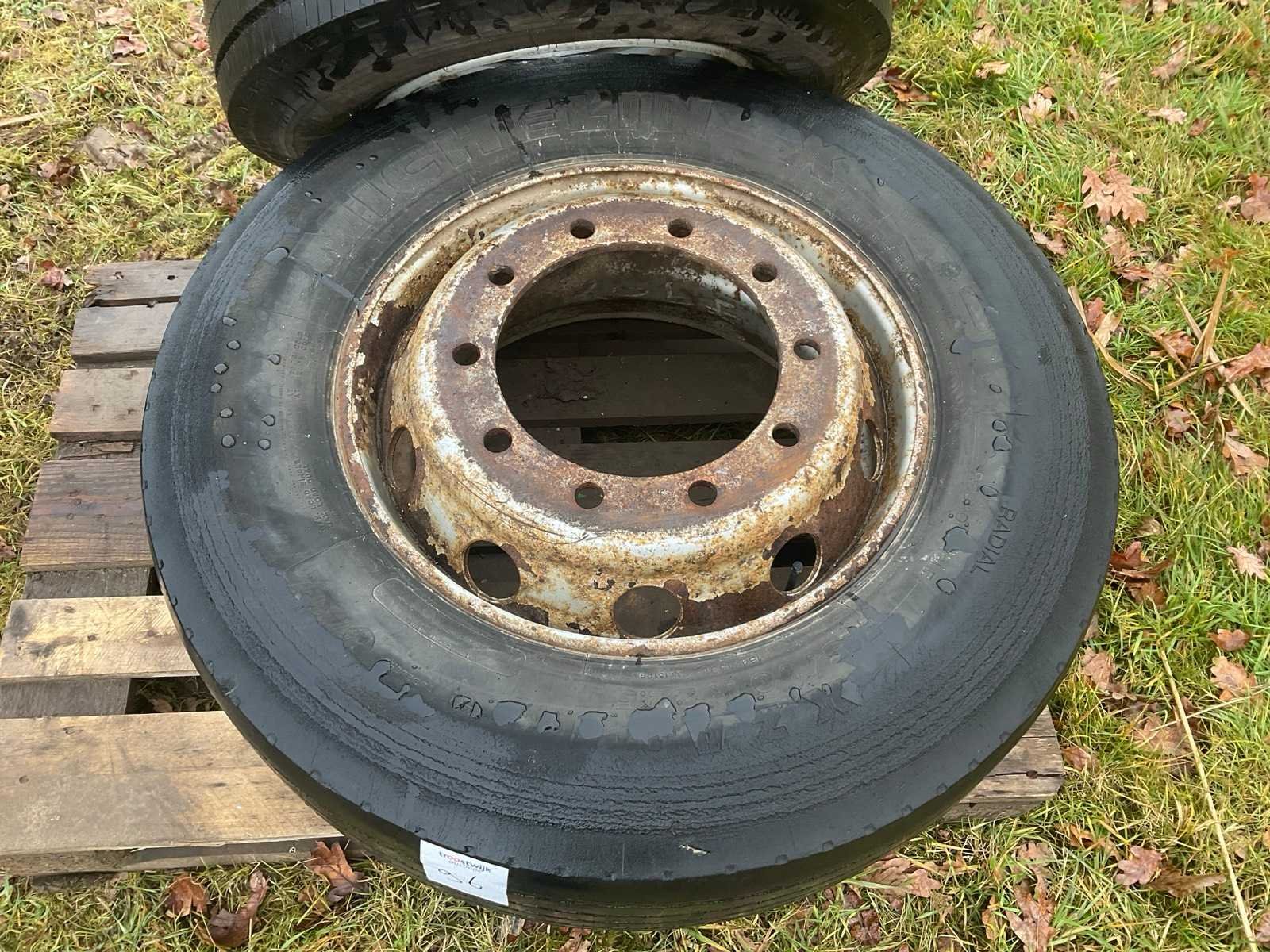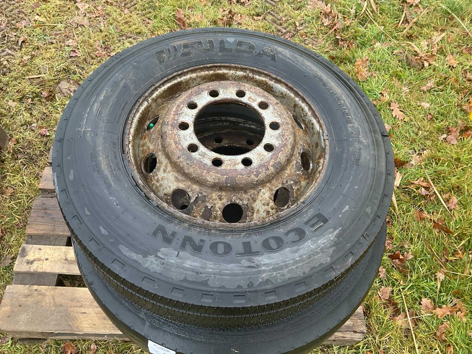 1x Fulda Ecotonn 265/70R19.5 op 10-gaats stalen velg steekmaat 225mm as ø 175mm, 1x Michelin X 315/70R22.5 op 10-gaats stalen velg steekmaat 335mm as 280mm.