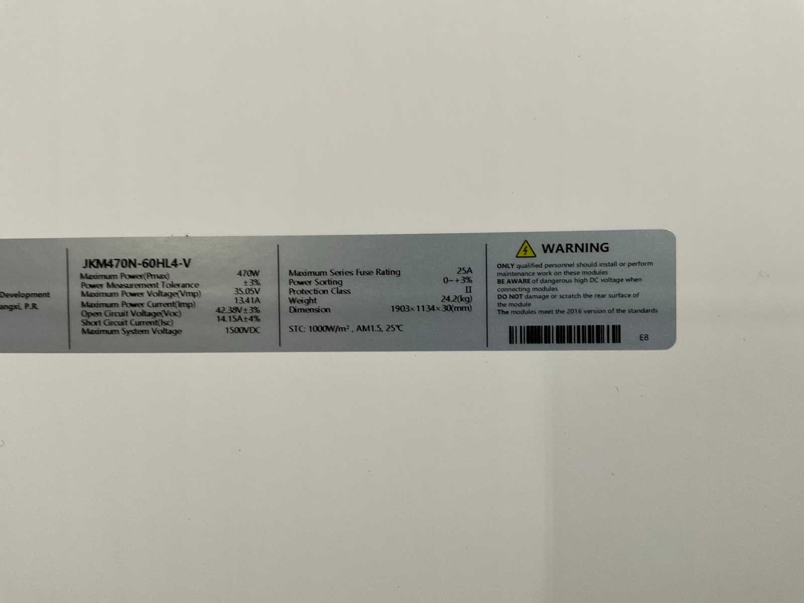 Afmeting per paneel 1903x1134x30mm, ongebruikt Merk: Jinko Max. ac power: 470W Max. ac current: 13.41A Nominal ac output: 35.05V Eigen gewicht: 532kg Totale afmeting L: 1903mm Totale afmeting Breedte: 1134mm Totale afmeting Hoogte: 780mm
