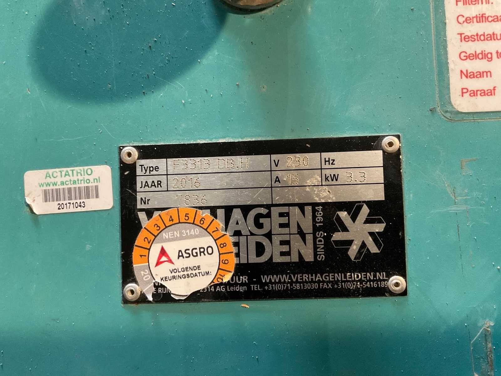 Merk: Verhagen Type: F3313 DB.H Bouwjaar: 2016 Serienummer: 7836 Vermogen: 3.3W Nat/droog zuiger: true Aansluiting: 230V