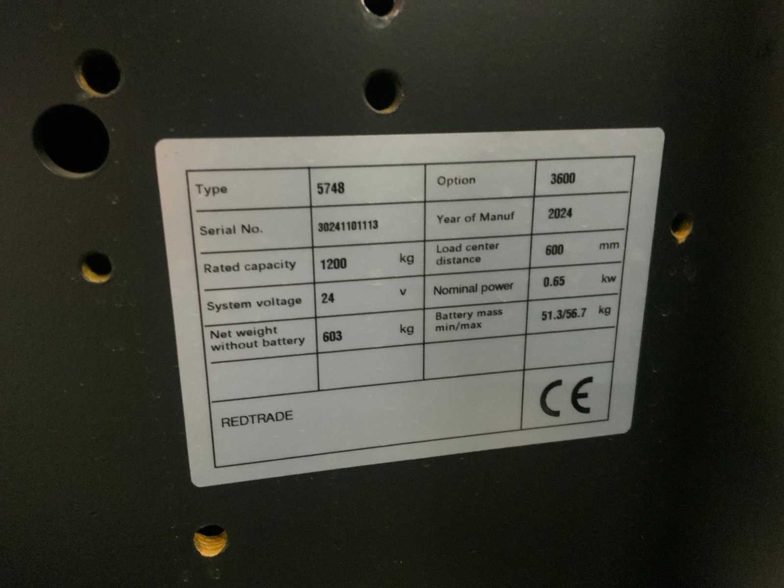 Accu defect; werking onbekend; 24v; power rated 0.65kw; noodstop; 230v laadkabel; codeslot; lepellengte 1150mm; accu's liggen los; 5748 Merk: Noblelift Type: PSE12B36 Bouwjaar: 2023 Hefvermogen: 1200kg Hefhoogte: 3600mm Lepellengte: 1150mm Eigen gewicht: 670kg Totale afmeting L: 1750mm Totale afmeting Breedte: 800mm Totale afmeting Hoogte: 2250mm