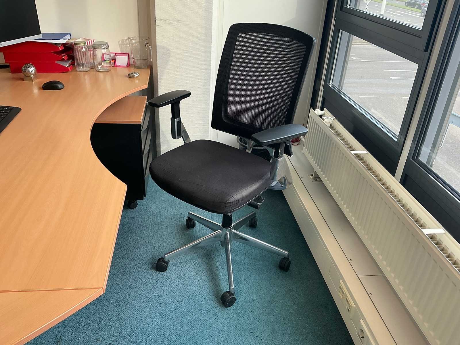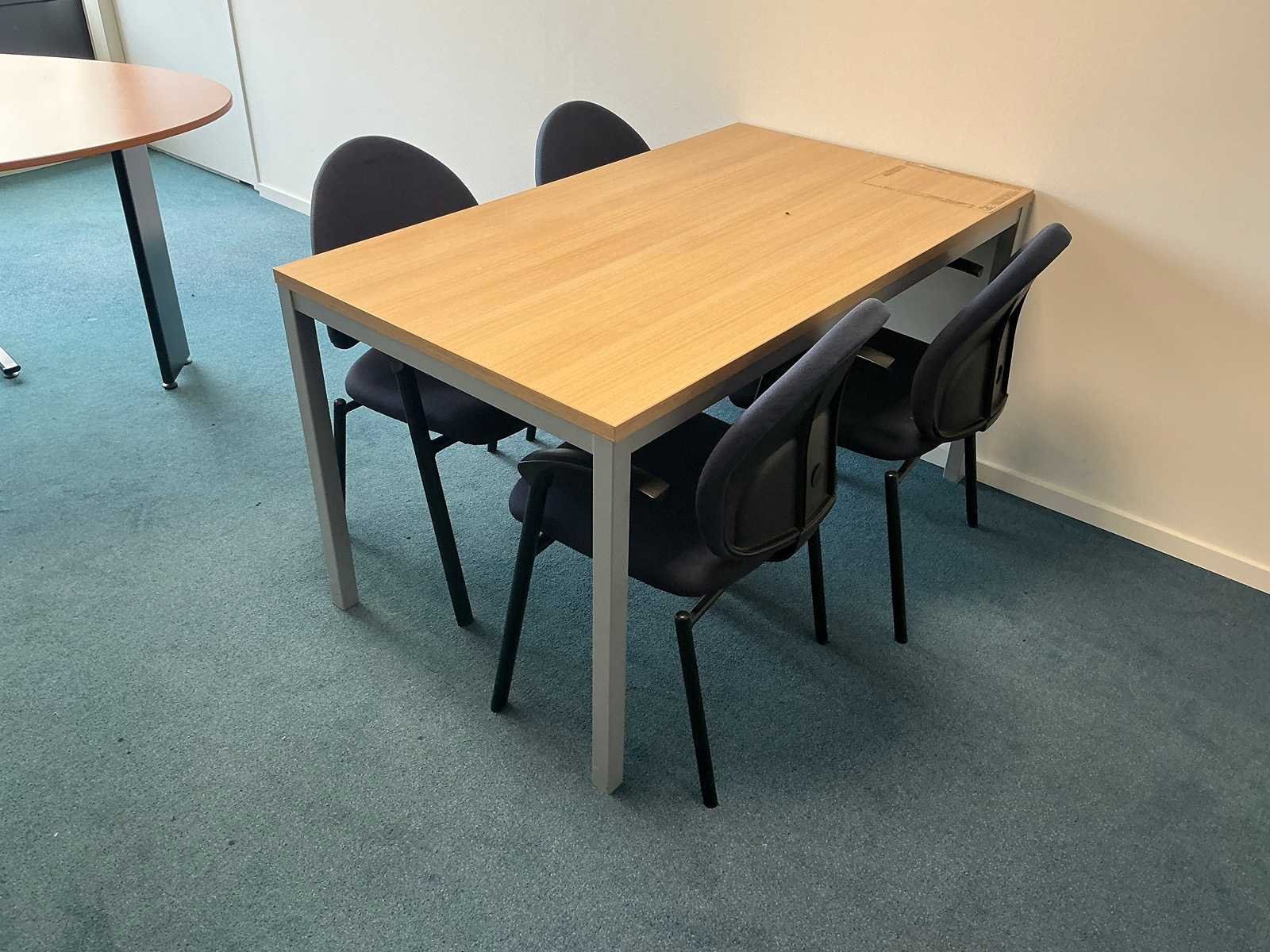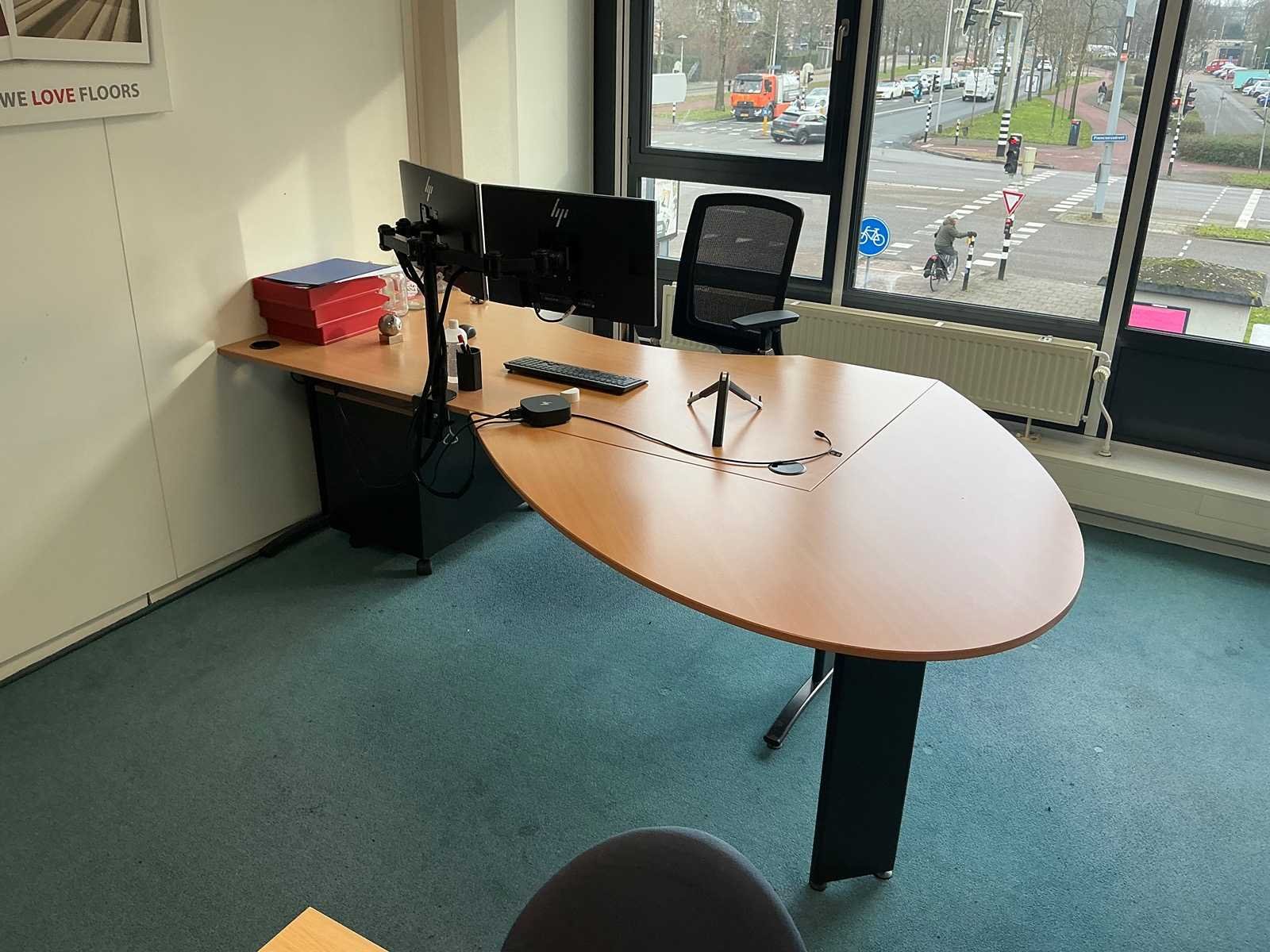 Bestaande uit bureau 260x160x76 cm, tafel 140x80x76 cm, bureaustoel, 4 kantoorstoelen, ladeblok, whiteboard en een dossierkast. Desktops, monitoren en verdere apparatuur niet meegeleverd.