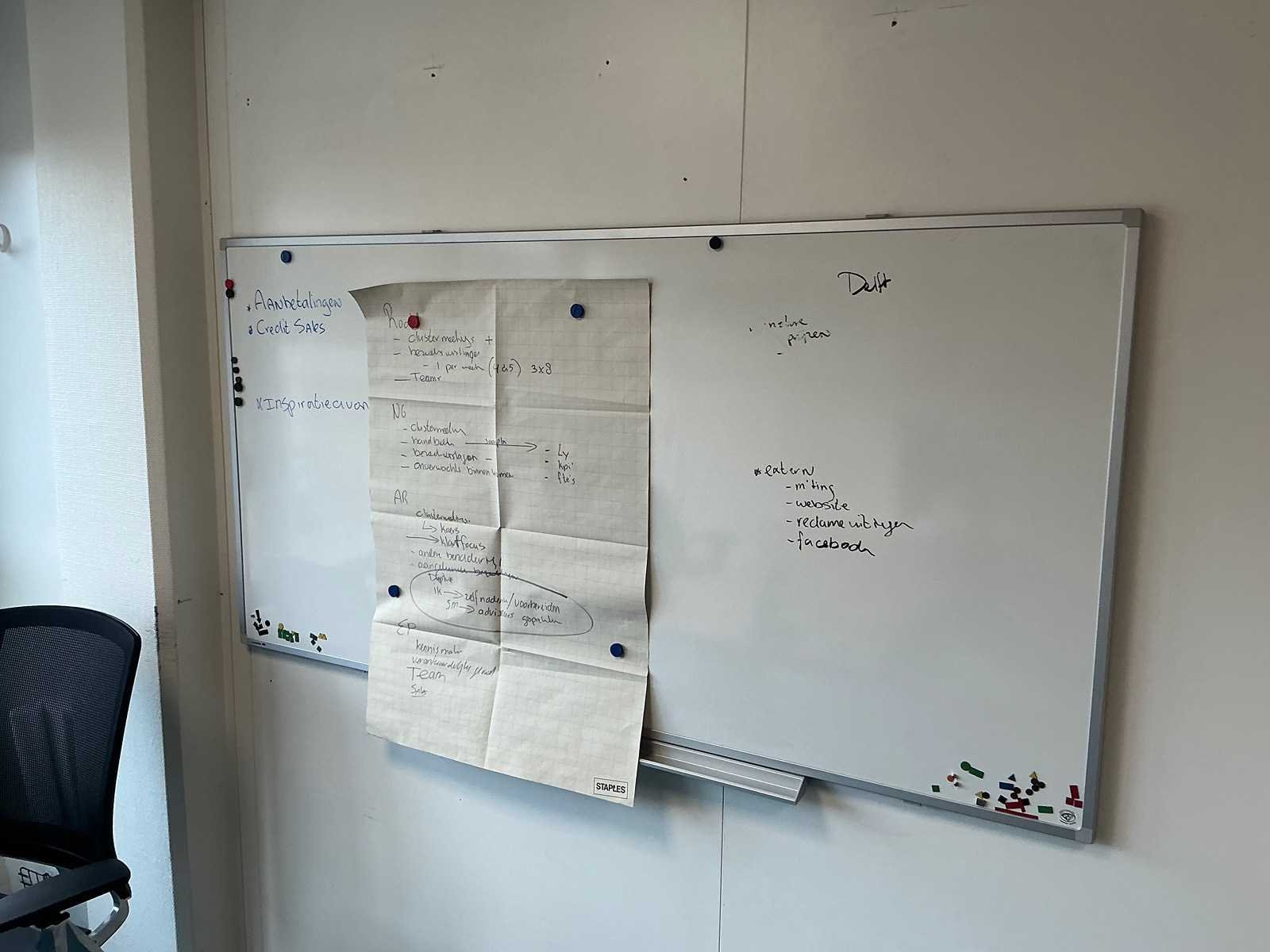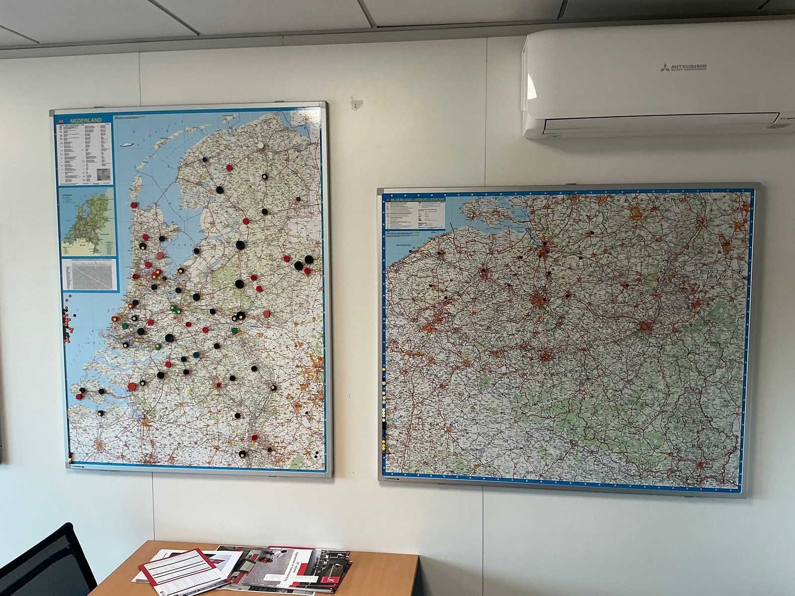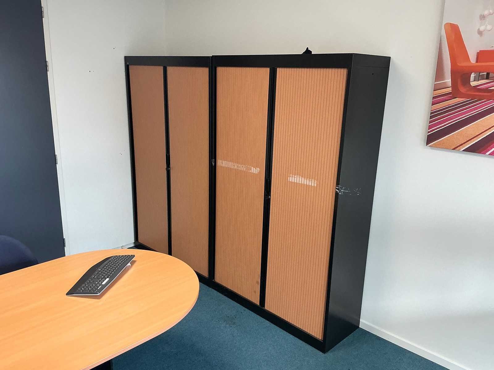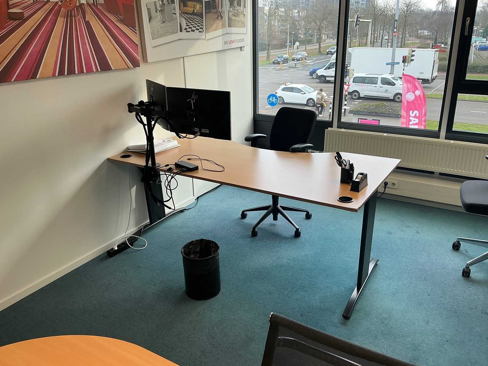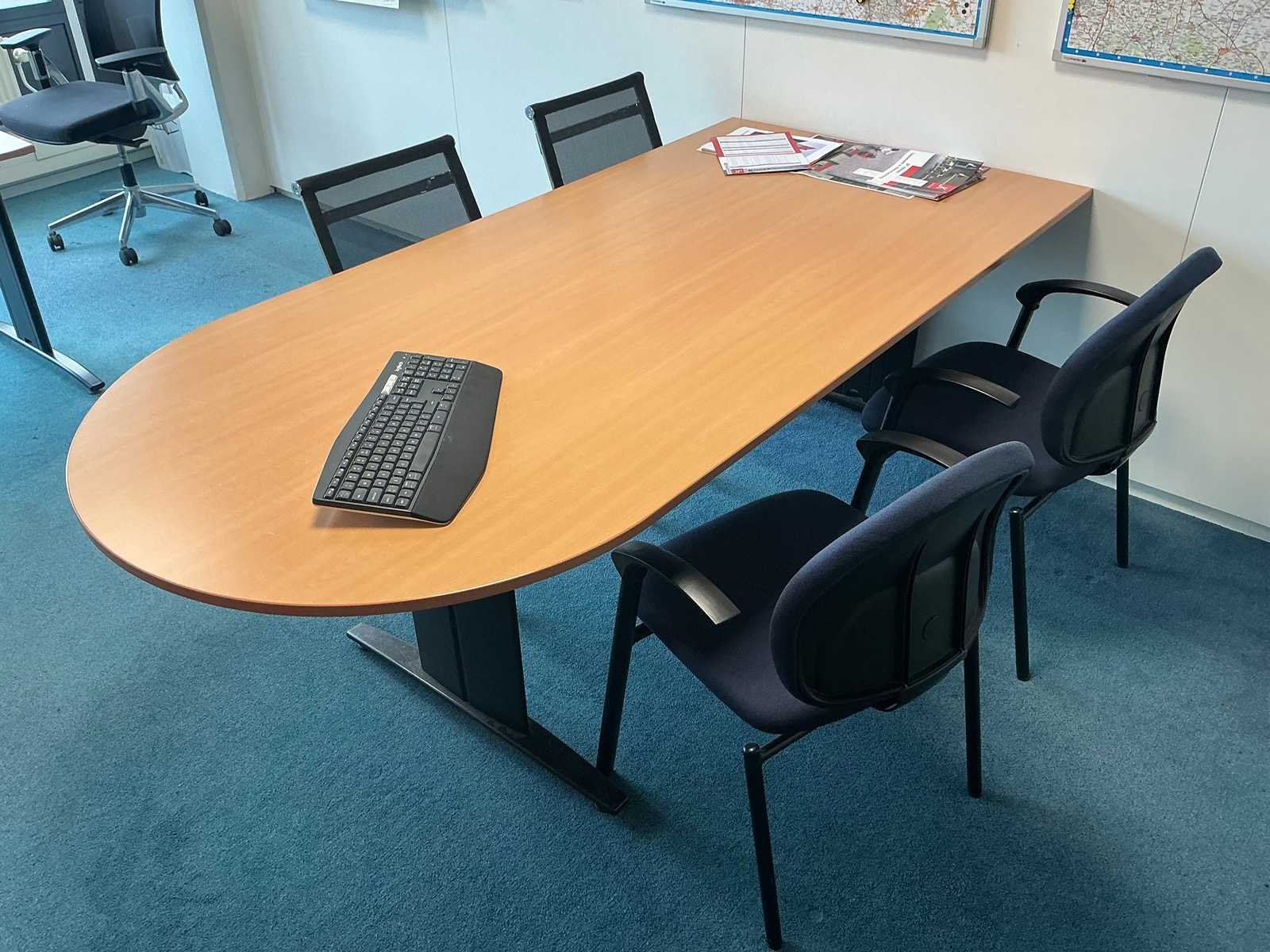 Bestaande uit bureau 200x100x75 cm, tafel 210x100x75 cm, 2 bureaustoelen, 4 kantoorstoelen, whiteboard en 2 dossierkasten. Desktops, monitoren en verdere apparatuur niet meegeleverd.