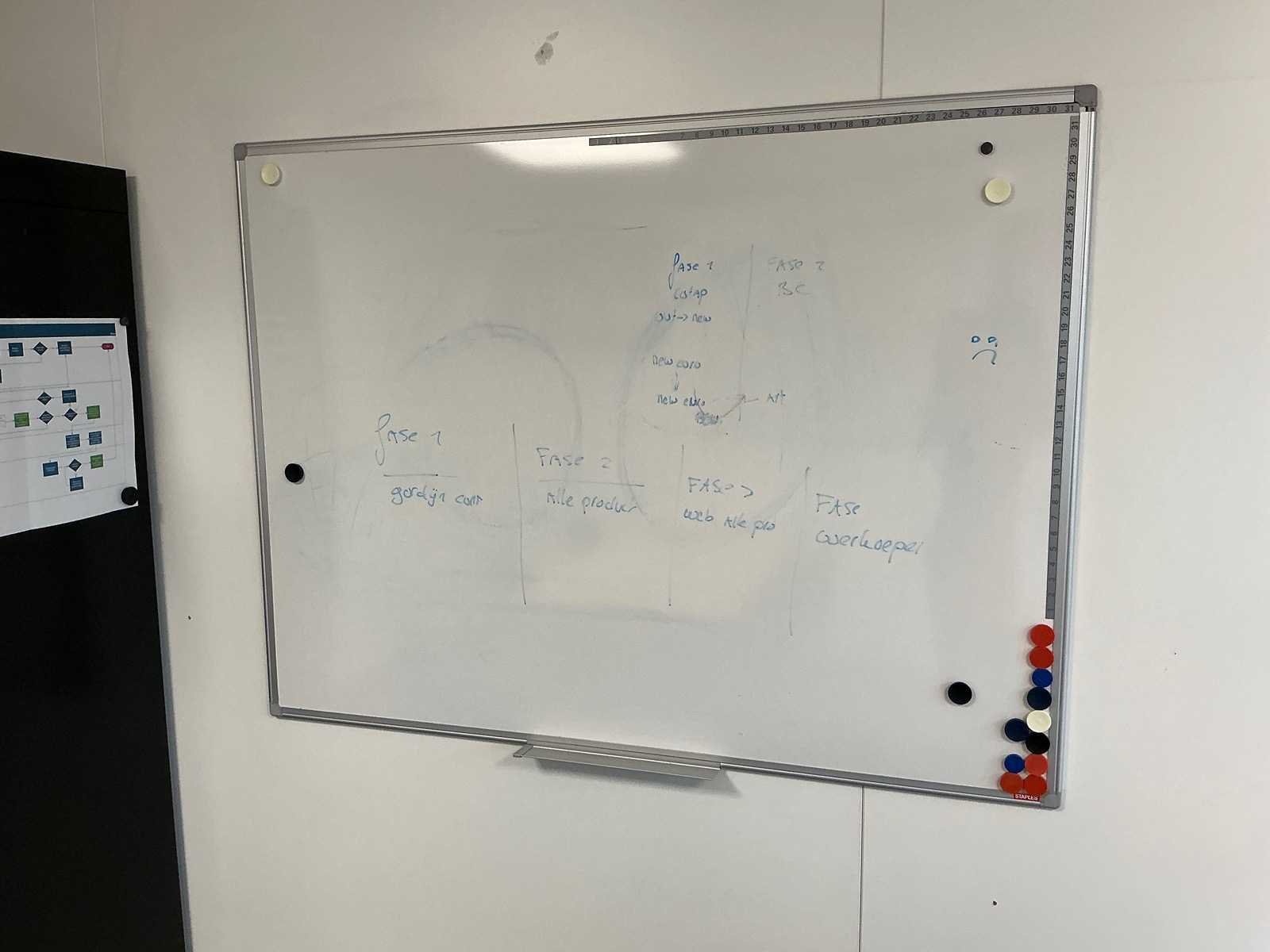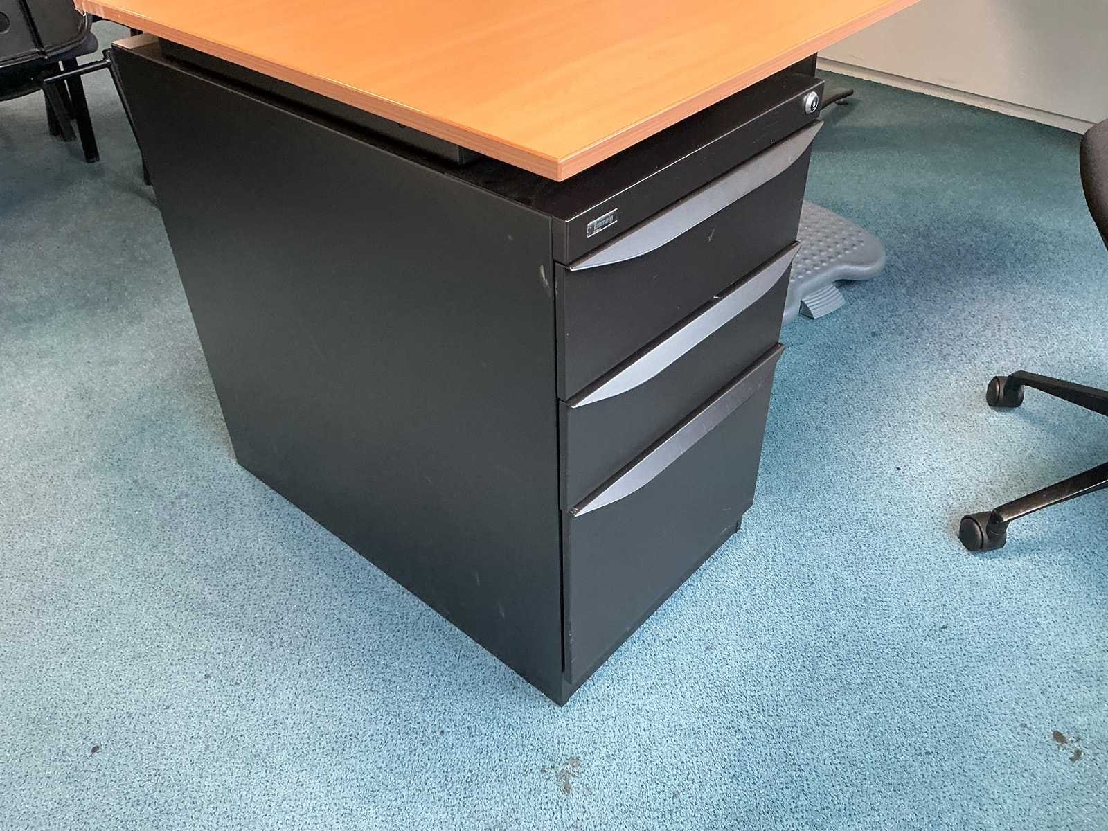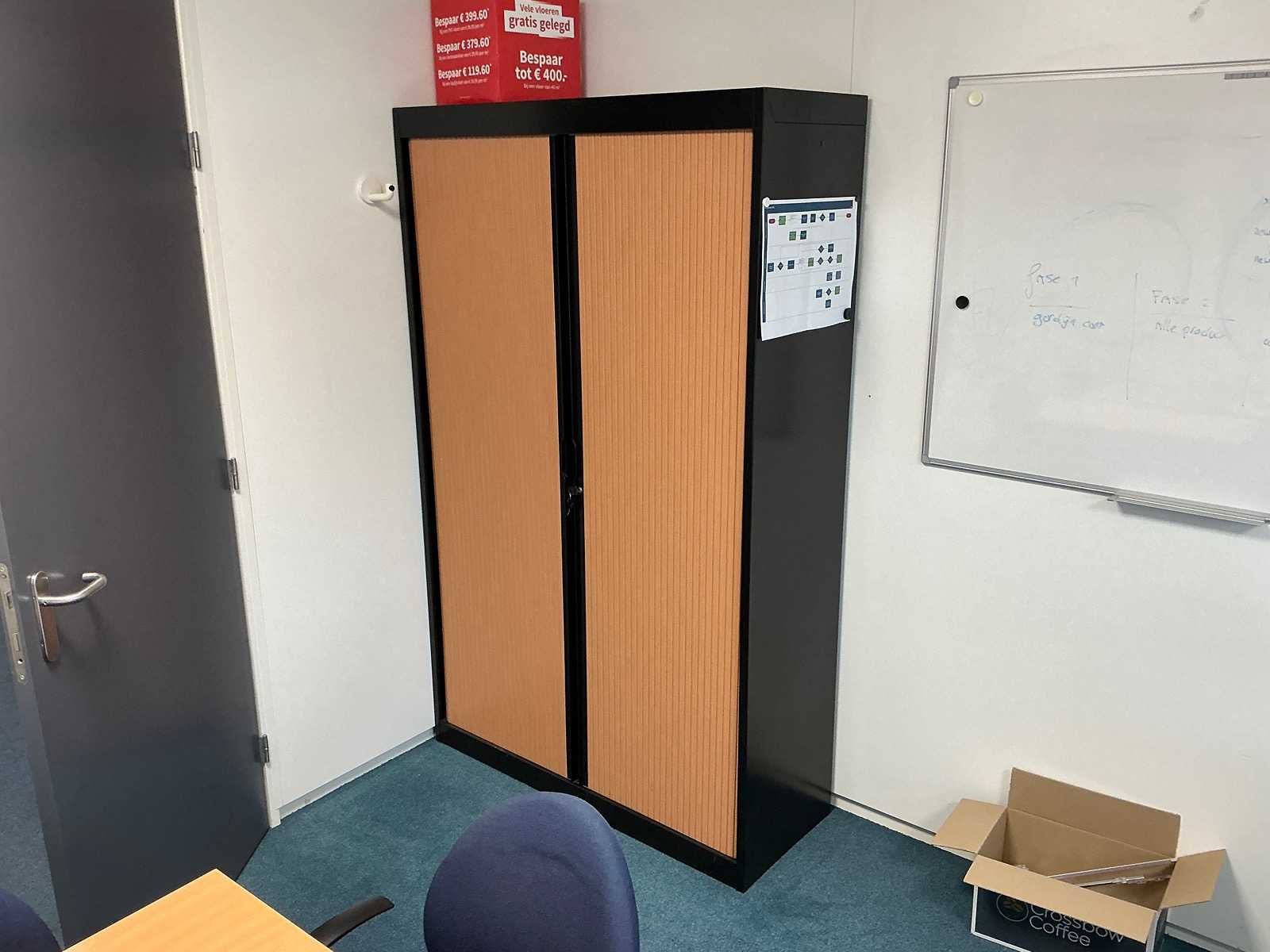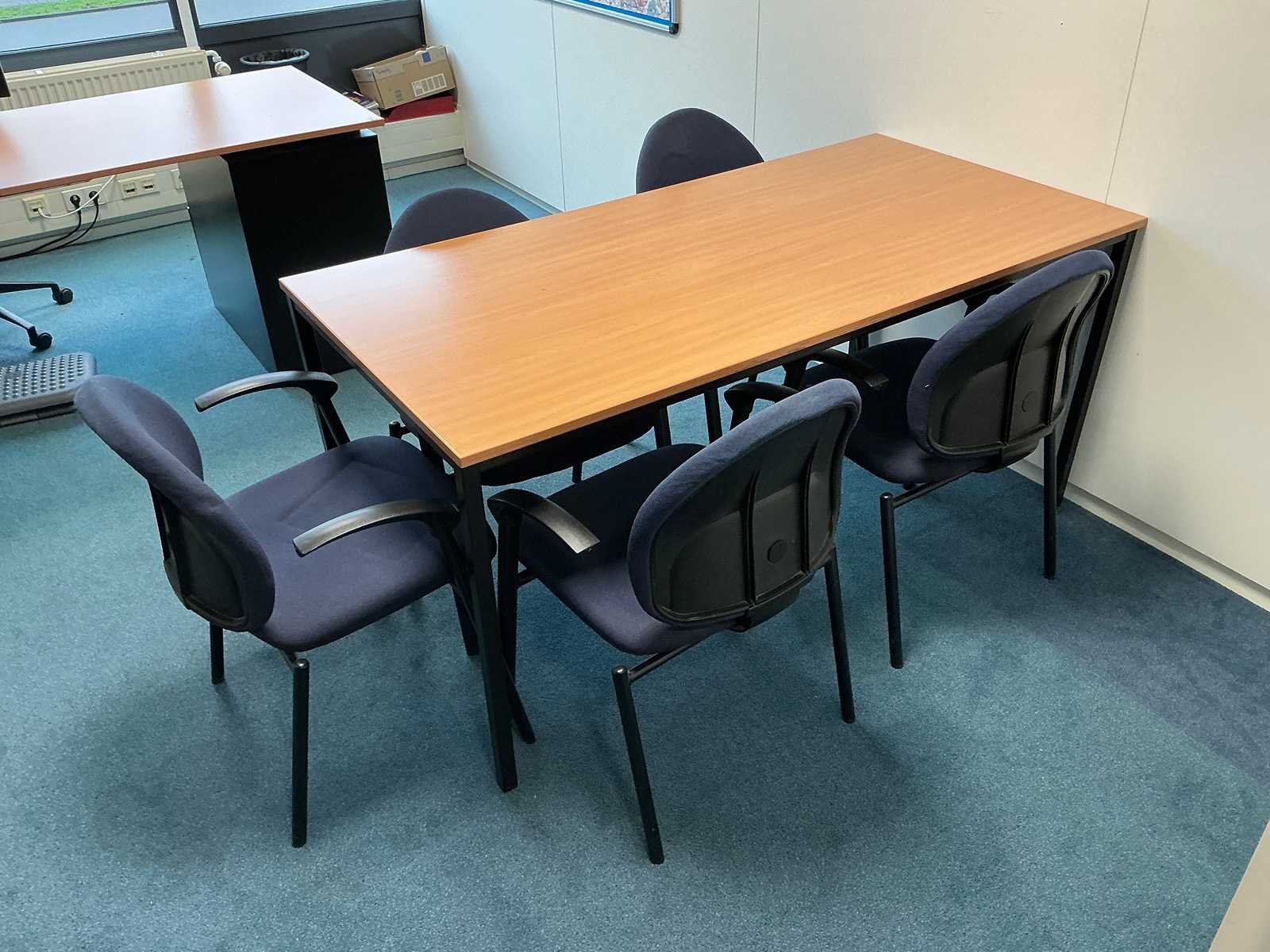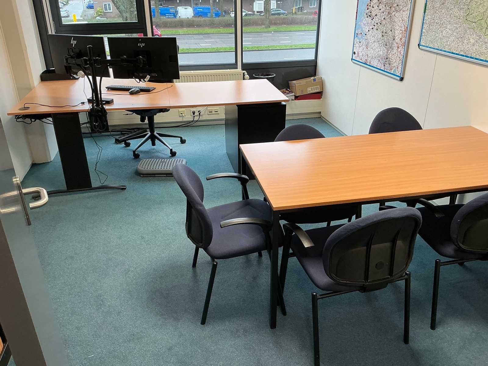 Bestaande uit 1x bureau 220x160x75 cm, 1x tafel 160x80x75 cm, 1 bureaustoel, 5 kantoorstoelen, 1 dossierkast, 2 route kaarten, ladeblok en 1 whiteboard. Computers, monitoren en andere apparatuur niet meegeleverd.