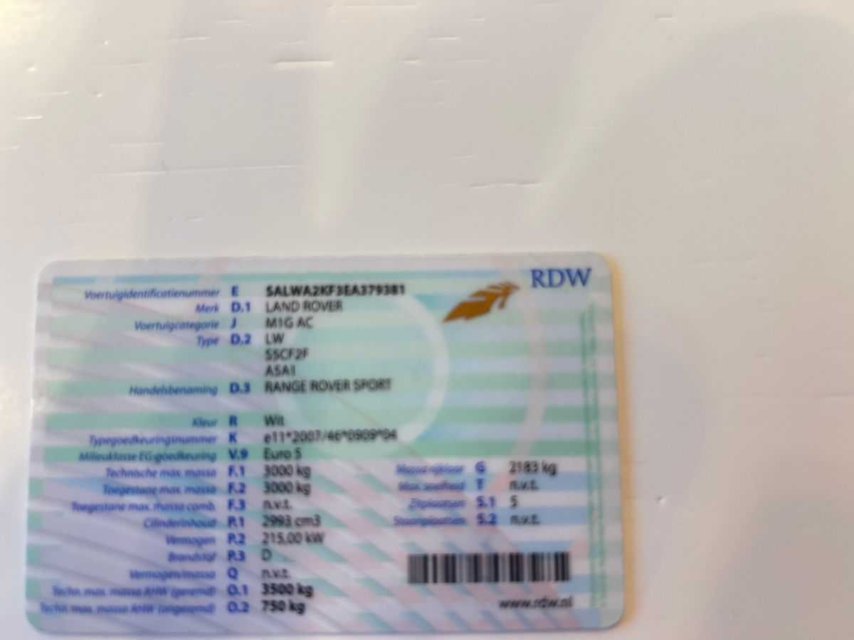 Voertuig- en merkspecifieke opties (AutoVIN) 5-wegs stoelverst Airco premium Bu-spiegel dimmend Bu-spiegel dubb verw Bu-spiegel el inklap Keyless entry Portierruit gelaagd Spiegel met licht Stoelen v geklimatis Stoelverst elektr Zijruit veiligh glas Zit-helling stoel v 2-lagen uni 2993ccm 215kw 8-versn automaat Achterklep elektr Achteruitrij camera Afdek dorpel verl Audiosysteem premium Banden 275/40 r22 Bandendrukcontrole Bi-spiegel antiverbl Blindspot monitoring Cruise control Hoofdsteunen elektr koelbox Kopl-rein-inst Koplampen adaptief Lendensteun elektr Memory-schakeling mistlampen navigatiesysteem Onderstel adaptief Panoramadak elektr Parkeerhulp v Rij-informatiesyst Sperdifferentieel standverwarming Stuurkolom verstelb Supervergrendeling Systeem start & stop Traction control Transm schak stuurw Uitlaatgasnorm euro5 Uitvoering ged leer Va vin ea364210 Velgen 9.5 j x 22 lm Verlicht bi-ruimte voorruit verwarmbaar Kenteken: 9-XDJ-18 Merk: Land Rover Model: Range Rover Sport Type: 3.0 SDV6 Autobiography Dynamic Bouwjaar: 2014 Afgelezen kilometerstand: 85000km Cilinderinhoud: 2993cc Vermogen (kW): 215kW Brandstof: Diesel Chassisnummer: SALWA2KF3EA379381 NAP status: Logisch Datum eerste toelating: 2014-07-15 Datum eerste toelating (NL): 2014-07-15 APK vervaldatum: 2026-05-03 Vermogen (pk): 288hp Aandrijving: AWD Aantal zitplaatsen: 5 Maximaal trekgewicht ongeremd: 750kg Maximaal trekgewicht geremd: 3500kg Kleur: wit Transmissie: Automaat Emissieklasse: 5 Aantal deuren: 5 Aantal sleutels: 1 Ledig gewicht: 2083kg Bruto BPM (NL): 26175€ Aantal cilinders: 6 Carrosserie: SUV Nationaliteit documenten: Nederlands Onderhoudshistorie: Aanwezig danwel digitaal Carfax Link: https://was.carfax.eu/v0/api/ccdid/5100016408/svc/201/vinreg/9XDJ18/checksum/eyJhbGciOiJIUzI1NiIsInR5cCI6IkpXVCJ9.eyJleHAiOjE3NzY3Nzc1NjJ9.jxnZZMteOdcpTeQz76rgDjDXYR9erHa1NrBPIBJiF6c Start en rijdt: Start and drive startinformatie : Start en rijdt Self drive export possible : true Airconditioning: true Navigatie: true LED-koplampen: false Vierwielaandrijving 4x4: true