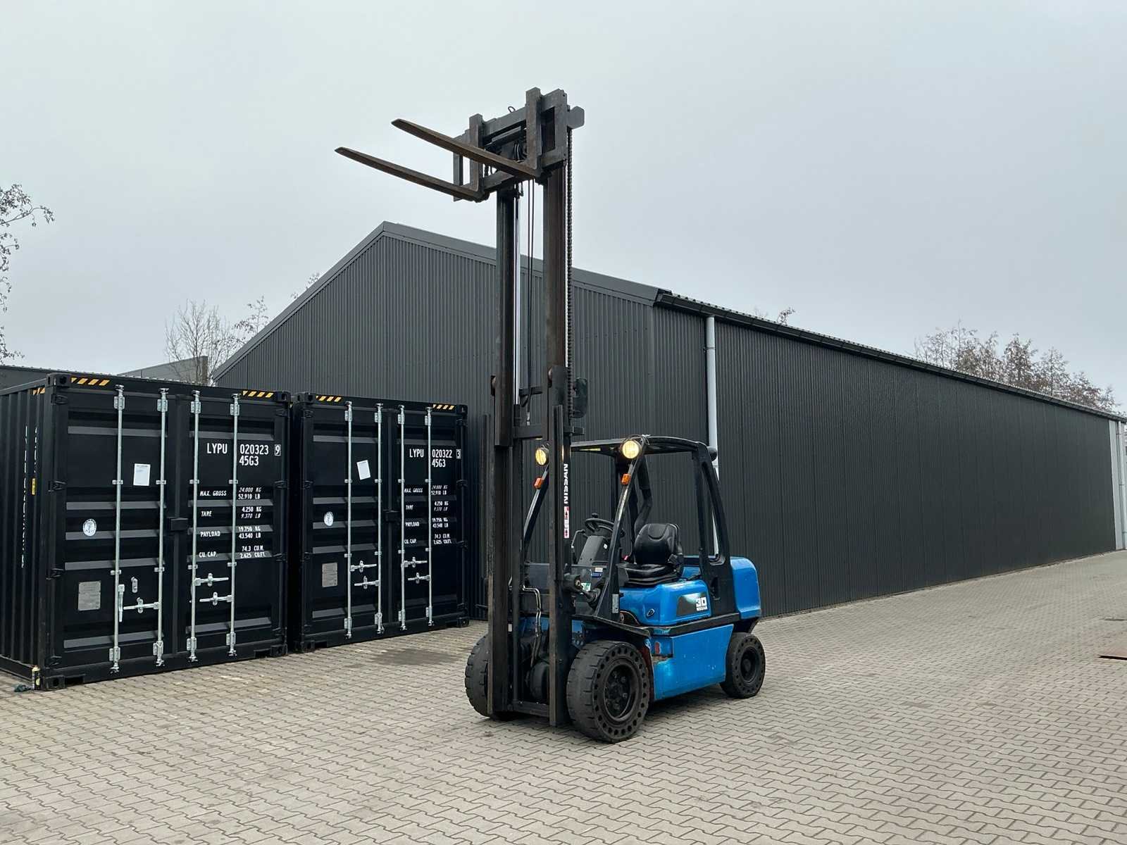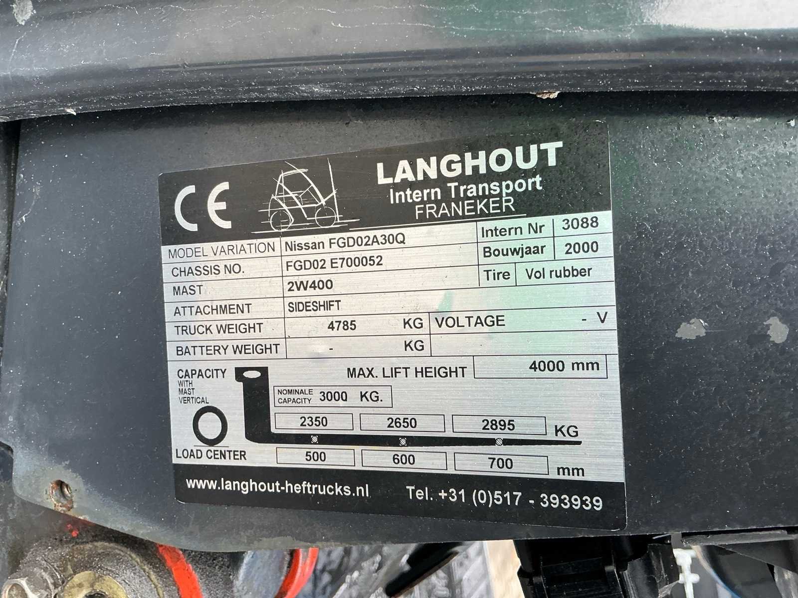 Merk: Nissan Type: FGD02 / FGD02A30Q Bouwjaar: 2000 Serienummer: FGD02E700052 Brandstof: Diesel Side-shift: true Eigen gewicht: 4785kg Hefvermogen: 3000kg Max. hefhoogte: 4000mm Vol rubber banden: true Diesel: true