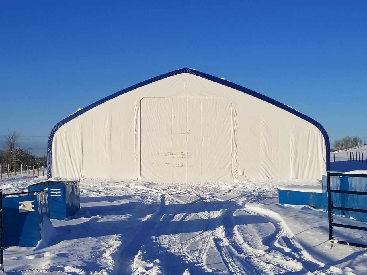 Opslagshelter, voorzien van dubbel trussen-/buizensysteem; gegalvaniseerd; ruimte tussen bogen: 3050 mm; afmeting gording: Φ 60x1,8 mm; oprolbare deur met lier, afmeting: 5,49x4,89 meter; materiaal 610 gram PVC; kleur wit; inclusief montage handleiding; ongebruikt in metalen kisten Merk: Field Industries Type: 6015025DP Bouwjaar: 2025 Totale afmeting L: 18300mm Totale afmeting Breedte: 45750mm Totale afmeting Hoogte: 7625mm