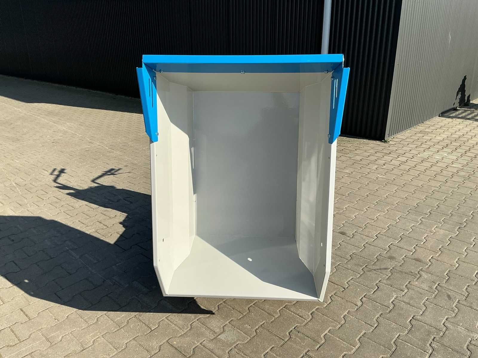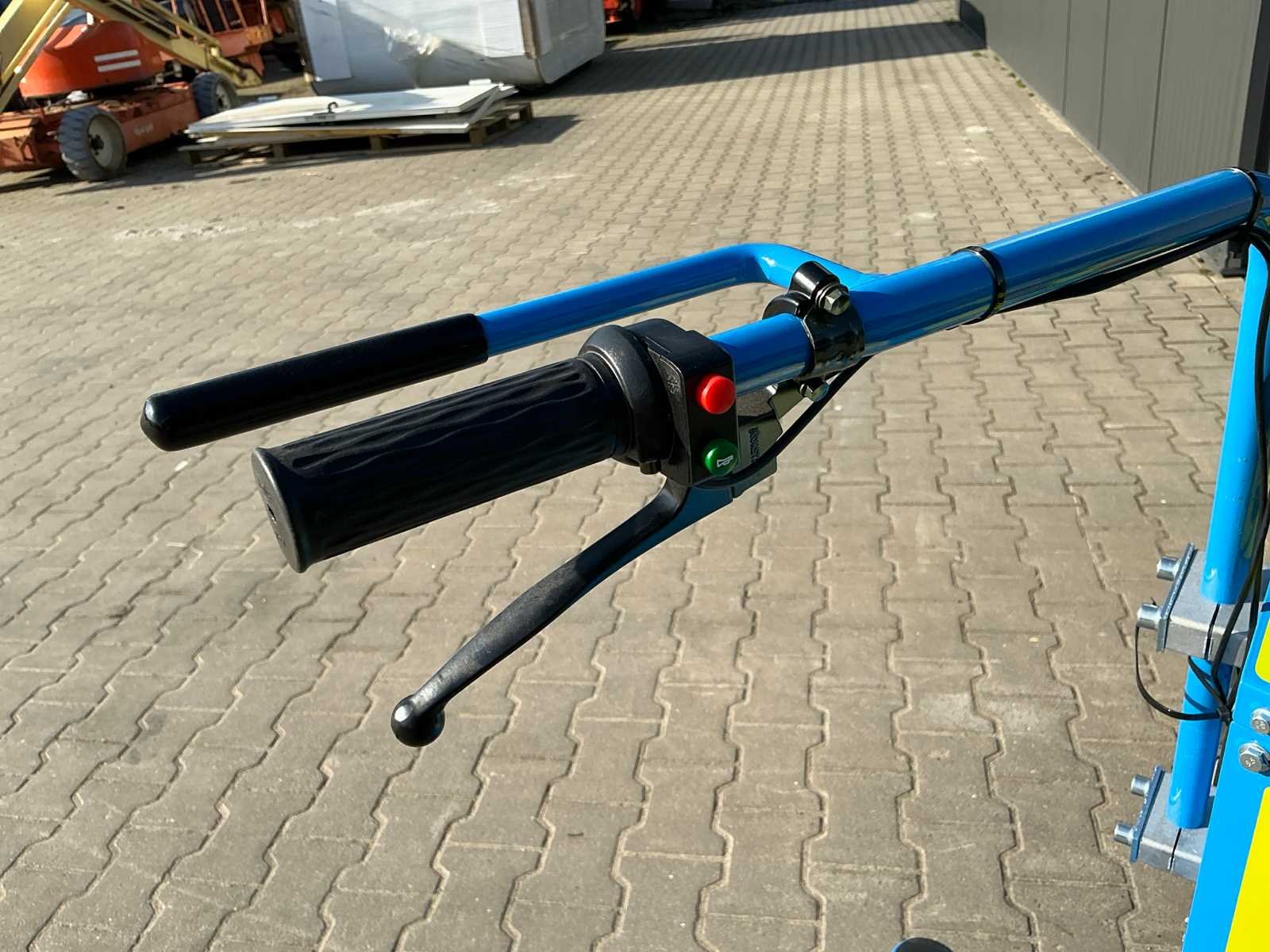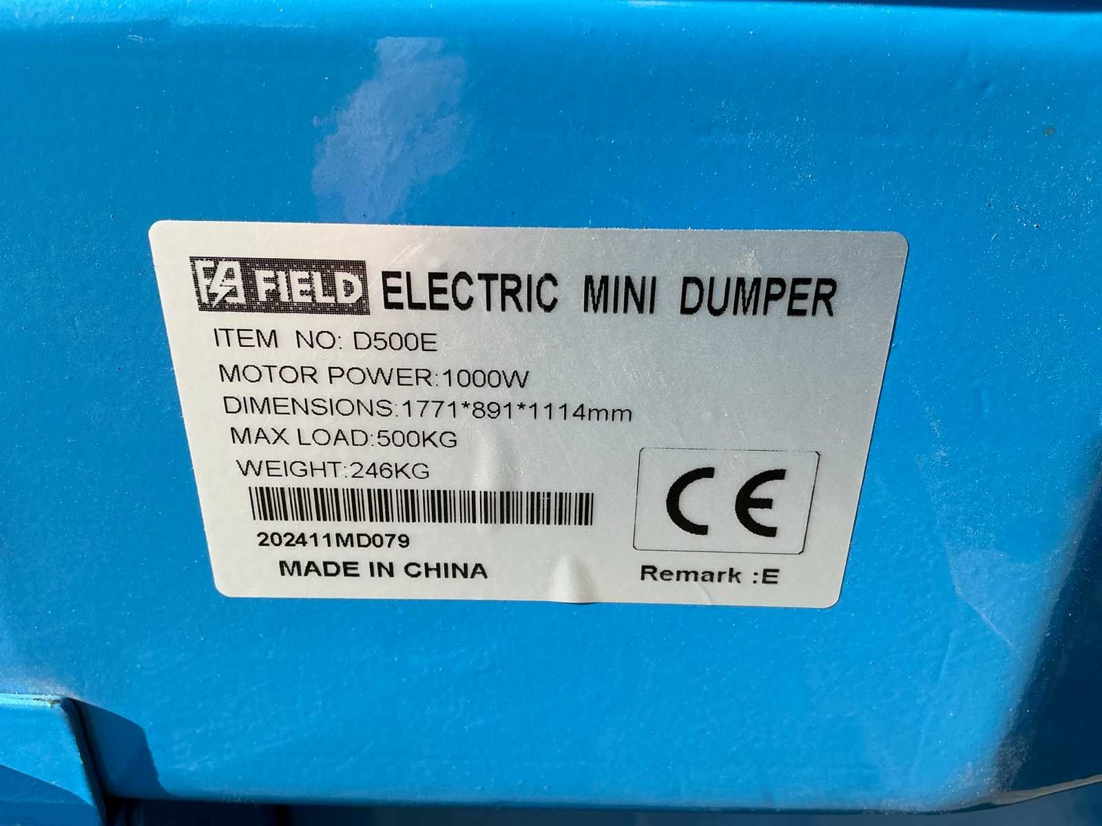 Elektrisch aangedreven, zelfrijdend, voorzien van hydraulische kiepfunctie, 3 rijsnelheden, LED werkverlichting, digitaal display, autonomie 8-10 werkuren, ongebruikt in krat Merk: Field Type: D500E Laadvermogen: 500kg Eigen gewicht: 300kg Totale afmeting L: 1771mm Totale afmeting Breedte: 891mm Totale afmeting Hoogte: 1114mm
