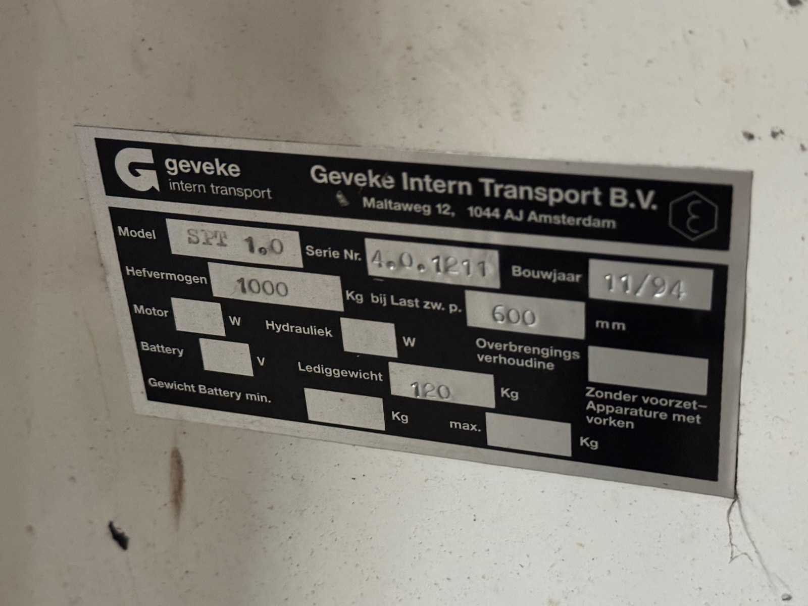 Merk: Geveke Type: SPT1.0 Hefvermogen: 1000kg