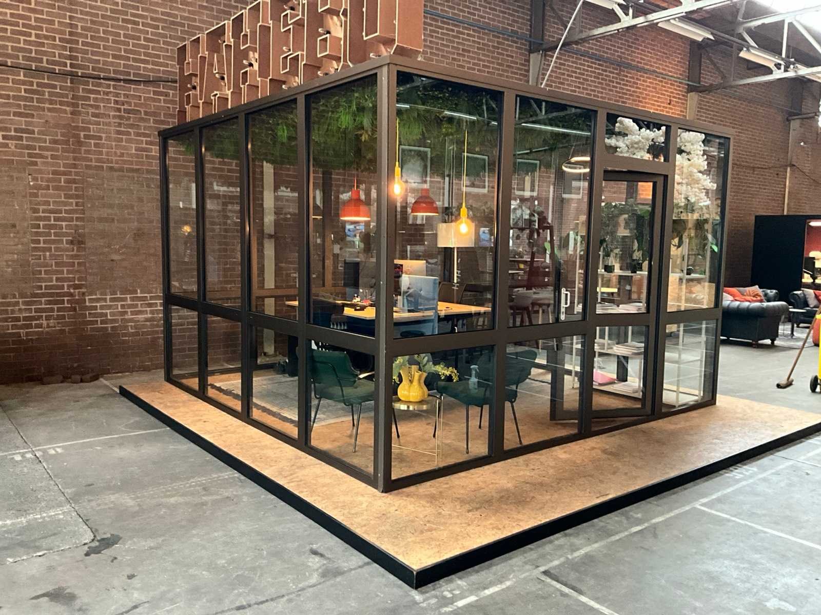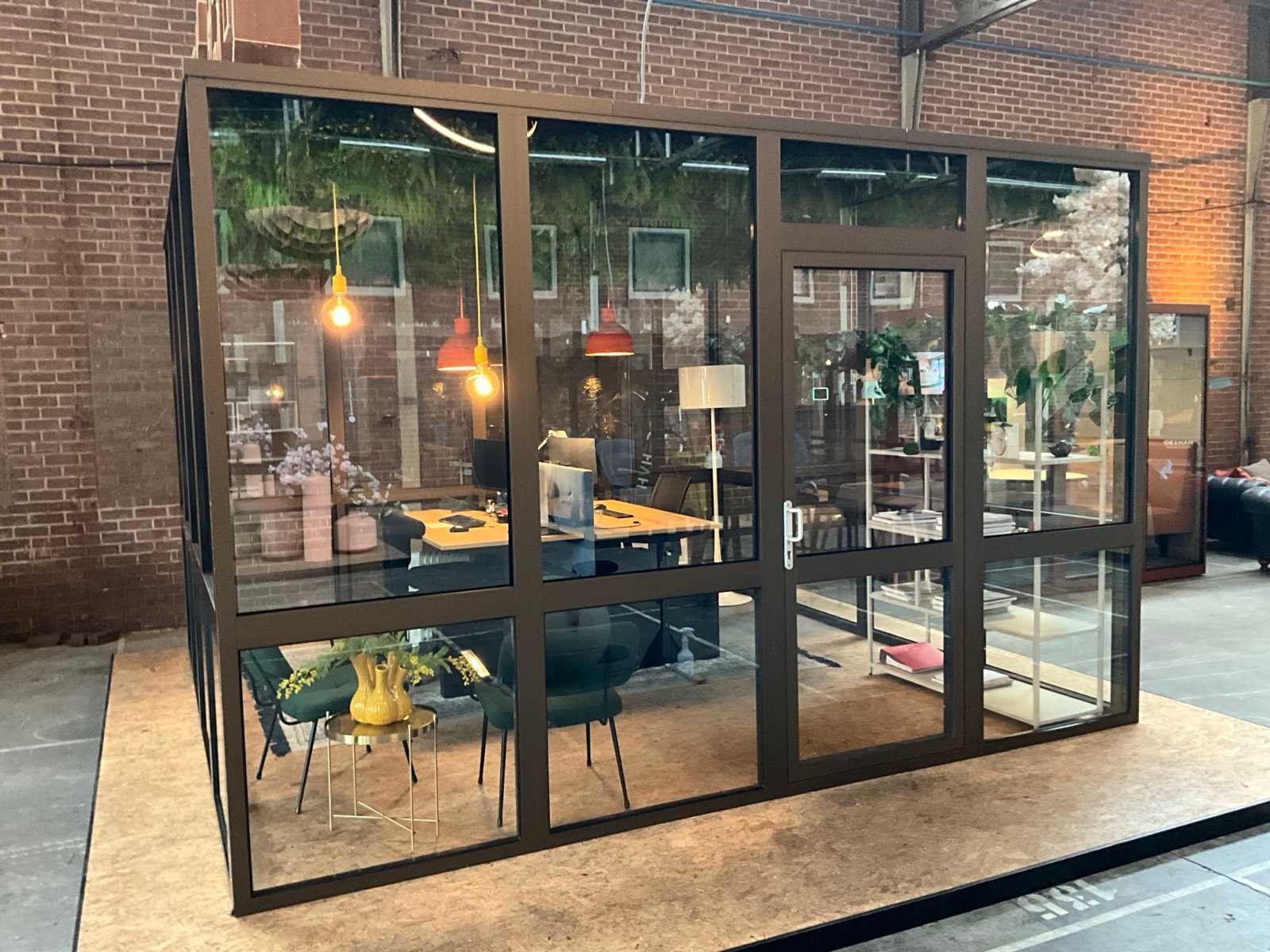 Demontabele kantoor- vergaderunit 400x400x260cm v.v. toshiba rasb13 airco-unit, muuto verlichting