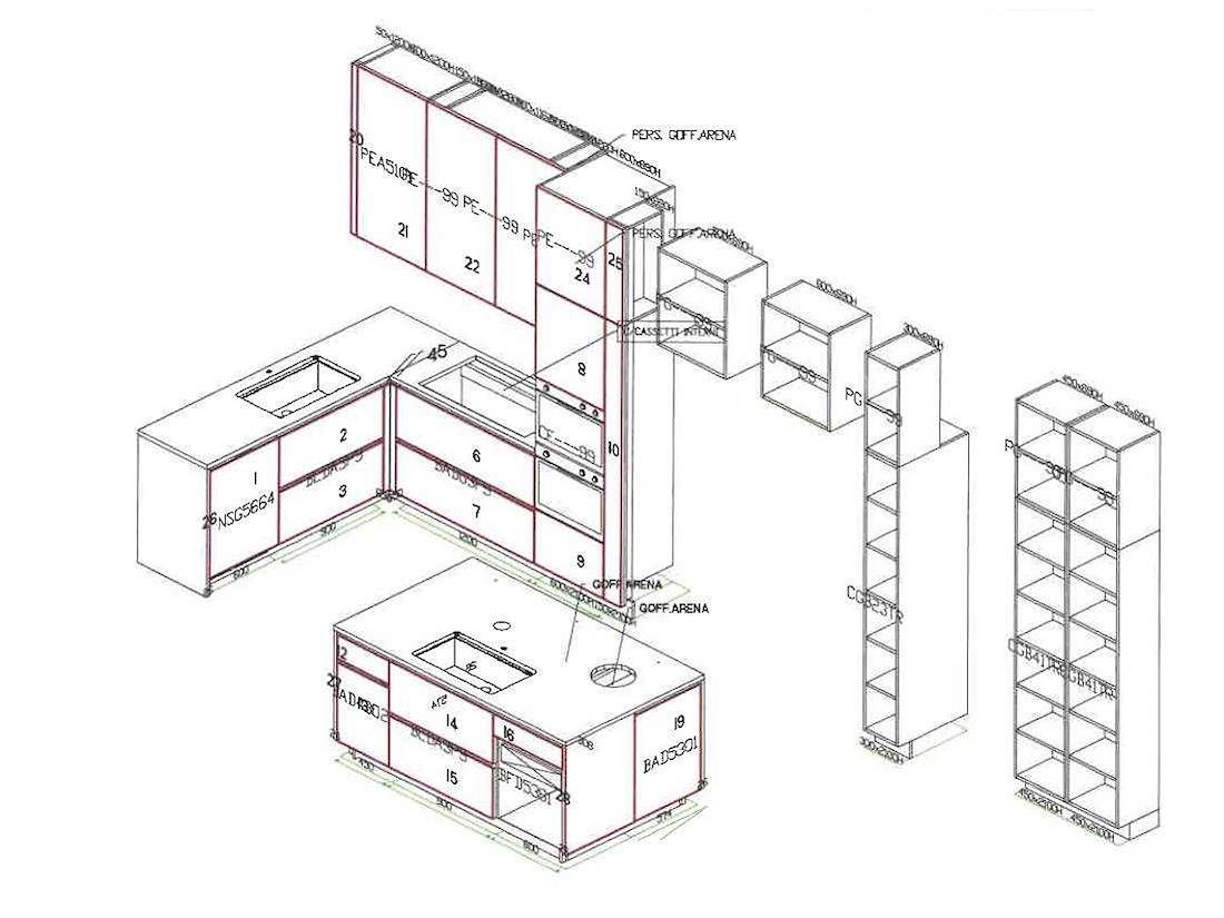 Tekeningen zijn toegevoegd in de bijlage. Indicatie van de kleur keukenblad en kasten, zie foto’s. Interieur staat transportklaar op pallets Merk: Poliform Spa Model: Artex