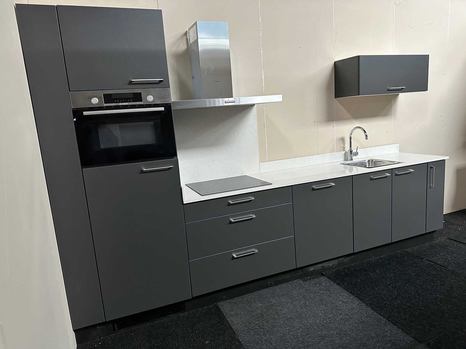 Foto ter illustratie, opstelling kan afwijken Voor juiste opstelling: zie foto 27 Onderbouw Laag (2x 90cm, 1x60 en 1x25cm) Onderbouw Hoog (1x60cm) Hoge kast Bovenbouw (1x 90cm) Kleur van de grepen wijkt af van de hoofdfoto. Betreft Grafiet mat v.v. composiet spatscherm, passtuk, bestekindeling, gootsteen inlegbodem, plint 5533040/120 Merk: Bribus keuken Type keukenopstelling: Recht Breedte: 304cm Kraan: Ja Aanrechtblad: 268x60 Fornuis: Bosch PIE611BB1E Koelkast: Bosch KIL20NSF0 v.v. vriesvak Softclose: true Oven: Bosch TF944E4XS combi Afzuigkap: Bosch DWB96BC50 Vaatwasser: Bosch SMV4HU800E Hoofdkleur: U1233 Grafiet