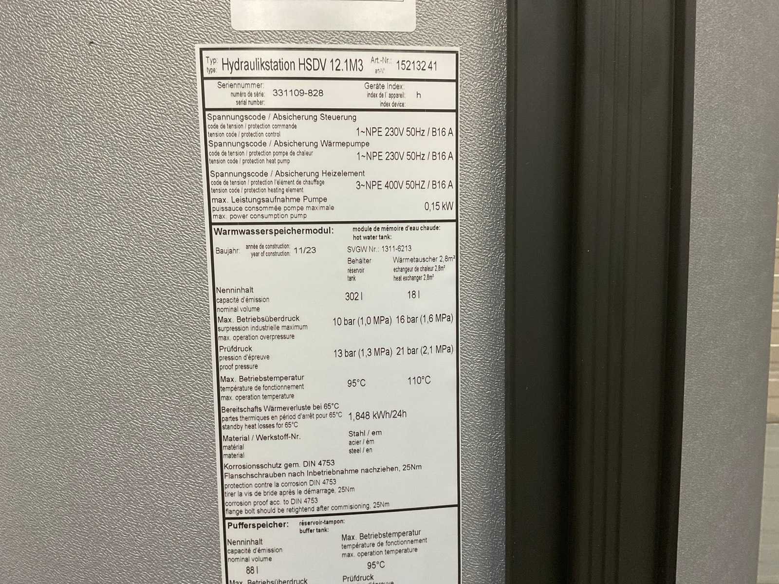 Voor een snellere installatie is het hydrauliekstation in de fabriek uitgerust met de volgende componenten: warmtepompregelaar Luxtronik 2.1 elektrisch verwarmingselement ter ondersteuning van de verwarming en warmtapwaterbereiding energiezuinige circulatiepomp expansievat veiligheidsmodule afsluitkranen overstortventiel omschakelklep voor warm tapwater geëmailleerd tapwater buffervat met een inhoud van 180 of 303 liter (netto-inhoud) CV buffervat van 62 of 90 liter Extra bij de leveringsomvang: buitentemperatuursensor 8m LIN buskabel 8m stuurkabel 8m voedingskabel Afmetingen transportpallet. (LxBxH) 112x80x210 cm Merk: Alpha Innotec Model: hydraulisch station Product type: HSDV 12.1 M3 Gewicht: 205kg Lengte: 100cm Breedte: 70cm Hoogte: 183cm